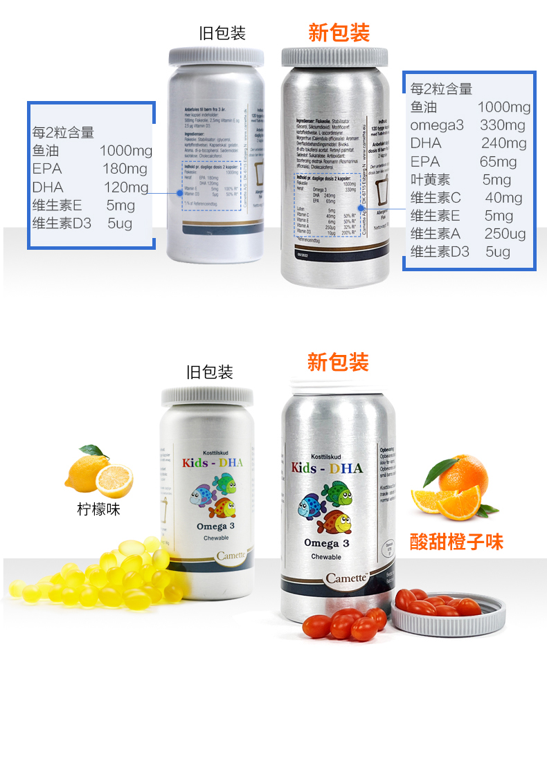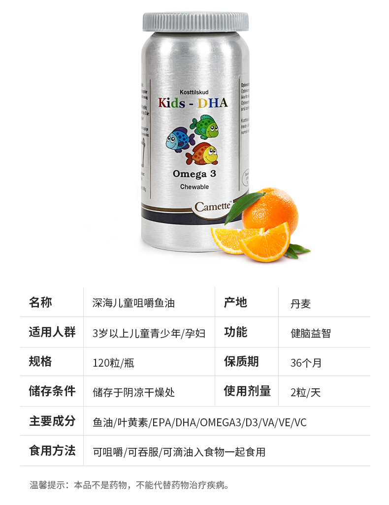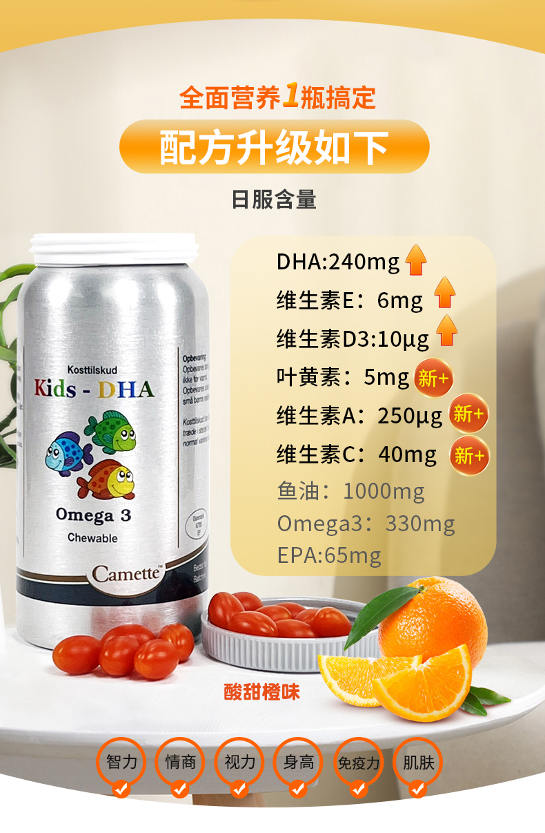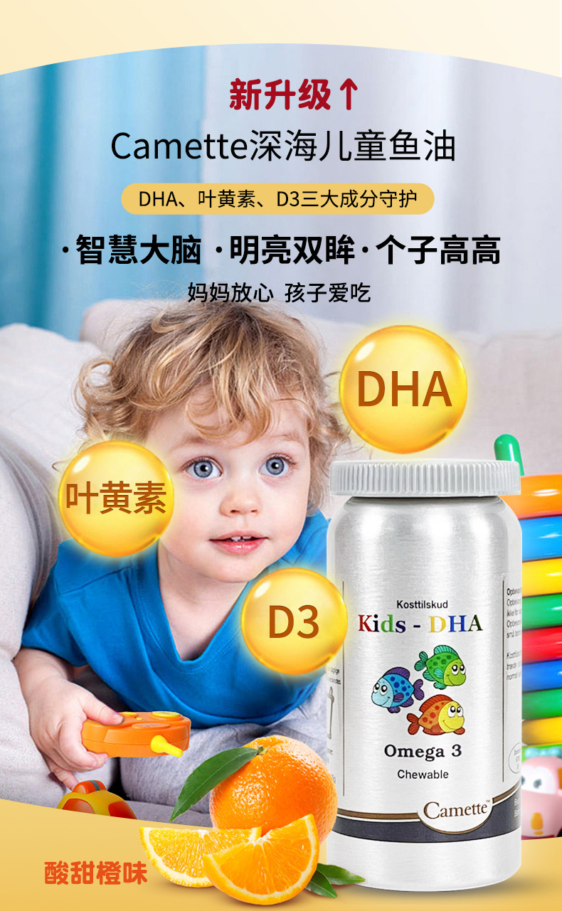 可咀嚼omega-3 · 丹麦Camette 新款儿童鱼油 儿童DHA含叶黄素 120粒|保税