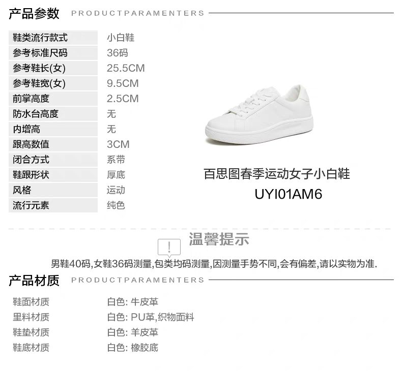 【百思图】BF楼百思图2026春季新款牛皮厚底小白鞋板鞋运动女休闲鞋UYI01AM6吊牌价858,现价339