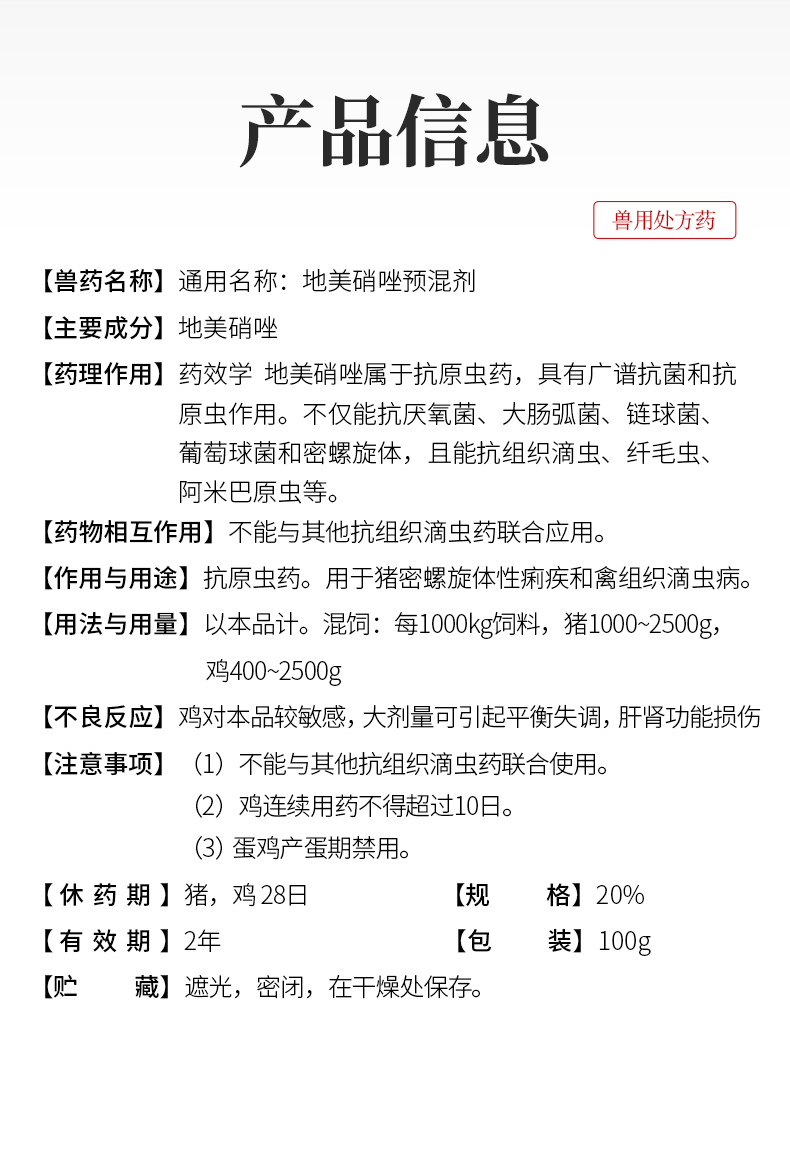 华畜20%地美硝唑 国标兽药 抗原虫药 毛滴虫回肠炎 厌氧菌密螺旋体痢疾拌料用