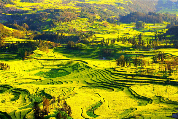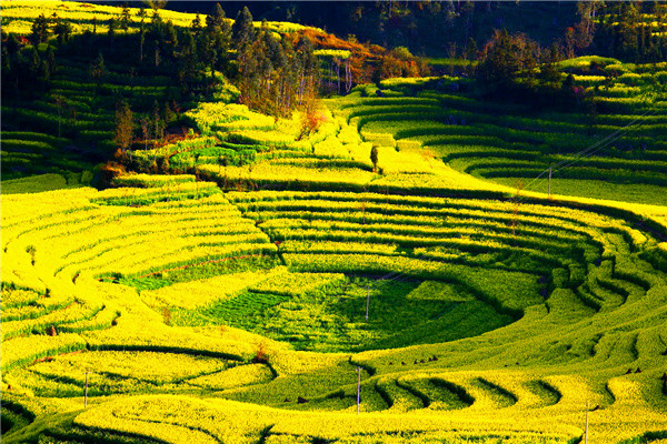 下午到【螺丝田】这个地方的梯田特别有特色,谷里开垦成一个个圈状的梯田开满了油菜花,那黄褐色的田埂一圈一圈的,就象是螺丝上的旋纹,特别棒。【金鸡峰油菜花田】体验世界最大的自然花园——20万油菜花海。傍晚时拍日落,晚上住金鸡峰油菜花旁,想玩到几点晚几点。