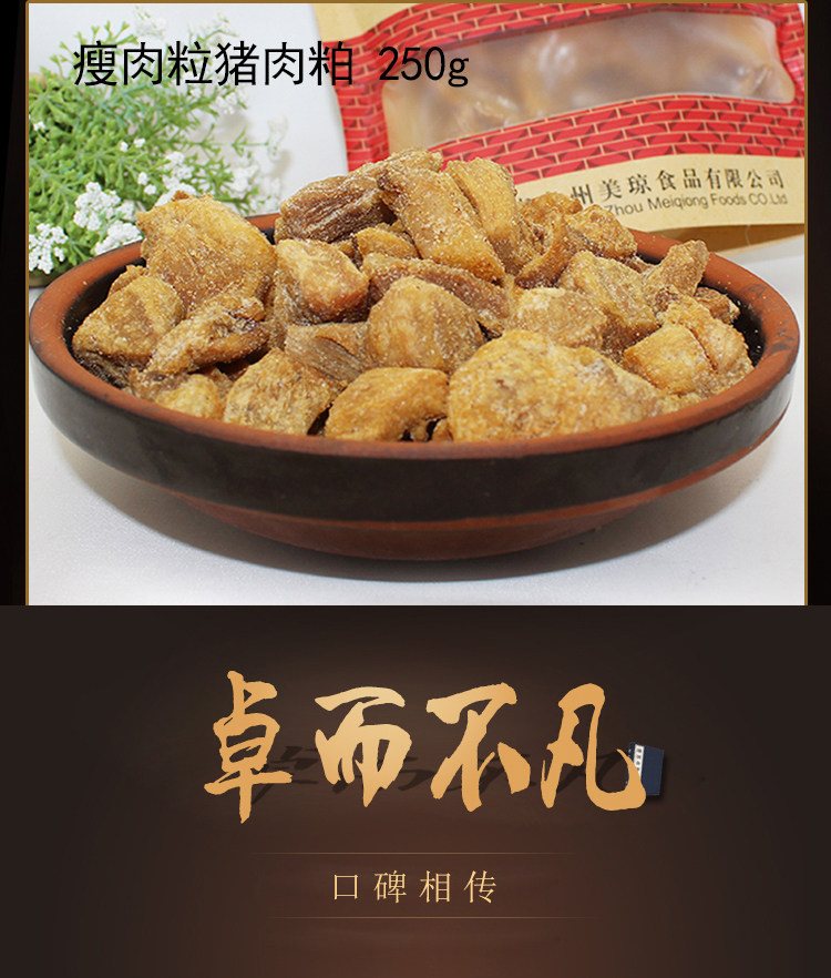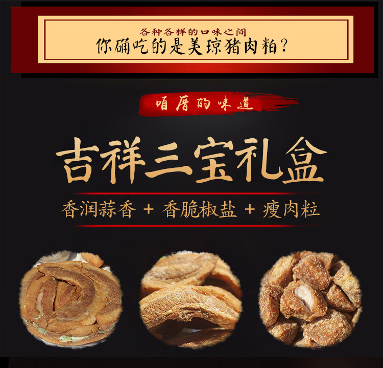 内含:蒜香肉粕250g,椒盐肉粕条200g,瘦肉粒250g。