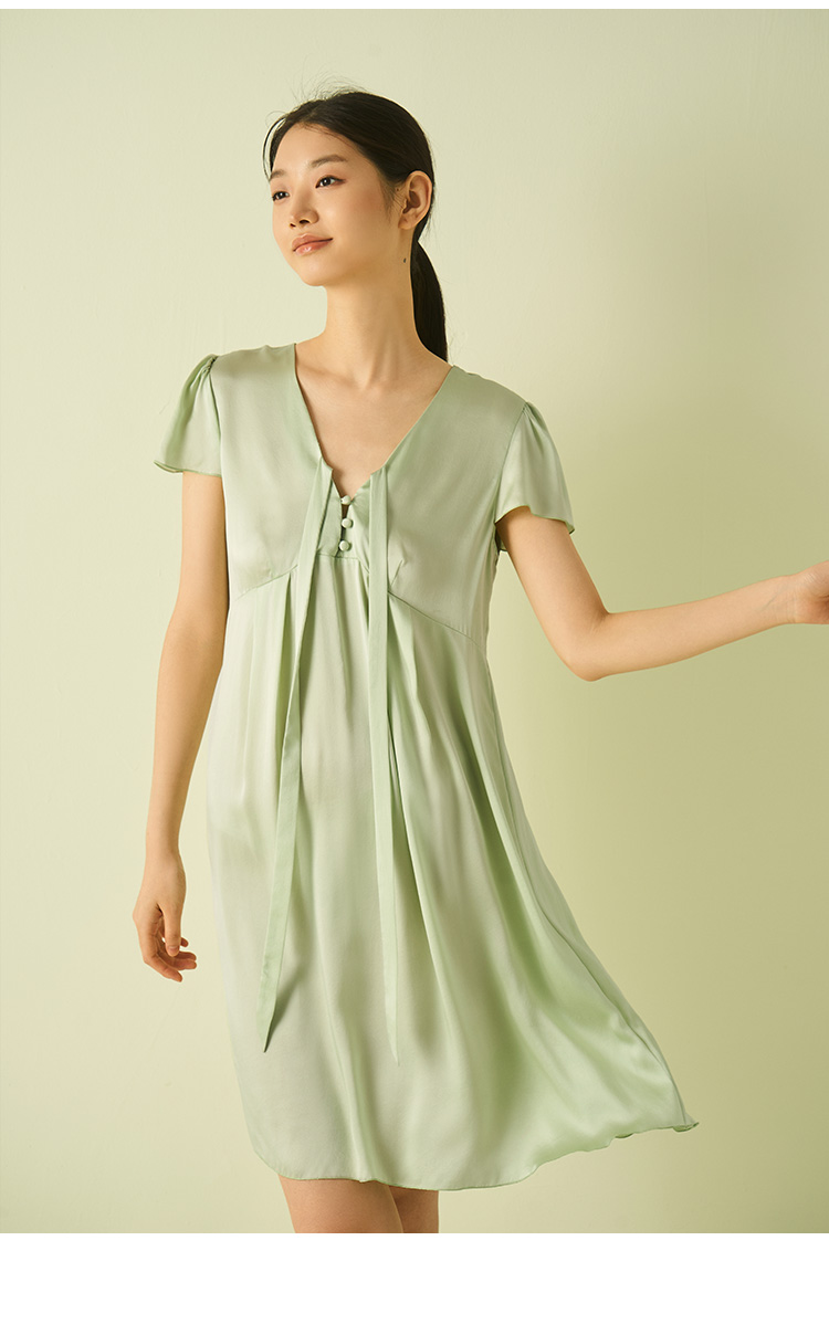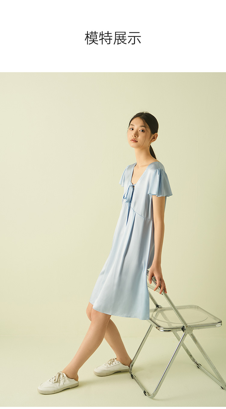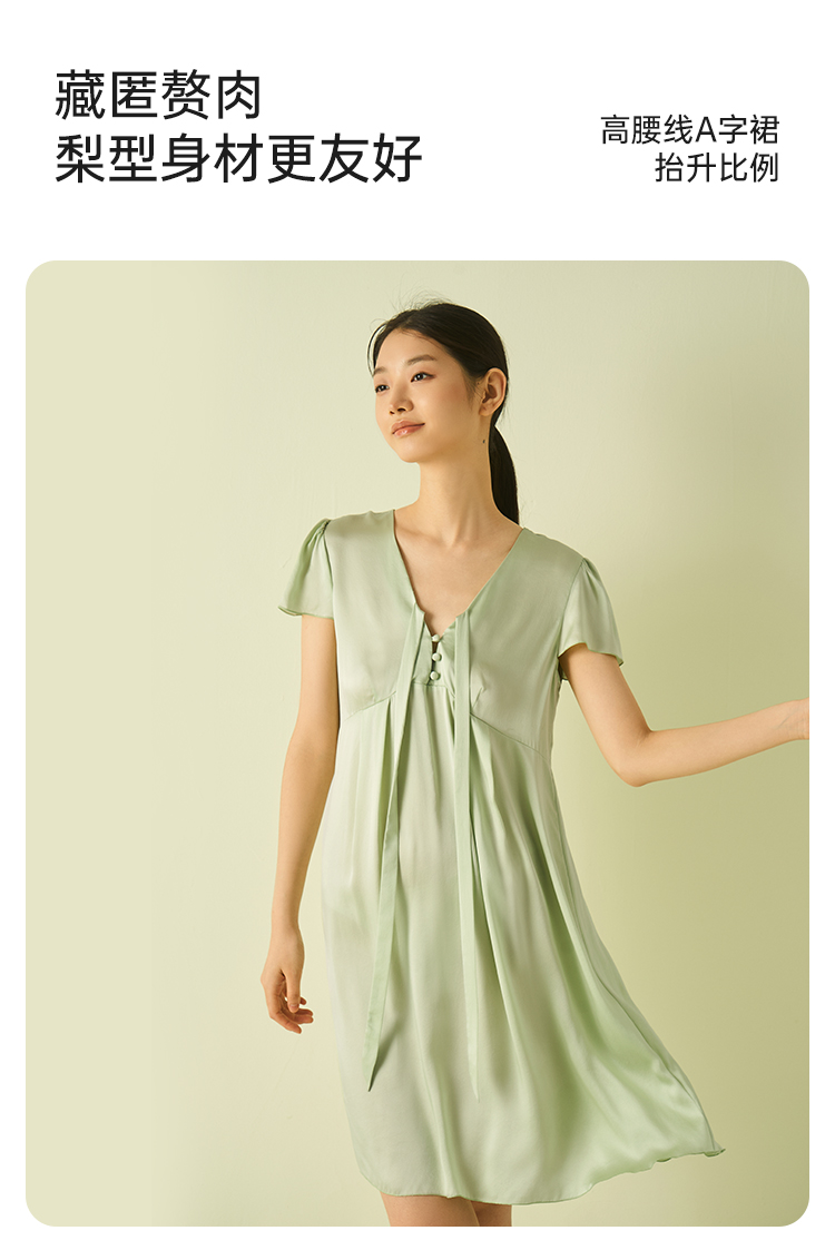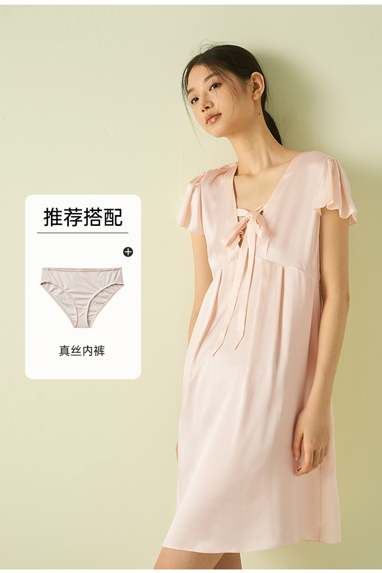 盈感系列』桑罗系带娃娃衫荷叶袖轻盈凉感桑蚕丝睡裙新品