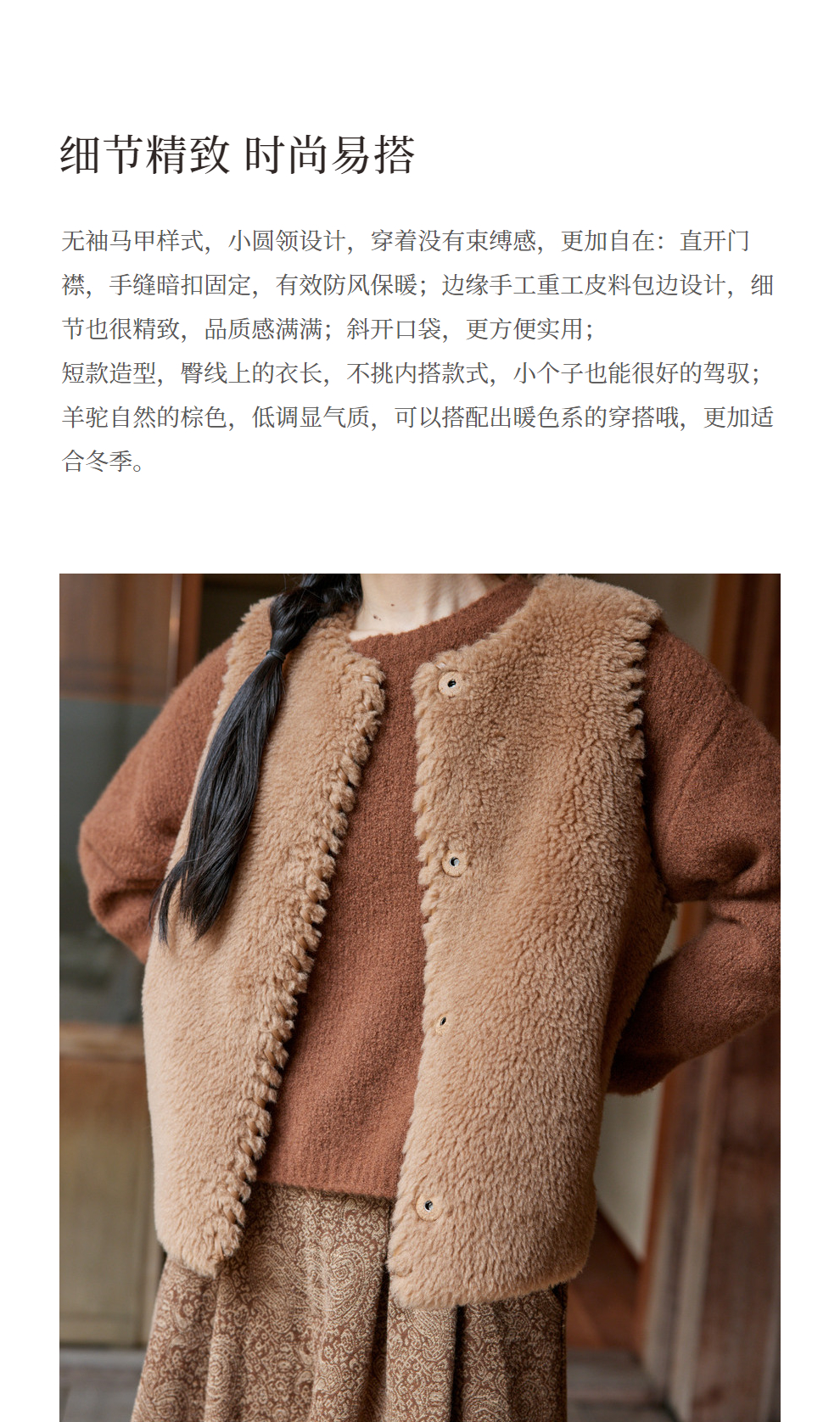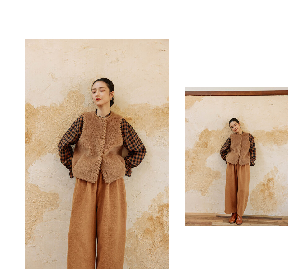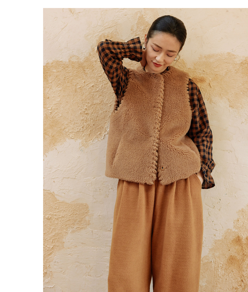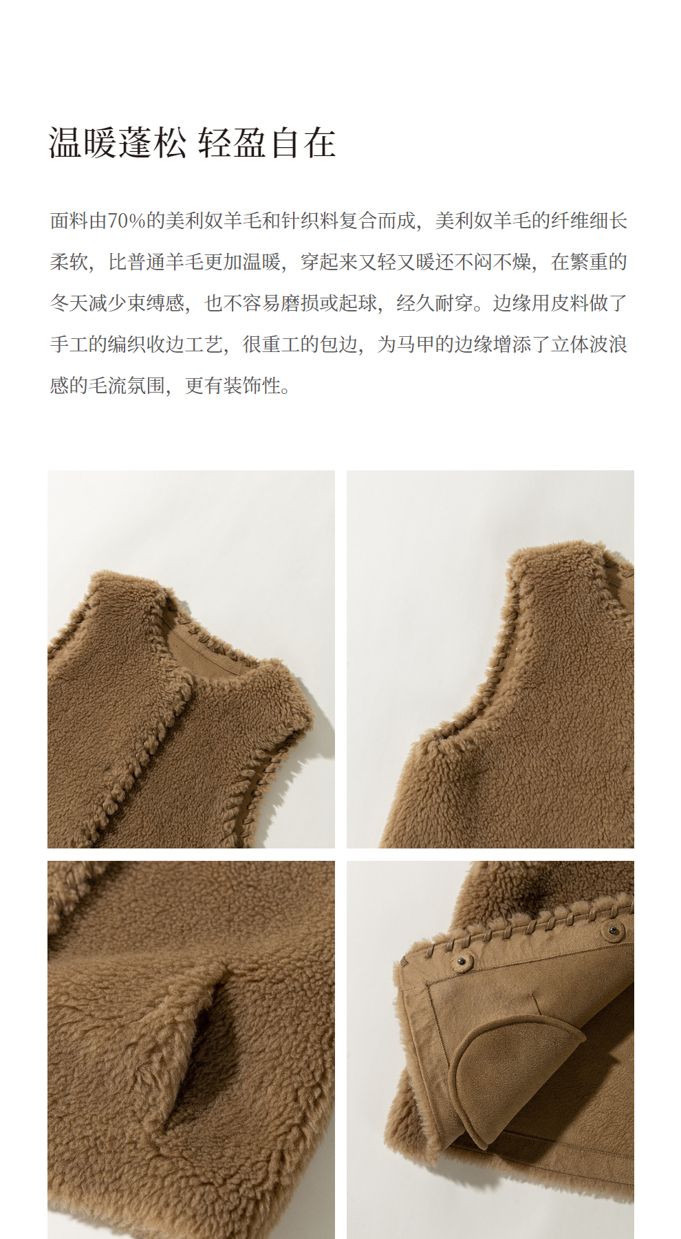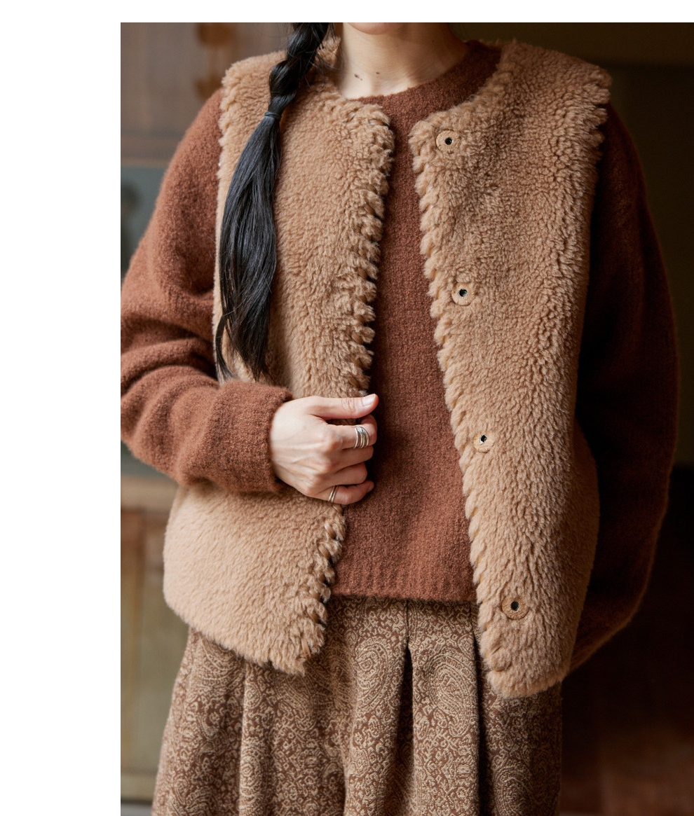 绽放810朵/高端棕色松软加厚绵羊绒防风保暖重手工包边无袖短马甲