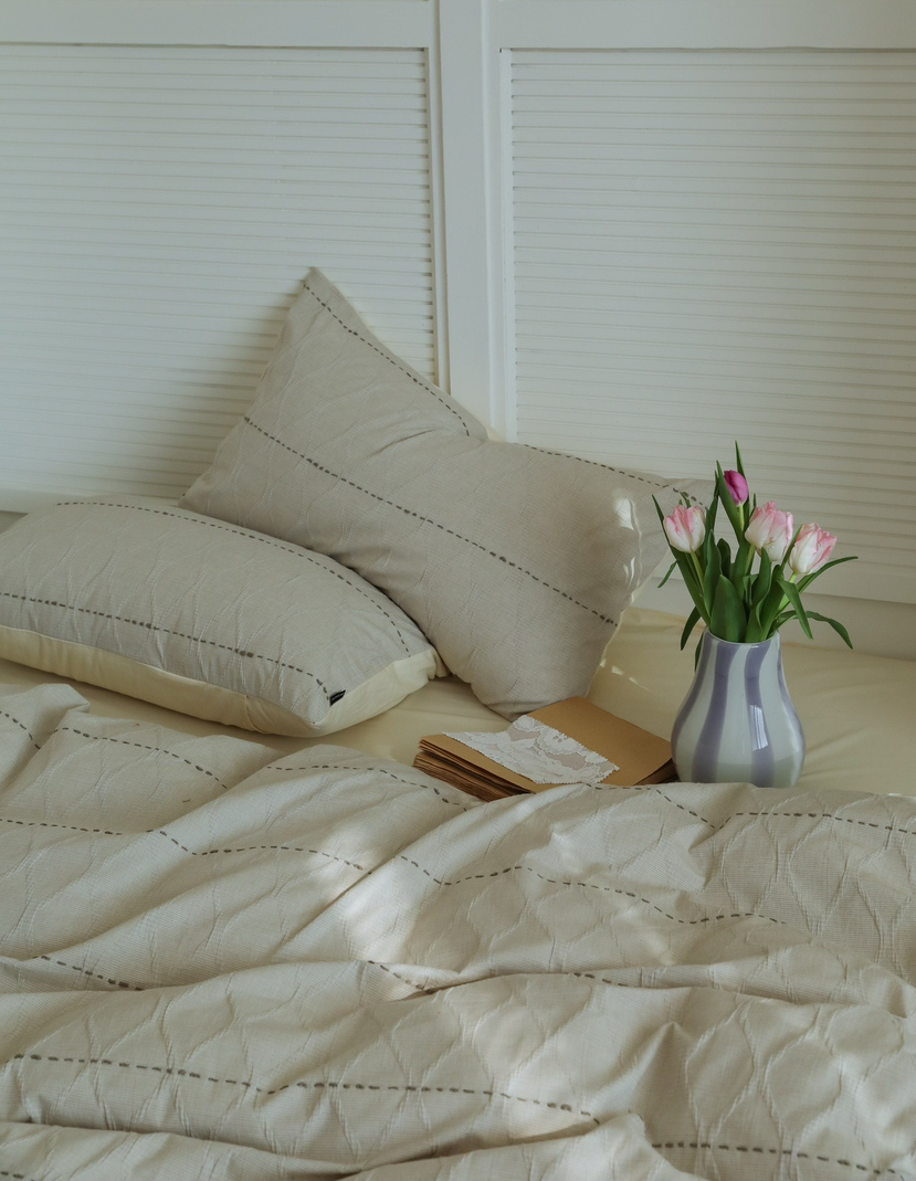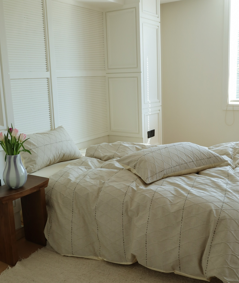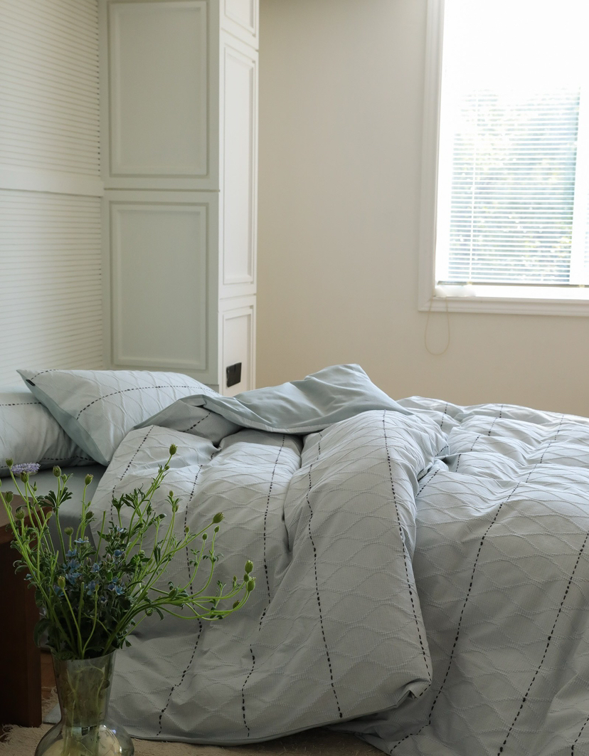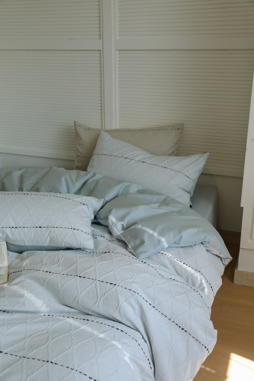工艺:手工改线条芝麻线剪花,(手工剪花大小不一,生动美观)色织肌理提花织造,特殊起皱工艺,形成凹凹凸凸漂亮肌理,经过水洗工艺处理,从而形成软绵绵的质感