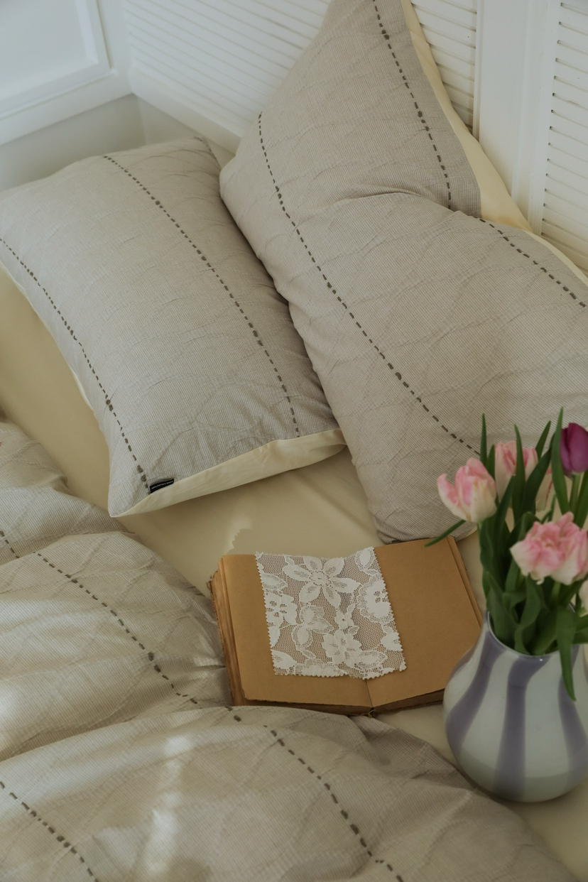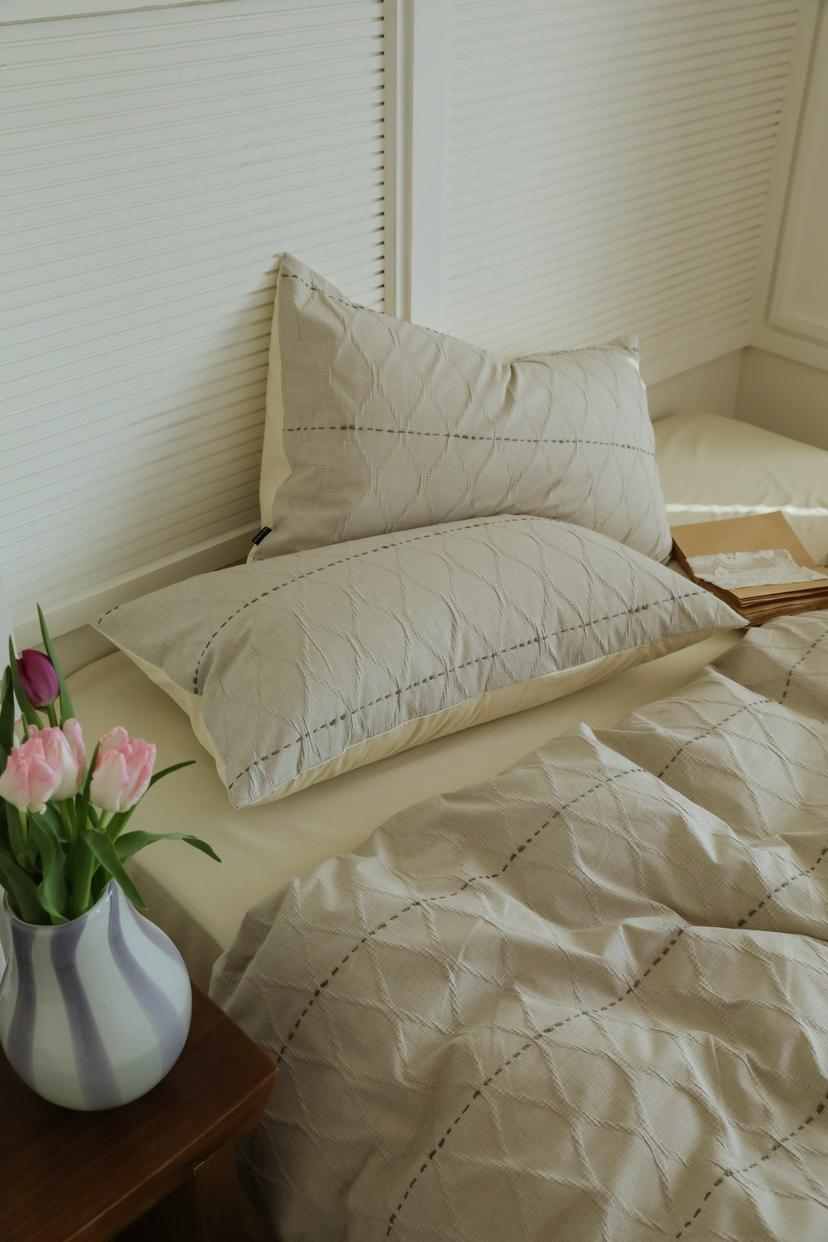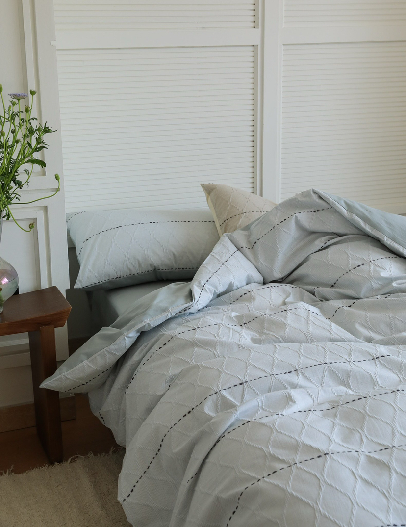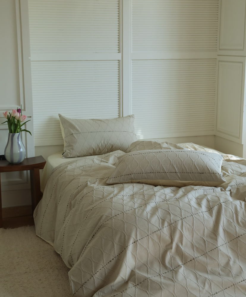 工艺:手工改线条芝麻线剪花,(手工剪花大小不一,生动美观)色织肌理提花织造,特殊起皱工艺,形成凹凹凸凸漂亮肌理,经过水洗工艺处理,从而形成软绵绵的质感