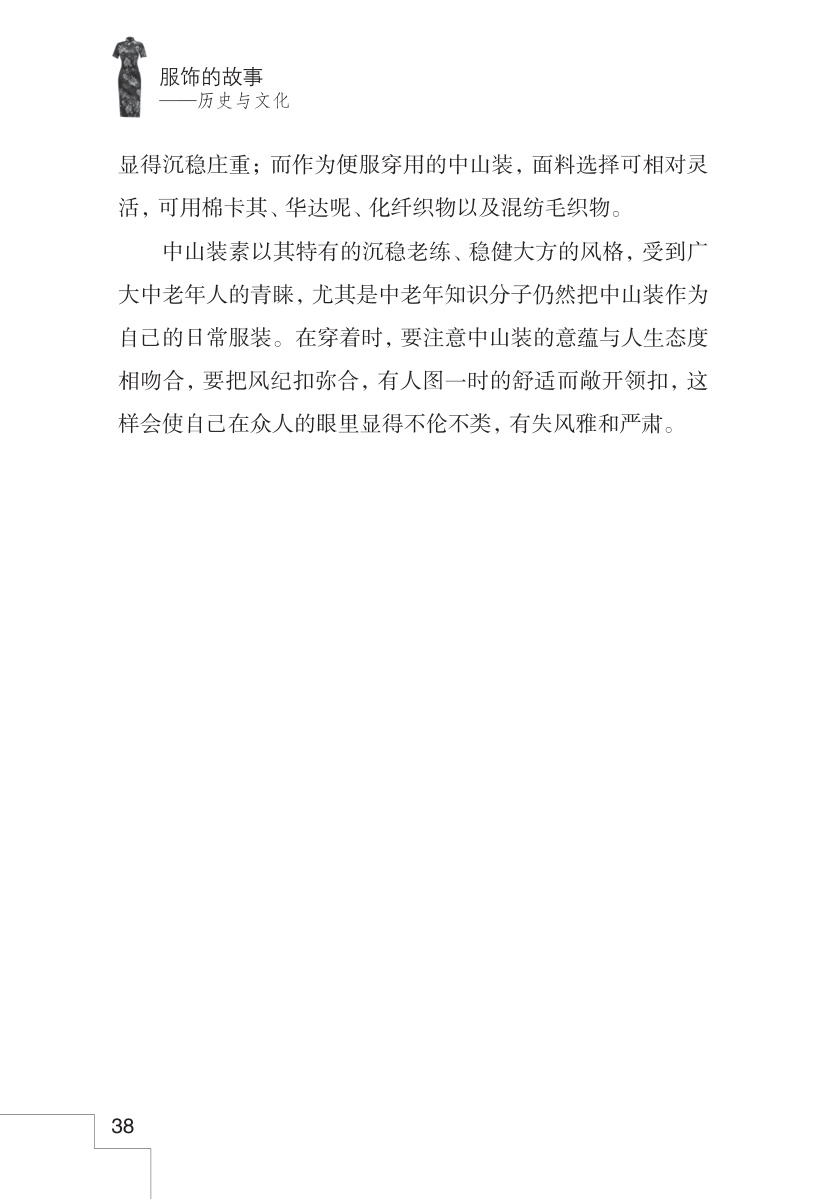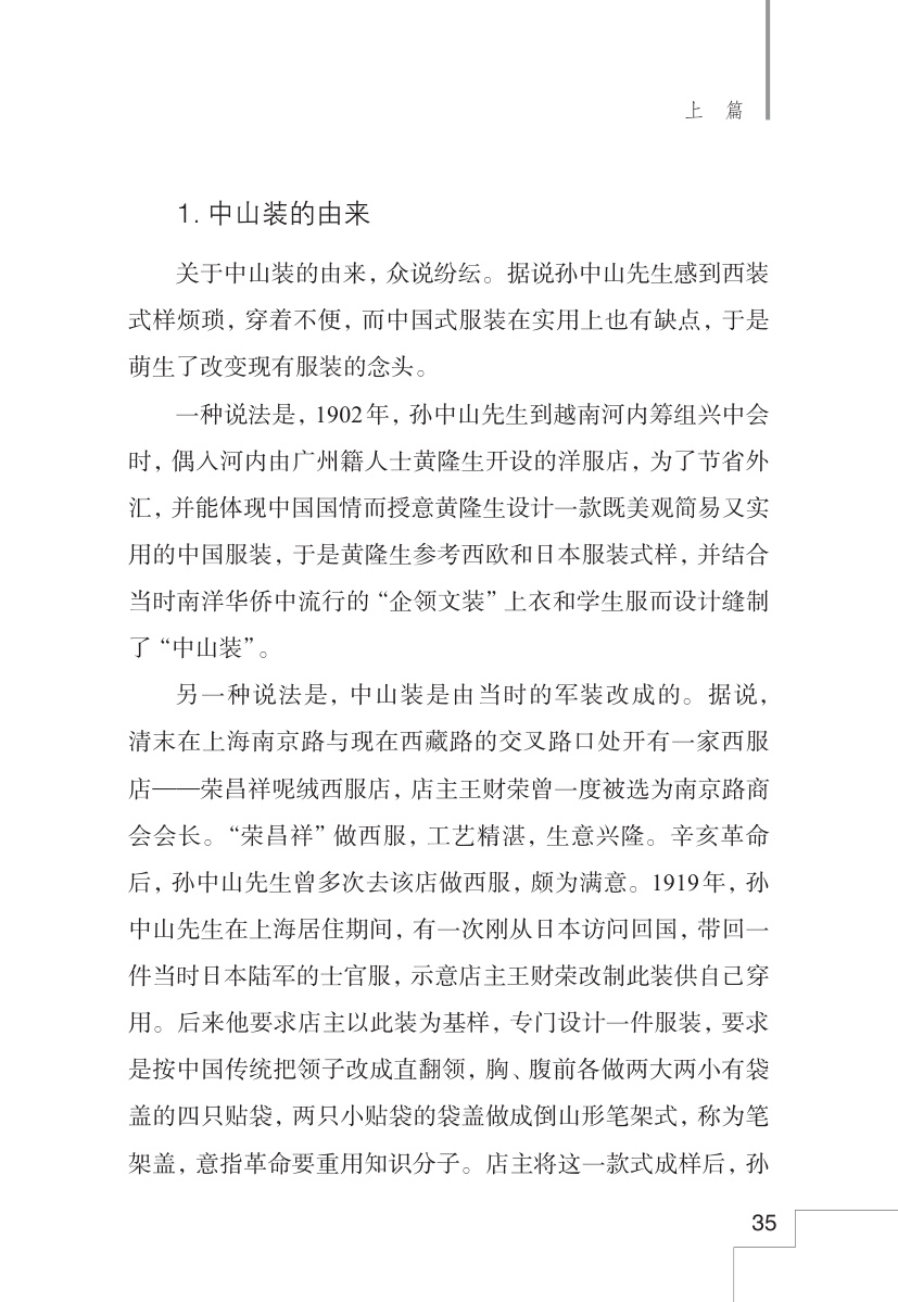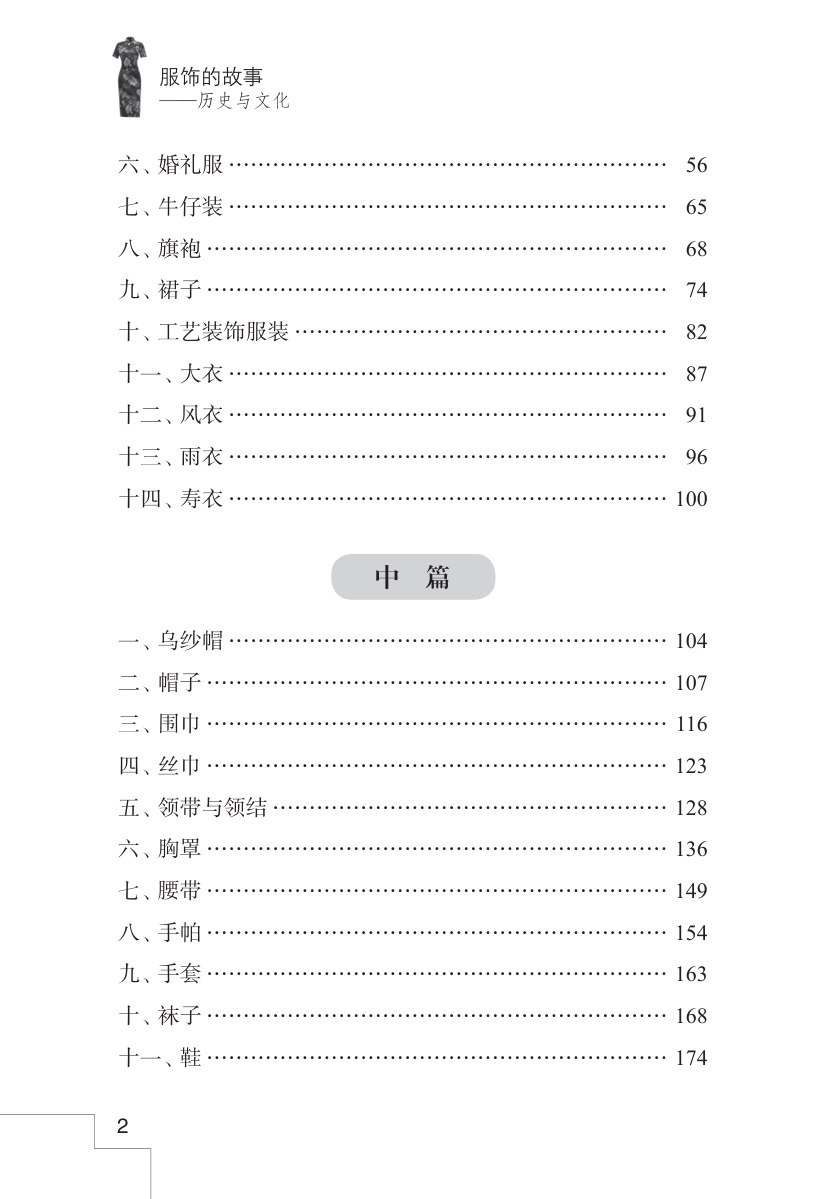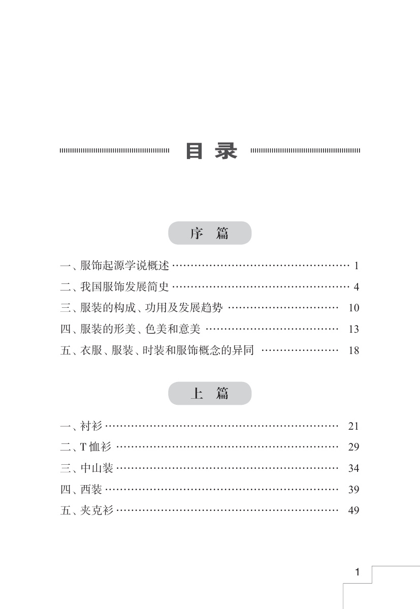 服饰既是物质文明的结晶,又具有精神文明的丰富内涵。本书介绍30余种现代服饰的由来、款式、选择和搭配,旨在帮助消费者穿出健康和美丽,也可供从事服饰设计、生产和销售的人员参考。书中序篇包括服饰起源、我国服饰发展简史等基础知识,上篇包括衬衫、T恤衫、中山装、西装、夹克衫、婚礼服、牛仔装、旗袍、裙子、工艺装饰服装、大衣、风衣、雨衣、寿衣,中篇包括乌纱帽、帽子、围巾、丝巾、领带与领结、胸罩、腰带、手帕、手套、袜子、鞋,下篇包括发饰、首饰、花边、纽扣、拉链、尼龙搭扣。