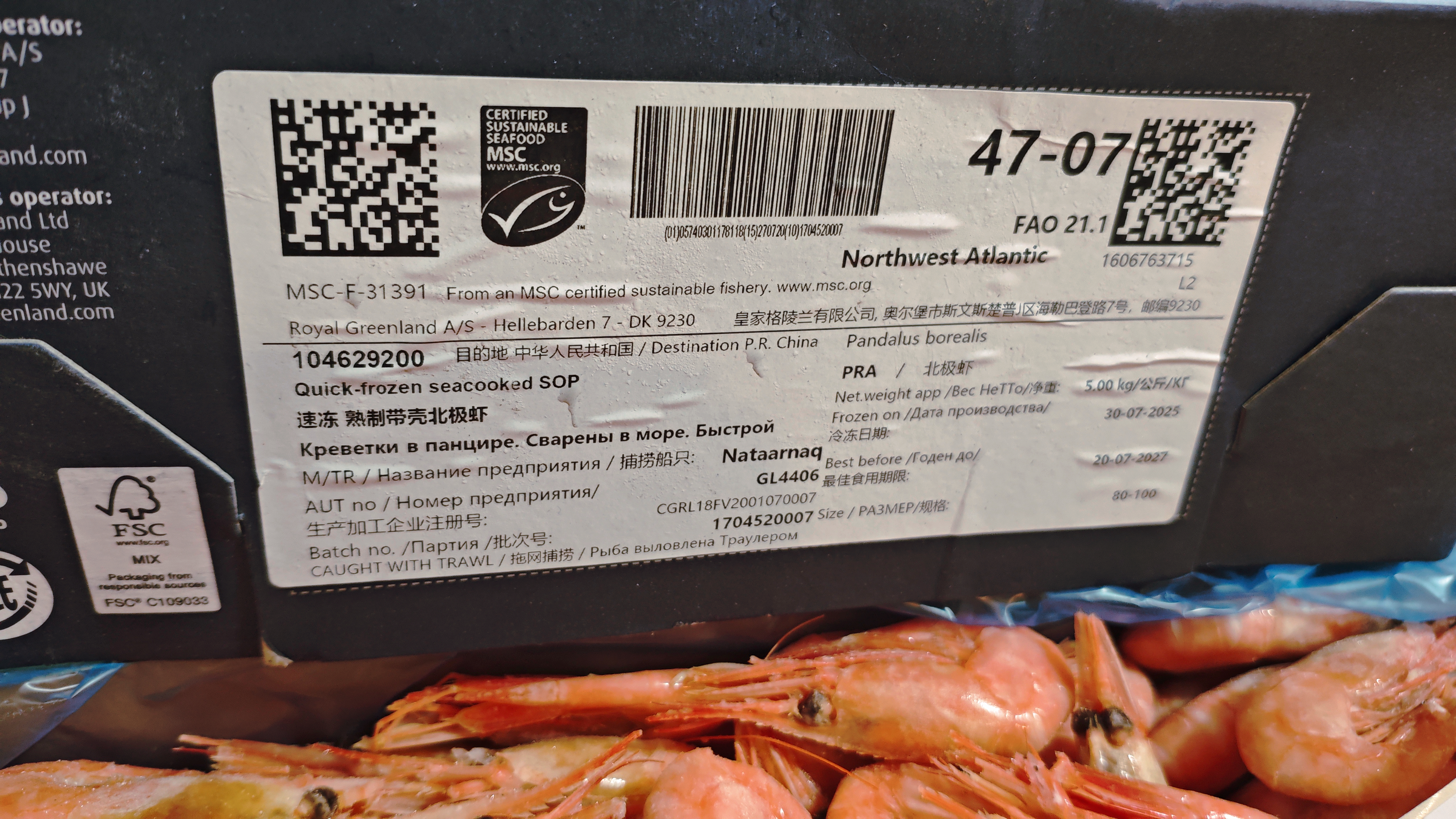 【皇冠北极虾80-100头】125元/2.5斤(塑料袋分装),249元/5斤(塑料袋分装),499元/10斤/原箱(特价不包邮)