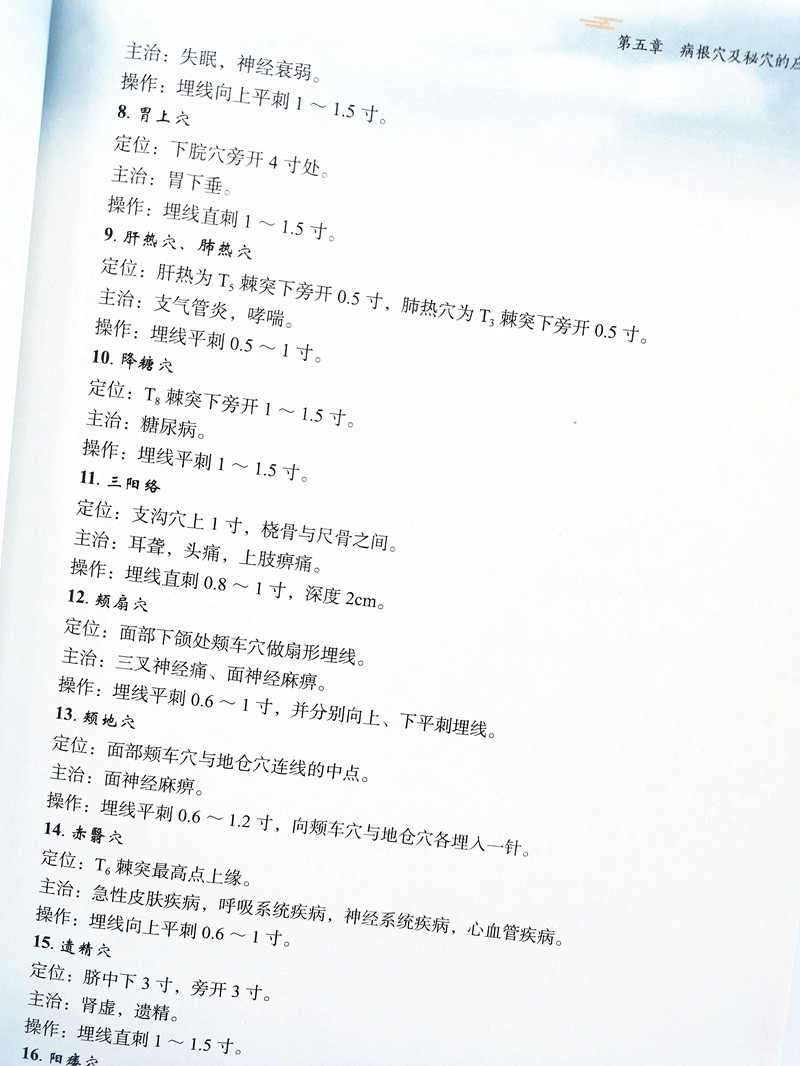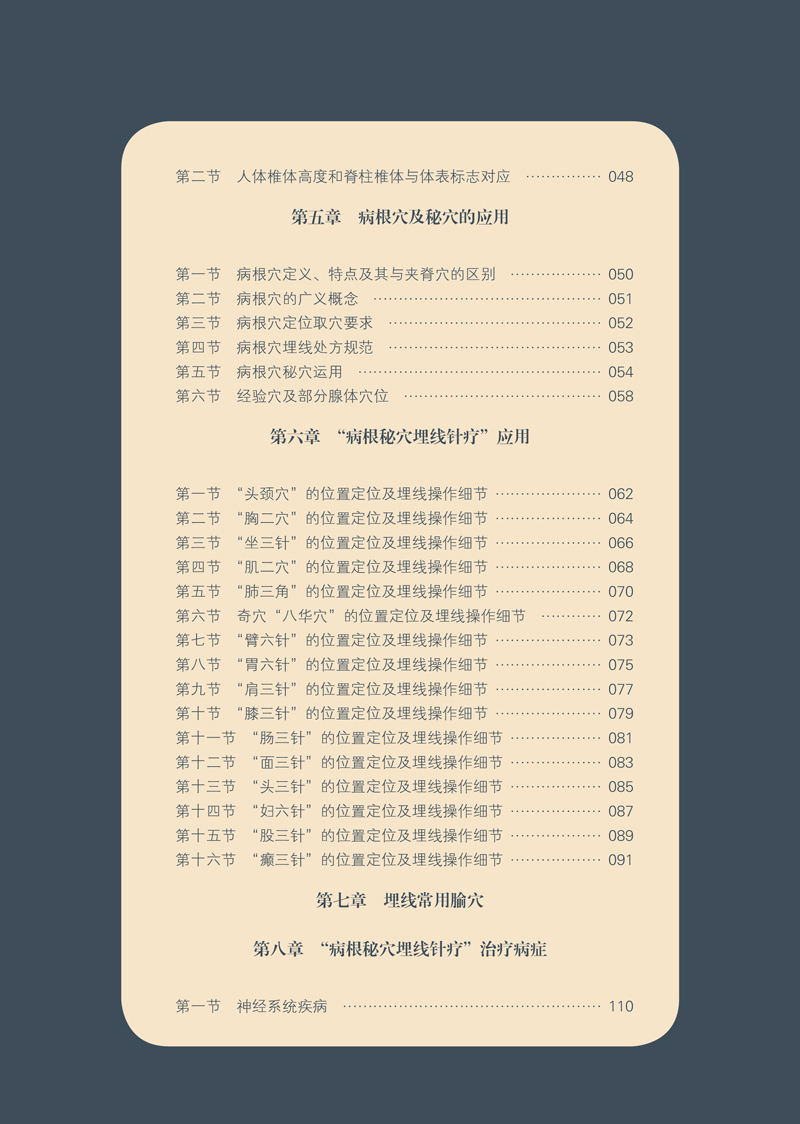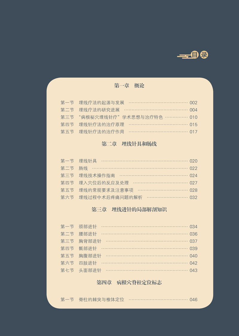 本书是埋线疗法的一种,此书属于中医疗法类的教科书,主要的读者对象是埋线疗法医生和基层医务工作者,用于埋线疗法学习参考。 本书共九章节,第一章主要内容是介绍埋线疗法的历史和发展过程,穴位埋线与病根穴埋线的区别、特点及治疗原理和作用等;第二章是针具和肠线的操作指南,对肠线的配比要求、治疗室的设置、人员资质、操作规程、埋线注意事项及操作中细节和处理等做了详细讲述;第三章是埋线进针层次解剖细节,这也是本书与其他埋线书籍的区别与特点,对不同位置的进针解剖做了详细解析;第四、第五章是病根穴的概念、定位、应用等,这是核心内容;第六章重点介绍病根秘穴十六个组合配穴的定位、解剖和操作手法;第七章是埋线常用腧穴;第八章是临床常见疾病的埋线方法;第九章是临床埋线典型病例。
