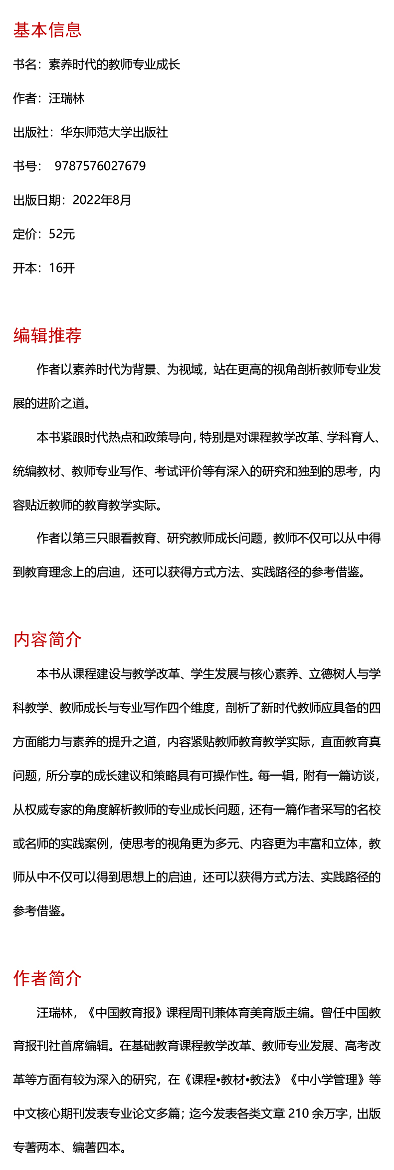 素养时代的教师专业成长 大夏书系 教师专业发展 卓越教师 汪瑞林