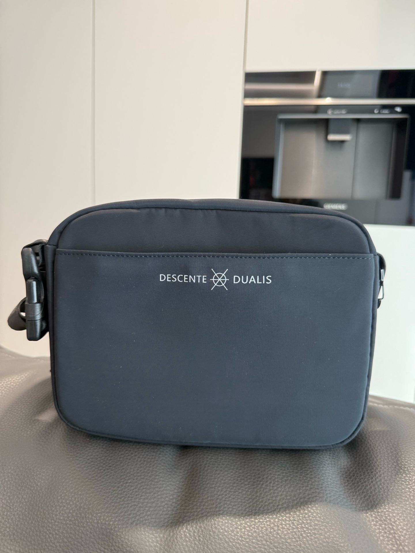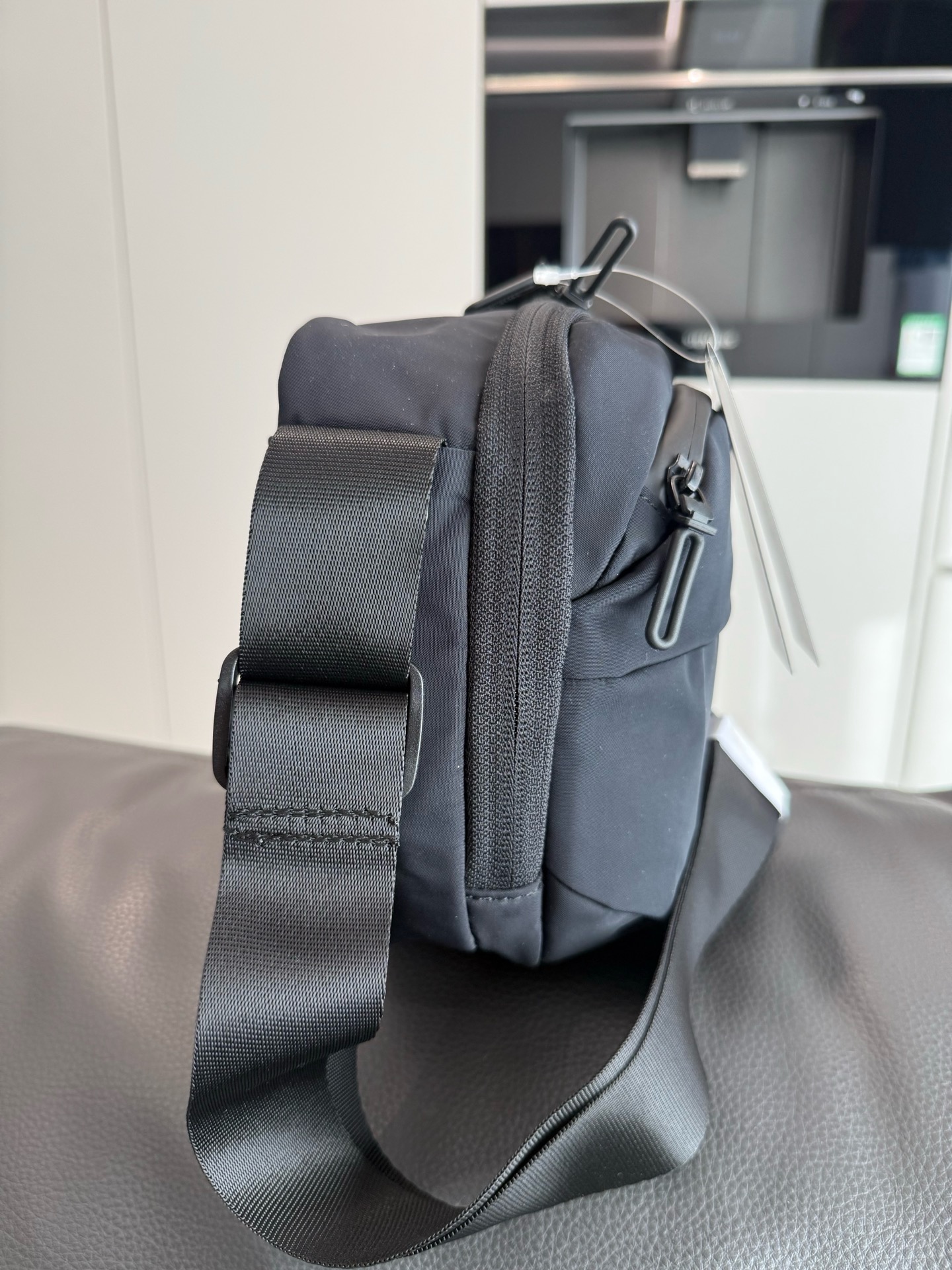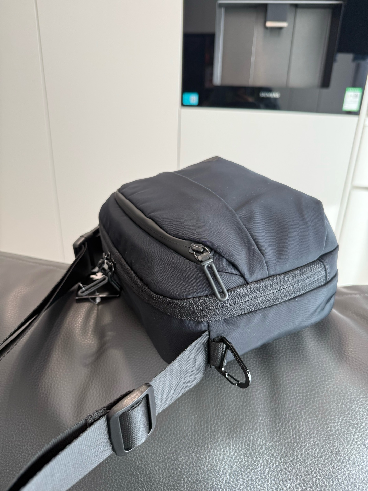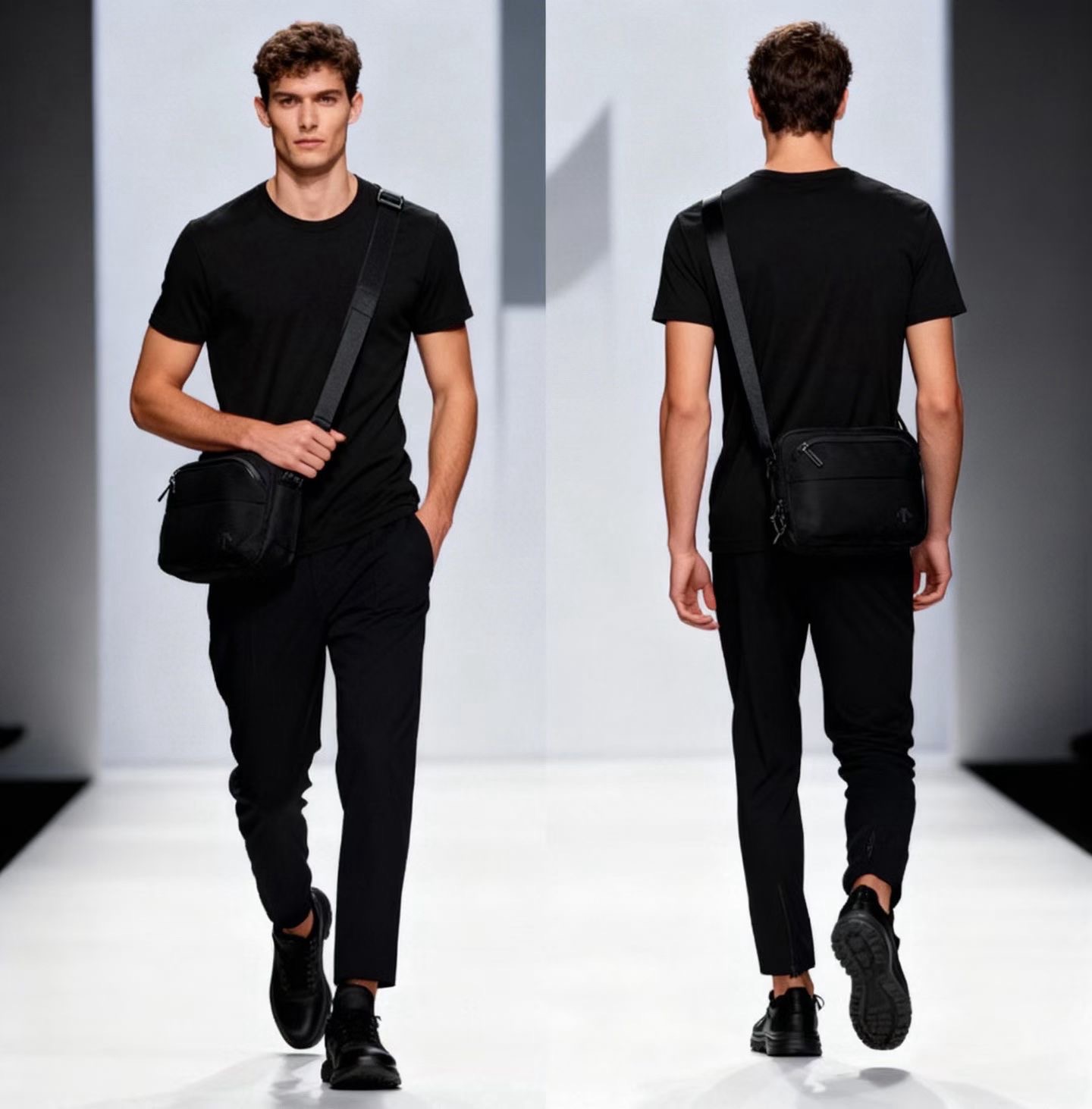 哑光质感的深黑尼龙面料,摸上去是低调的细腻,却自带抗皱抗造的“硬核属性”,通勤挤地铁、周末逛公园都不用小心翼翼护着;包身线条是恰到好处的机能感,没有花里胡哨的装饰,只靠暗纹logo和简洁的分层设计撑气场,搭宽松卫衣是松弛的运动感,配利落西装又能透出轻熟的精致感,从早八通勤到傍晚citywalk,风格切换毫无违和感。