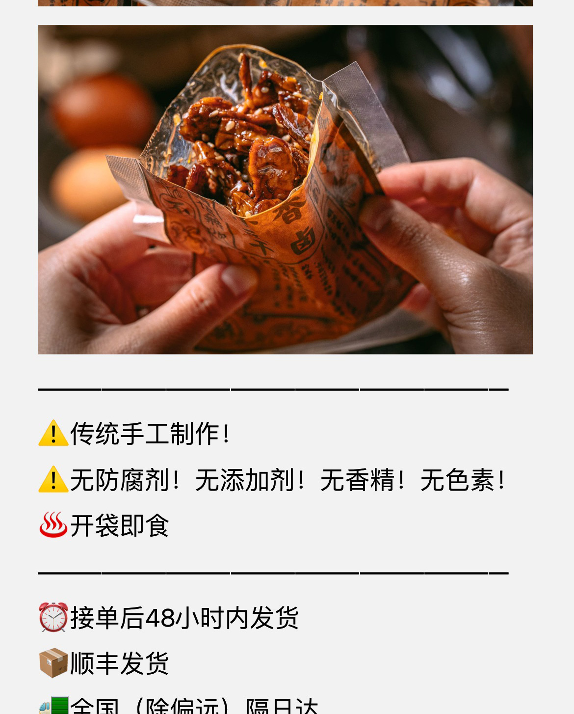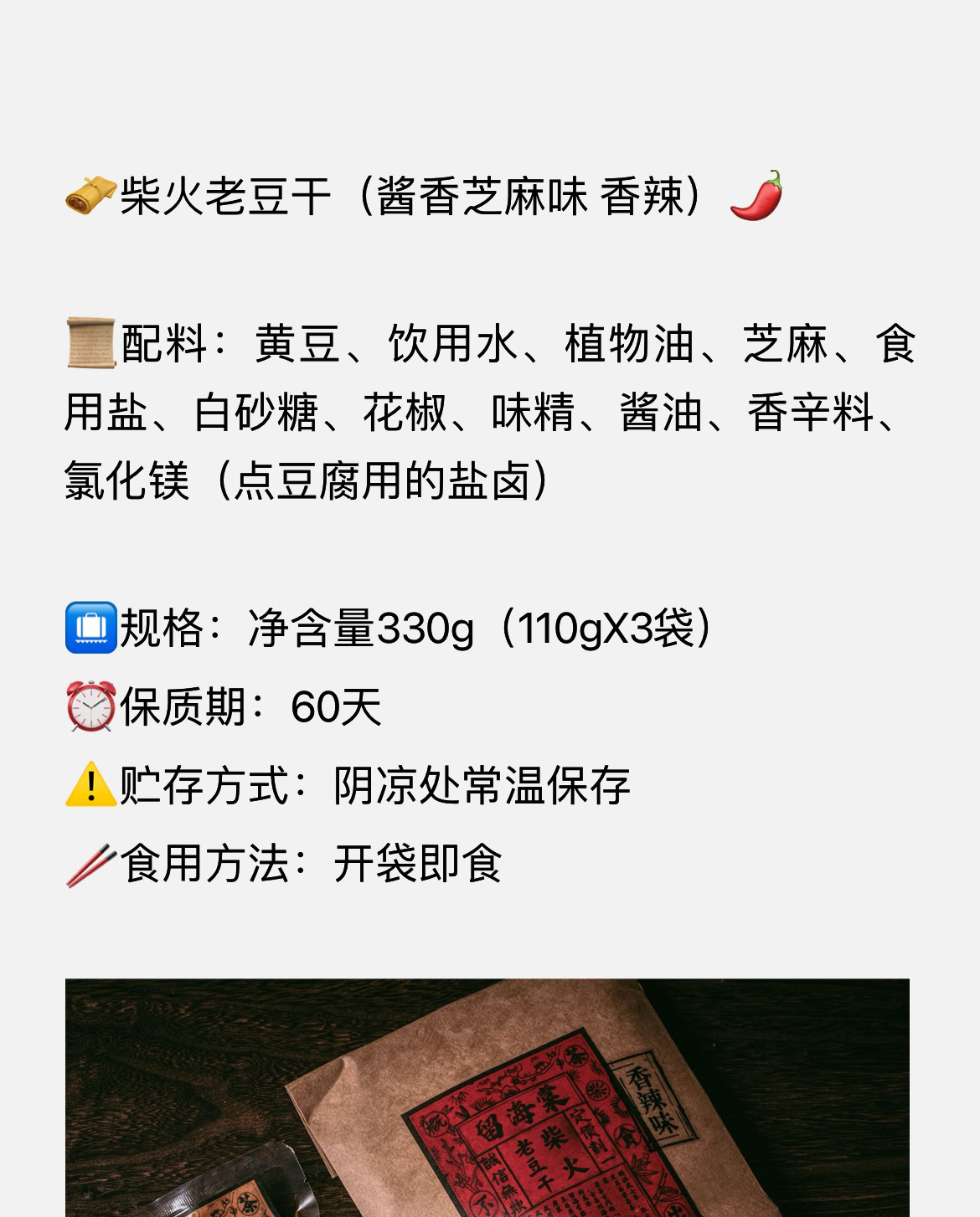 【品名】留海棠柴火老豆干/灯影豆丝 【规格】 【保质期】 【储存方法】置于通风阴凉干燥处保存 【产地】重庆 【发货地】重庆 【发货快递】顺丰 【不发货区域】西藏,港澳台地区不发 【补邮费地区】海南省,甘肃省,黑龙江省,吉林省,辽宁省,内蒙古自治区,宁夏回族自治区,青海省,新疆维吾尔自治区+5元/单 【发货时效】48小时,节假日顺延 |