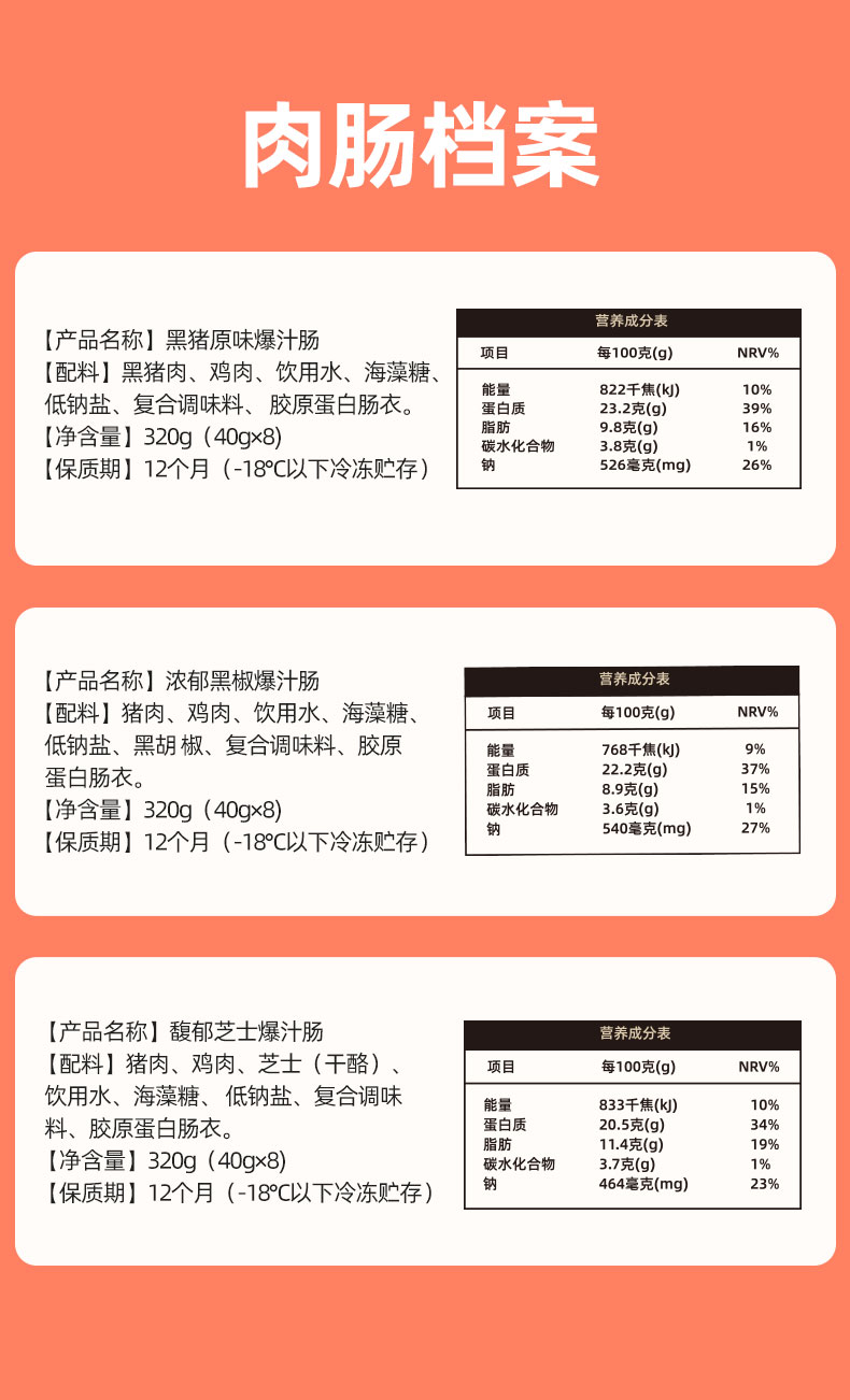 【配料】黑猪肉、鸡肉、饮用水、海藻糖、低钠盐、复合调味料、胶原蛋白肠衣。