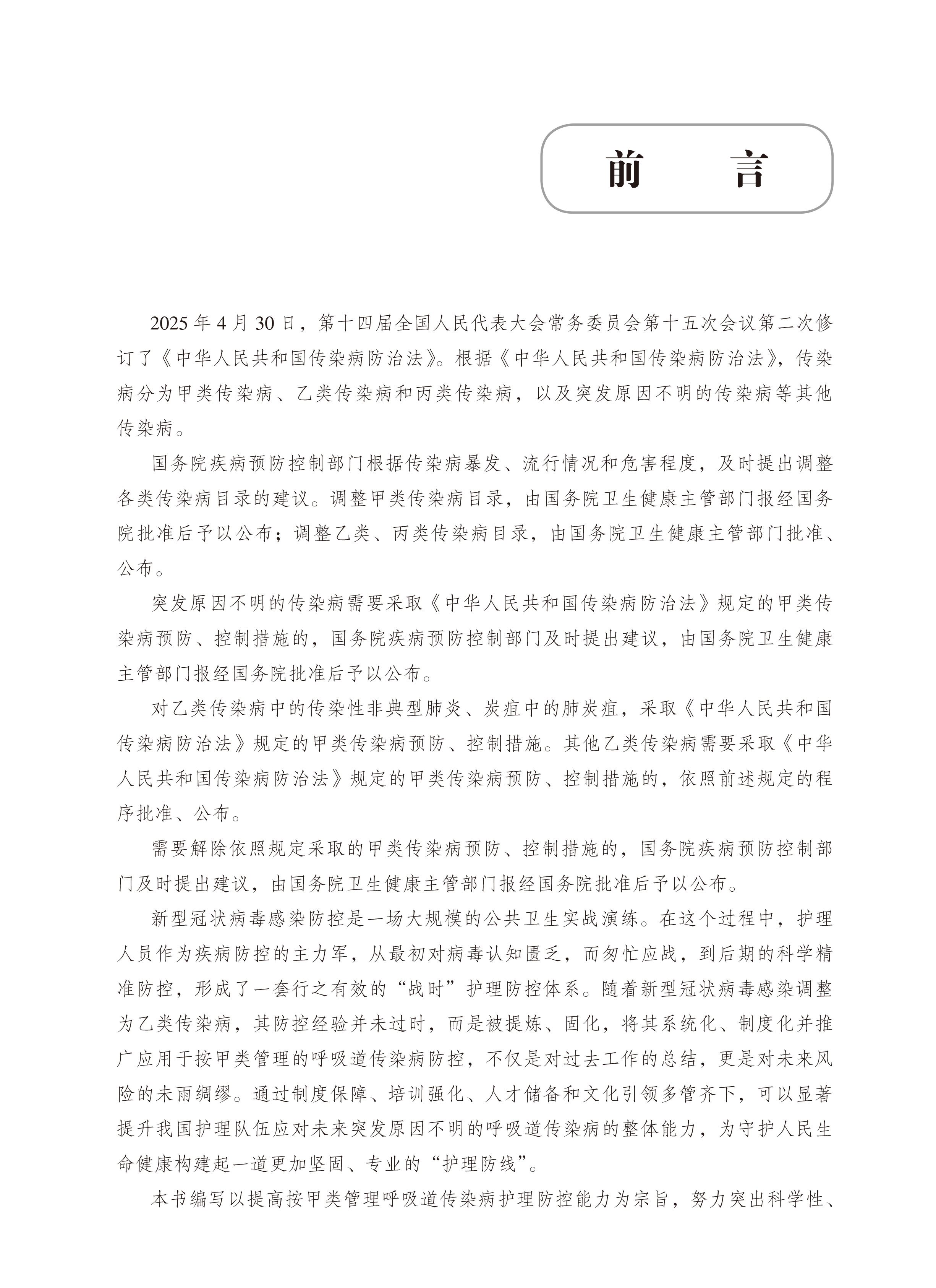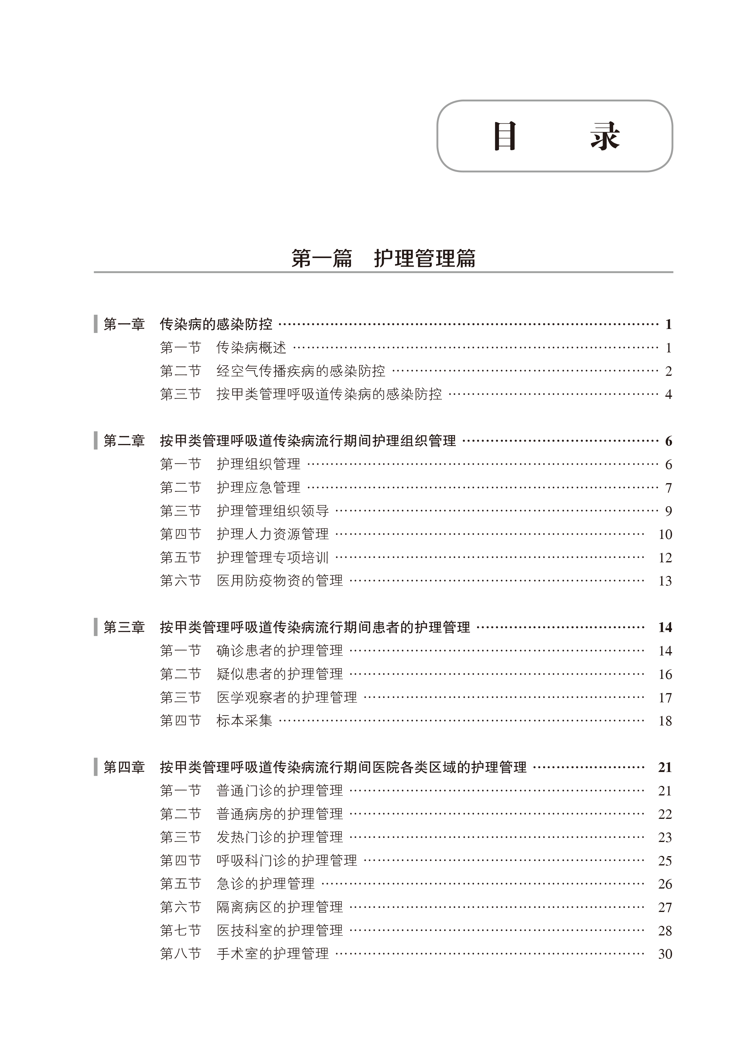 本书以提高呼吸道传染病护理防控能力为宗旨,在编写内容和形式上努力突出科学性、实用性、工具性等特色。全书共分为三篇,包括护理管理篇、护理制度篇、防控流程篇,内容涉及疾病概论、疾病流行期间的护理人力资源管理、患者的护理管理、防护物资的管理、疾病流行期间的护理防控及感染防控、医院各部门及特殊人群的护理管理等,系统全面介绍了按甲类管理呼吸道传染病的护理防控工作,内容实用,贴近临床工作,旨在为护理人员提供按甲类管理呼吸道传染病护理防控工作的重要参考依据。