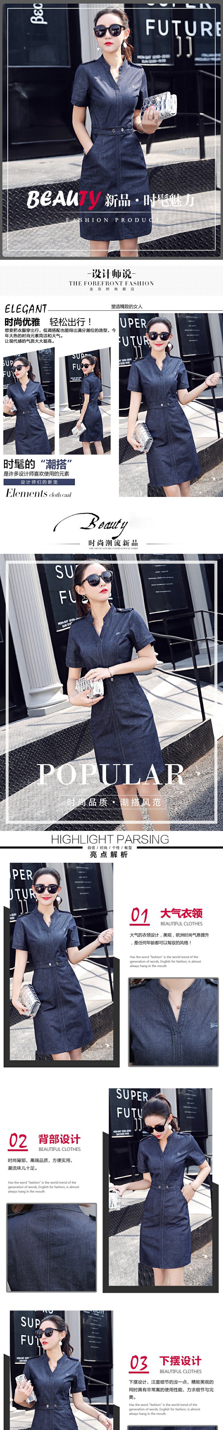 FXG-牛仔连衣裙女夏短袖V领中裙A字裙高腰修身显瘦包臀裙