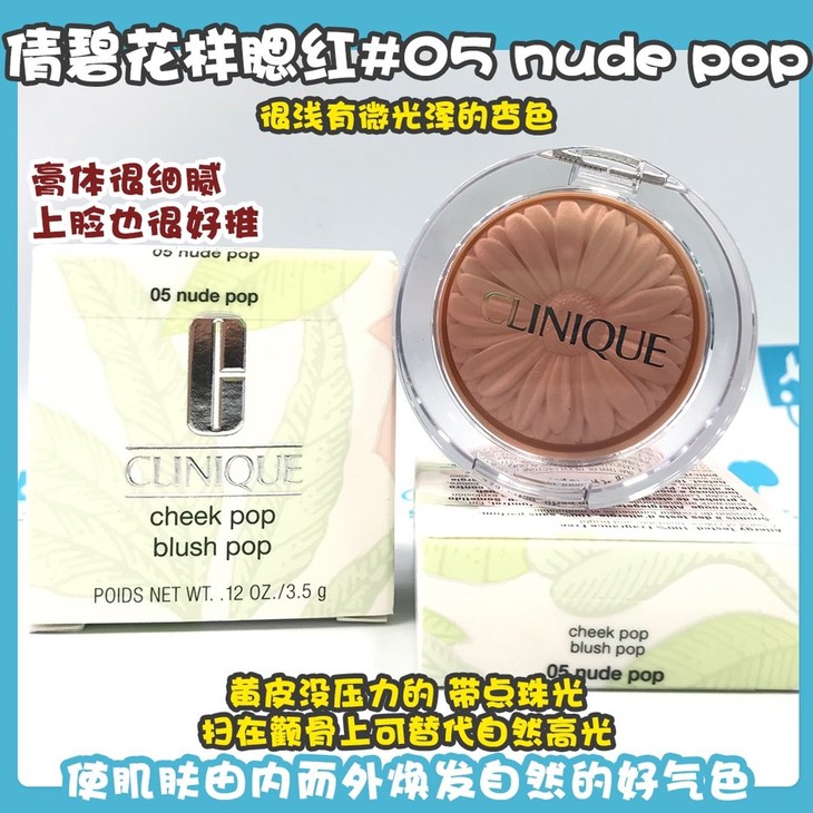 倩碧花样腮红#05 nude pop👍仙女本色👼,涂上就是安安静静不费力的温柔白月光🌙!很浅有微光泽的杏色✨,多叠加几次会呈现嫩粉色💗,是那种元气的粉哟👅,黄皮没压力的👌。带点珠光,扫在颧骨上可替代自然高光💫。虽然颜色较浅,但更像完全融入皮肤一样😊,使肌肤由内而外焕发自然的好气色,日常不知道扫哪块扫它不会出错❗❗