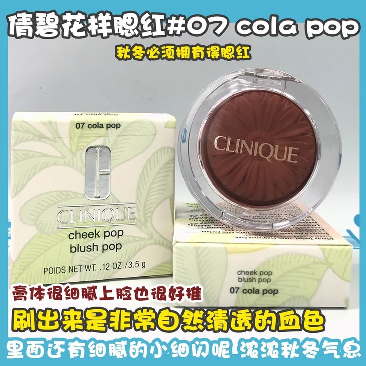 倩碧花样腮红#07 cola pop👍秋冬必须拥有得腮红❣日杂牛血色❤,刷出来是非常自然清透的血色😍,很适合画日杂复古、宿醉妆容💄。膏体很细腻,上脸也很好推🌬,里面还有细腻的小细闪呢✨~浓浓秋冬气息🍁,像是冬天被冻的红彤彤的小脸,记得稍微刷一下鼻尖,特别可爱😋,拿来当眼影也很好看👀!腮红显色度超好滴,⚠下手记得要轻哦~