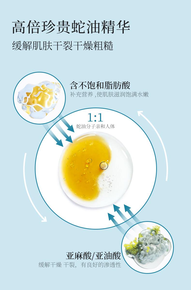 蛇油分子与肌肤1:1亲和,拥有卓越渗透力,能深度滋养肌底。