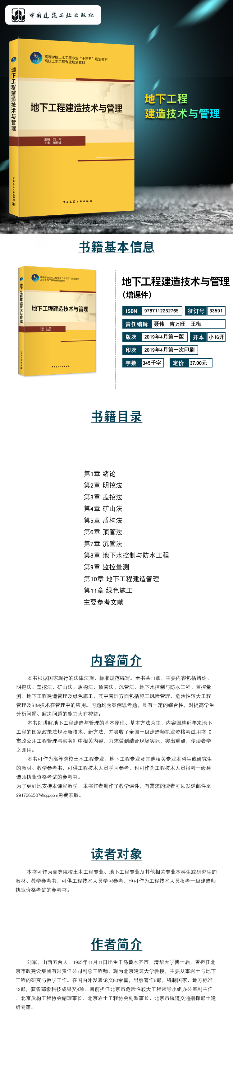 本教材以我国土木工程建设为依托,特别是地铁工程为依托,深入浅出的论述常用地下工程建造方法及管理,并通过案例进行了深入分析,具有较强的理论与实践性,该教材能应反映本学科发展前沿状况的研究成果,具有较高的学术与应用价值,改变目前知识点凌乱、陈旧等问题,能为本科生、研究生的教学提供系统知识,并激发学生的创新能力和提高综合素质;另外也可作为工程技术人员的参考书。