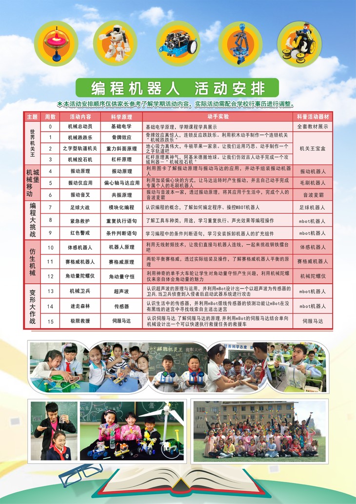 高端机械科技的时代来临了! 这个象征第三次工业革命的最新科技,将彻底改变人类的生活。为让孩子与最新科技接轨,提升对机械科技的兴趣,从机器人入门的机械原理、电学、马达和控制原理切入,用陀螺仪原理介绍平衡装置、用偏心轴的原理介绍的机器人的移动原理。课程透过人形机器人的展示、仿生机器人的组装、足球机器人的操控,带领孩子进行一场机器人足球赛,以最丰富有趣的机器人学具让学生结合生活中的机械应用制作科学实验品。
