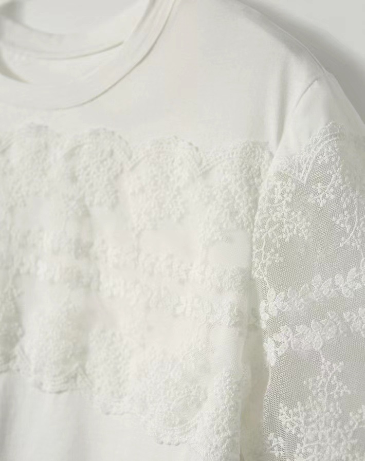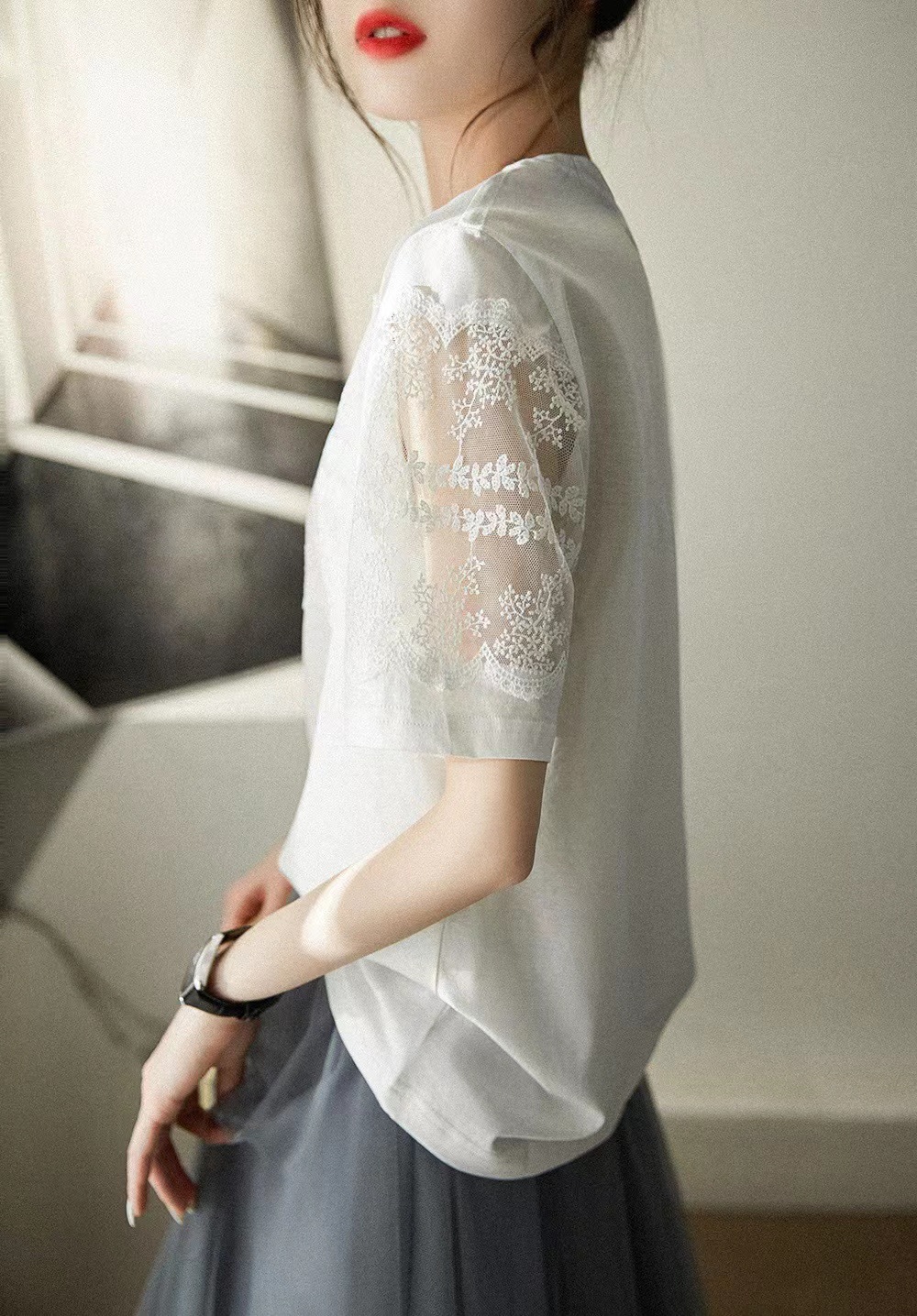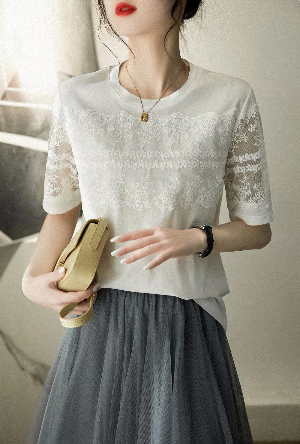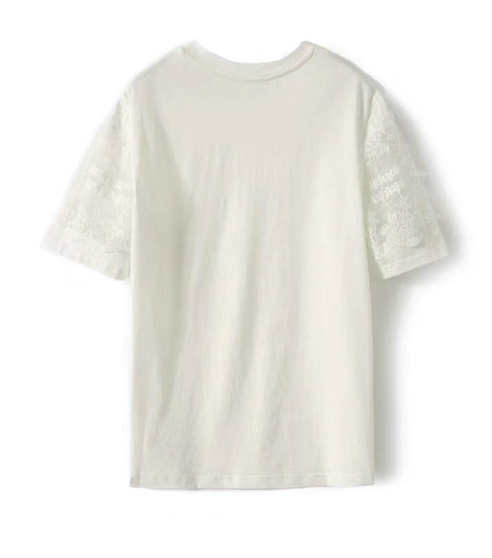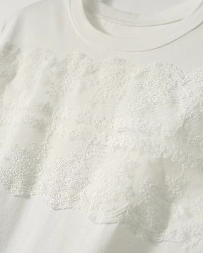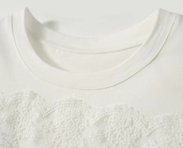 雀说 举手投足都在撩你 舒适纯棉 蕾丝拼接 圆领短袖T恤女夏5ZF-20935