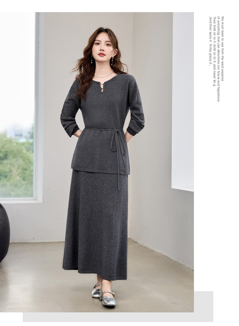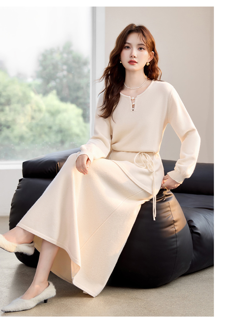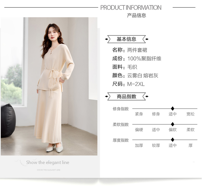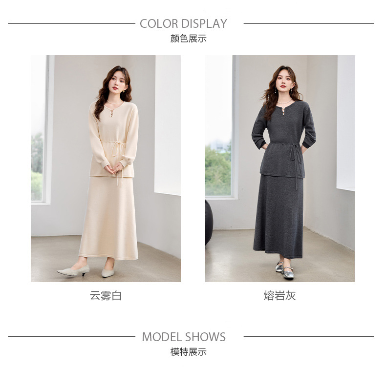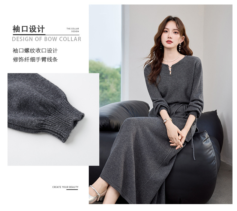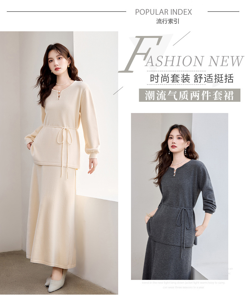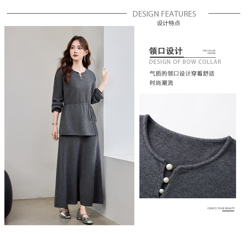 秋季新款法式简约风珍珠圆领收腰气质款百搭两件套裙YBER617