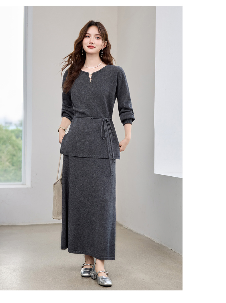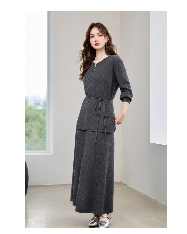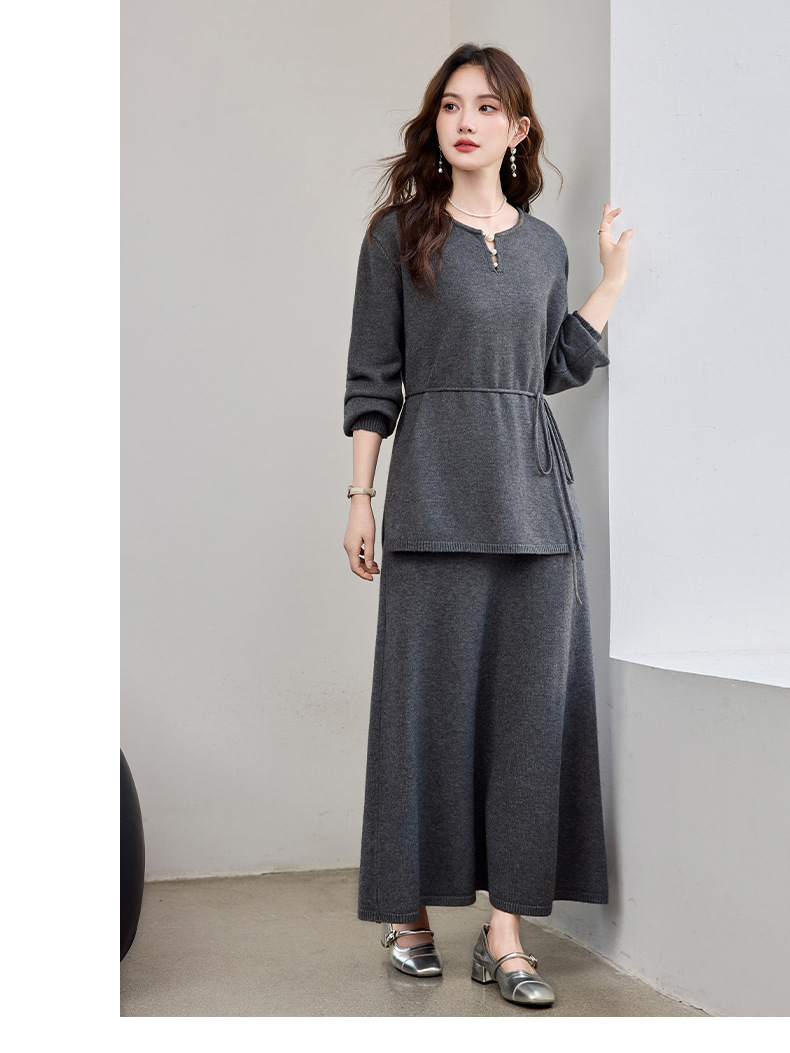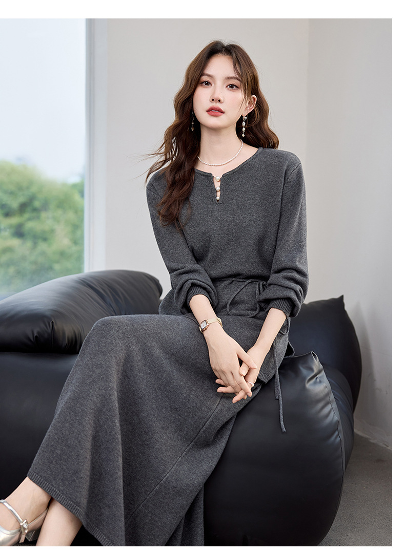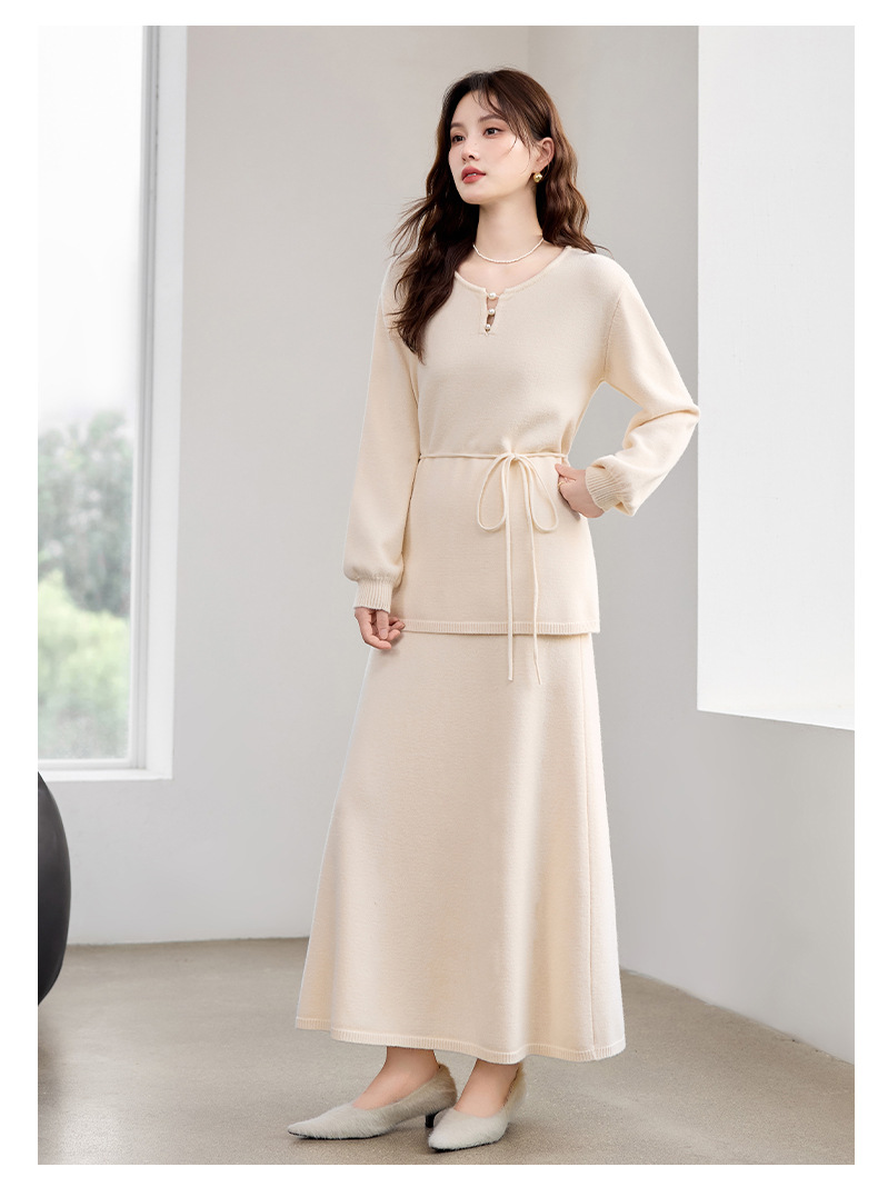 秋季新款法式简约风珍珠圆领收腰气质款百搭两件套裙YBER617