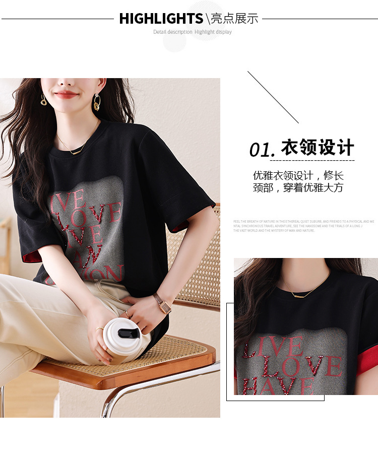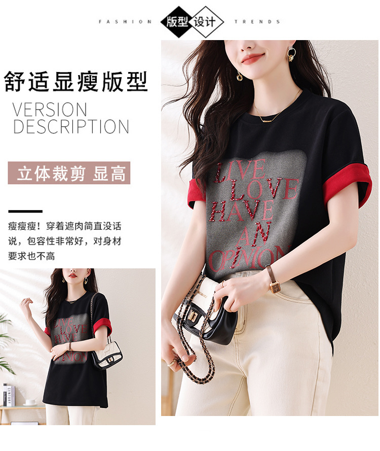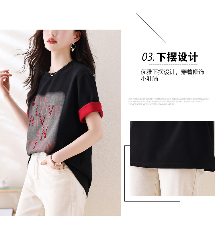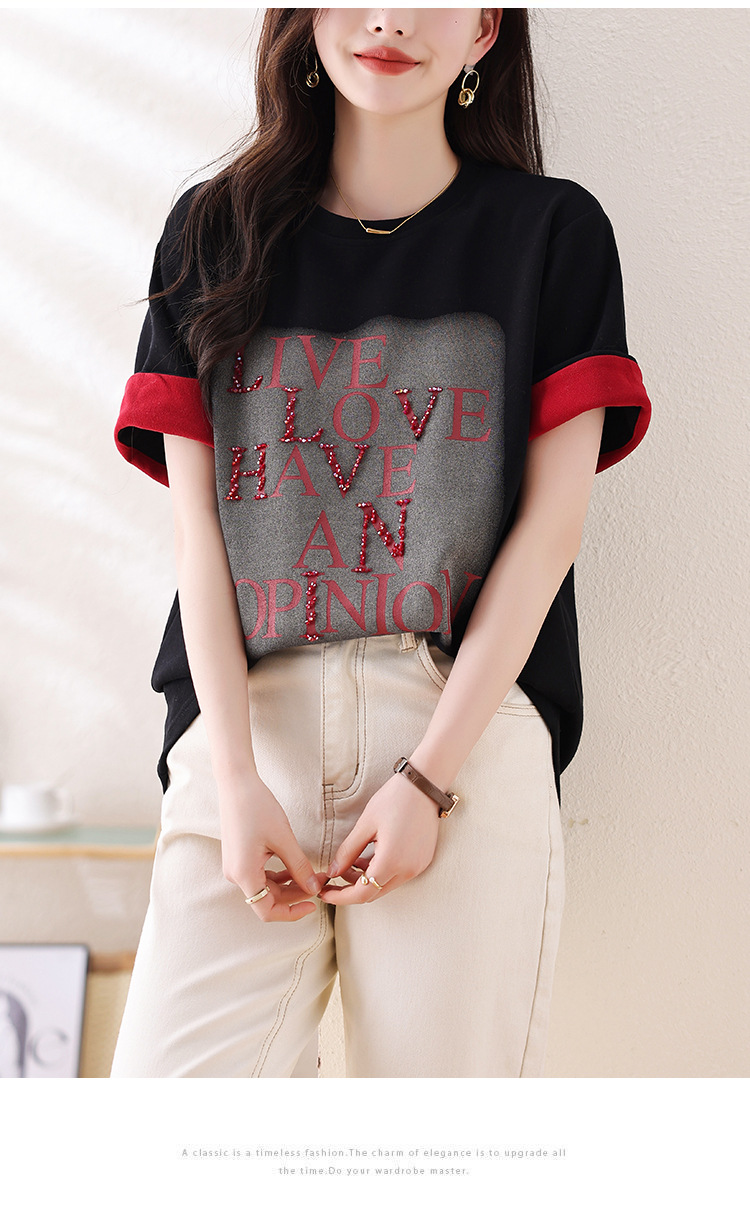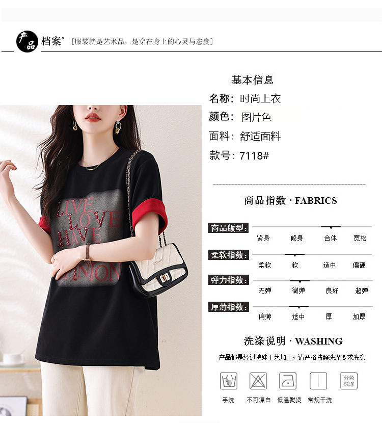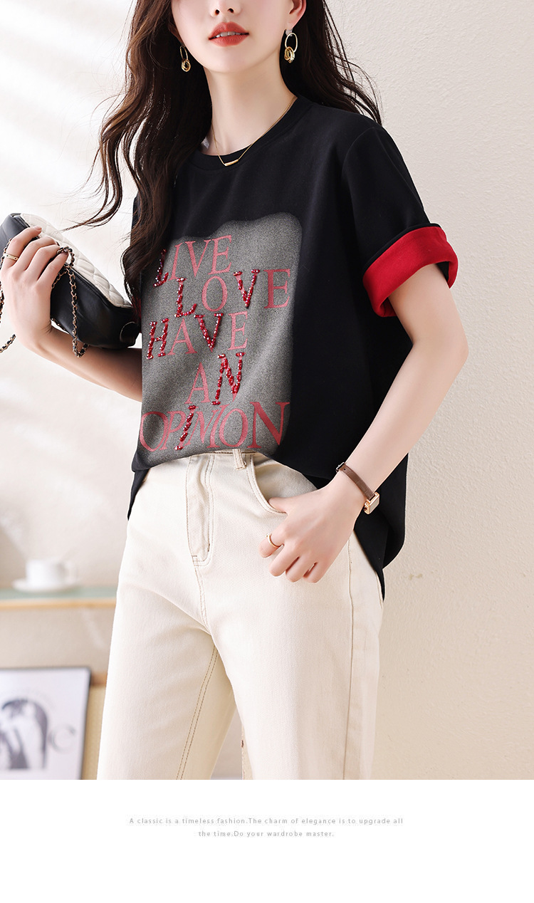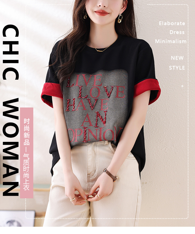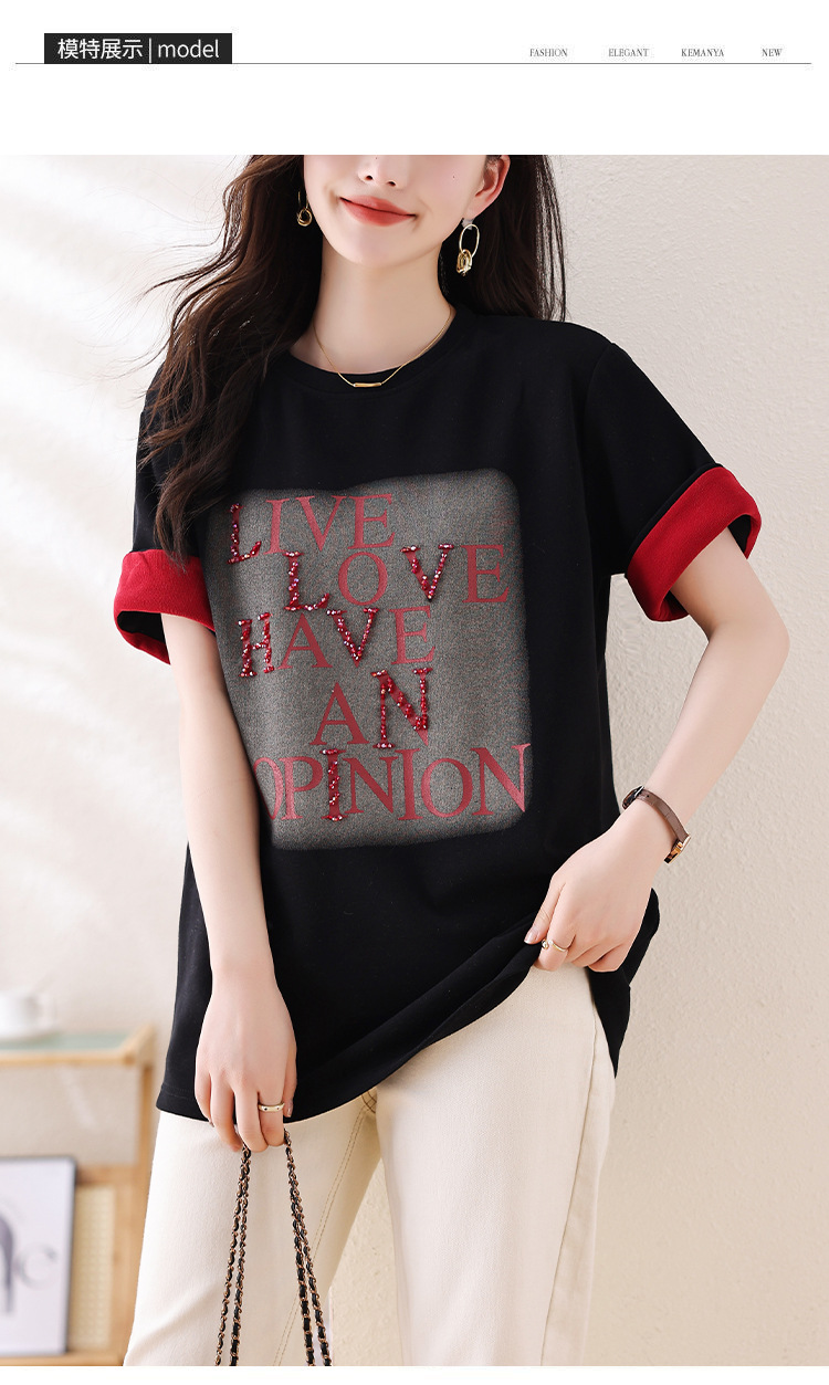 雀说手工钉钻字母印花T恤女新款袖口拼接宽松休闲打底上衣AL7118