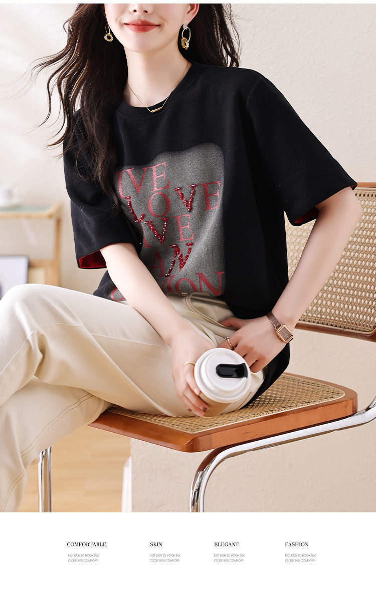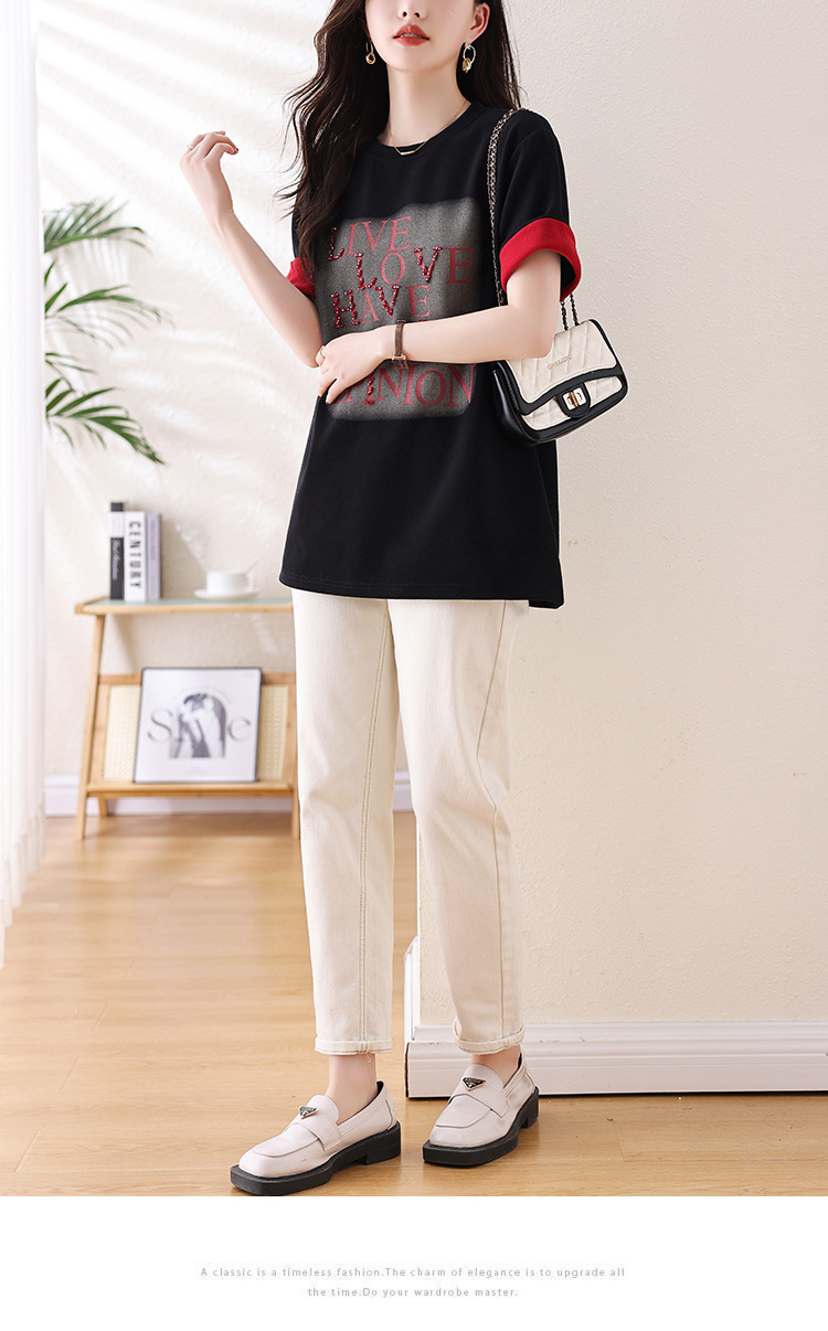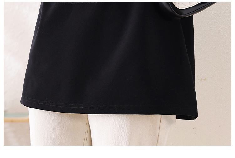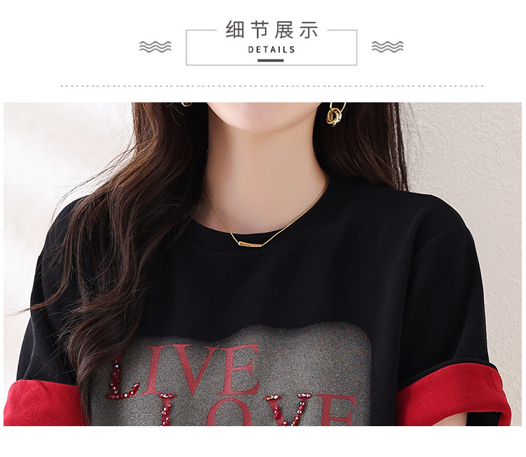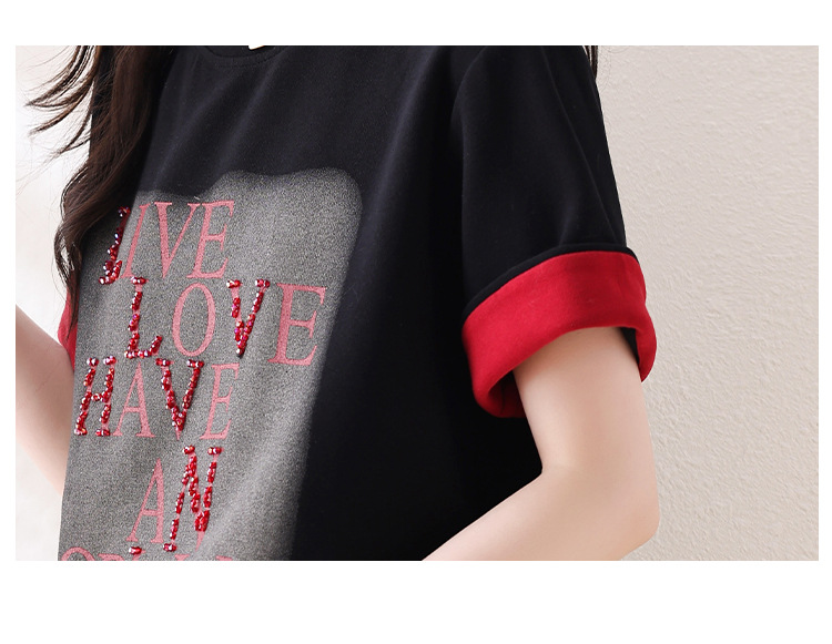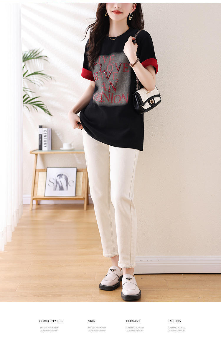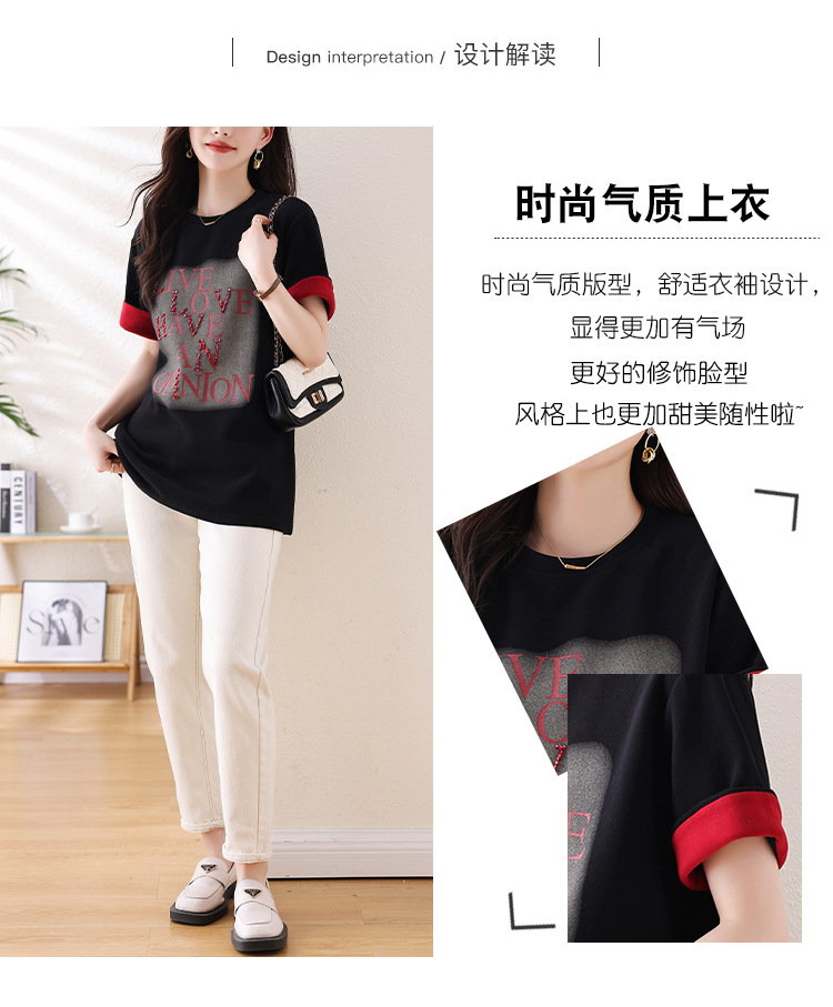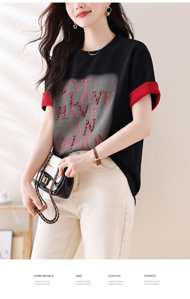 雀说手工钉钻字母印花T恤女新款袖口拼接宽松休闲打底上衣AL7118
