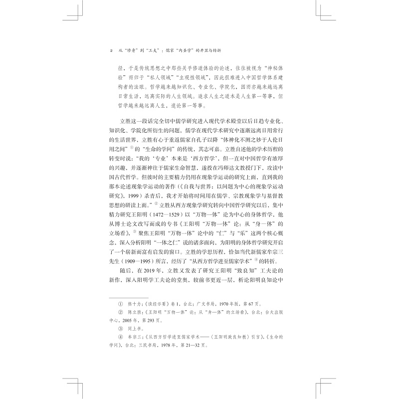 《从“修身”到“工夫”:儒家“内圣学”的开显与转折》一书,是中国哲学研究的重大创获。它把儒学中的体道与道体视为相互嵌合的结构,深入探讨修养工夫的一般意义,并延伸至相关实践的技艺讨论。书中以清晰的学术语言描绘内在的精神体验,挖掘了这一古典思想现象中的丰富哲学资源,为儒学的创新研究树立了新的标杆。