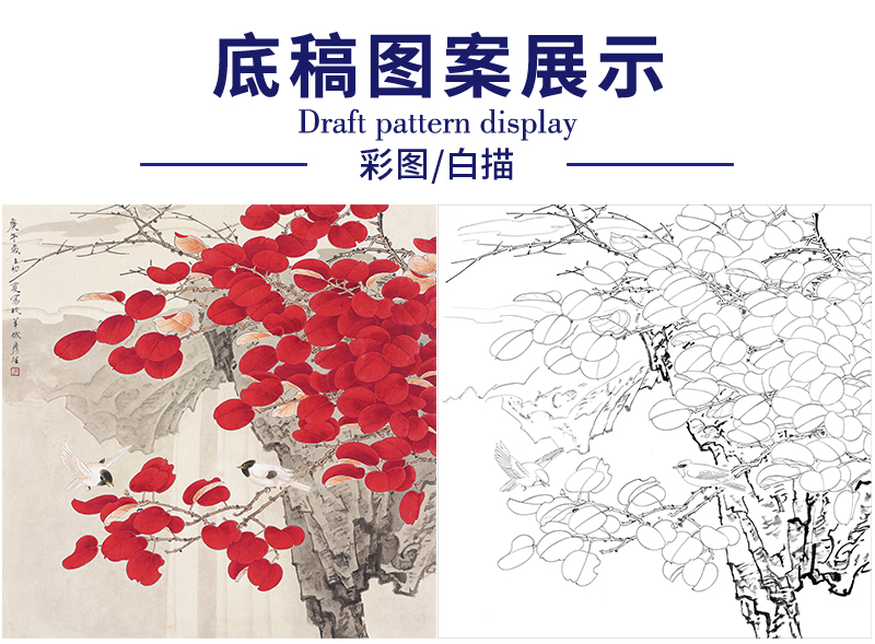 周彦生花鸟工笔画白描底稿《红叶飞雀》四尺斗方临摹勾线高清打印稿A668