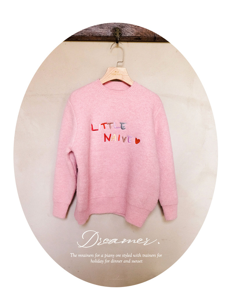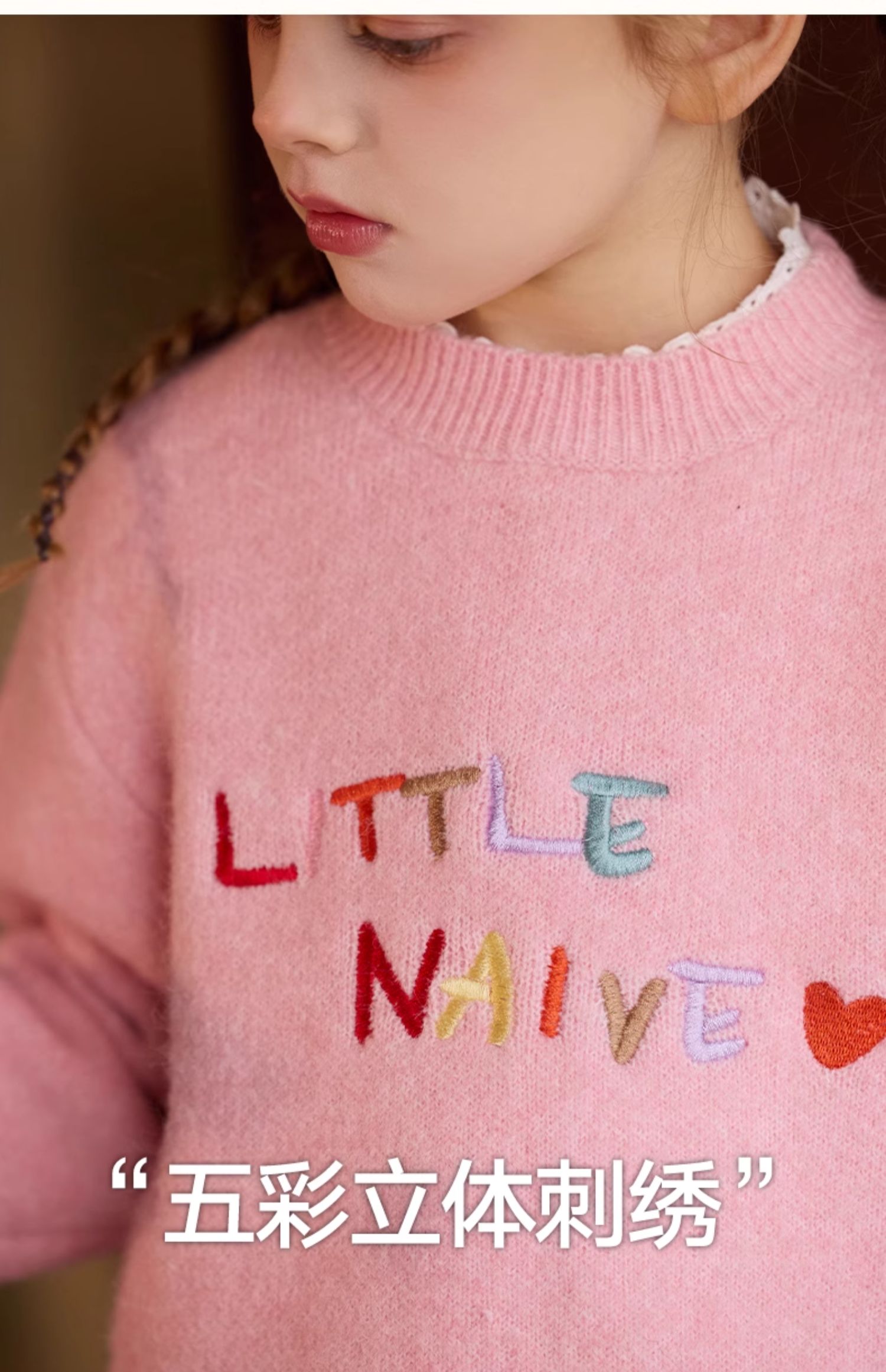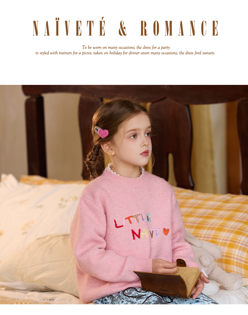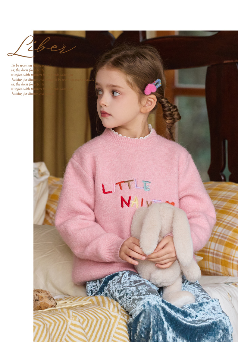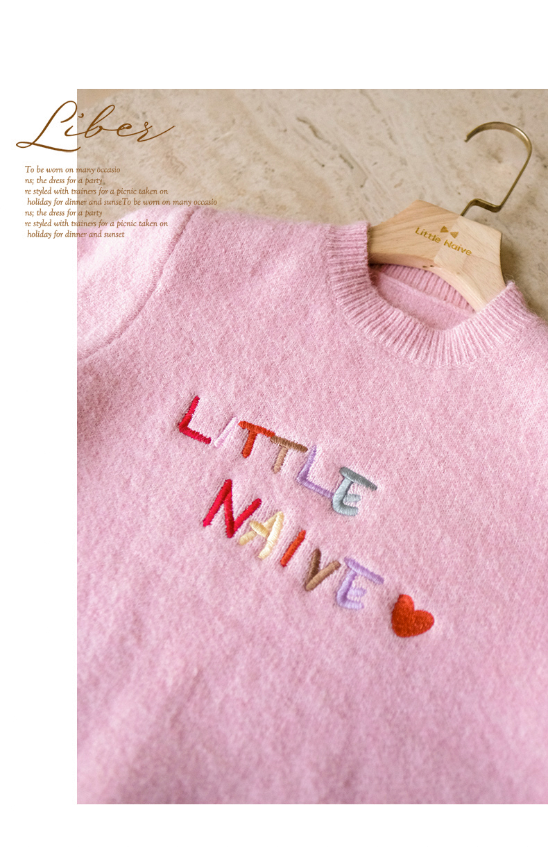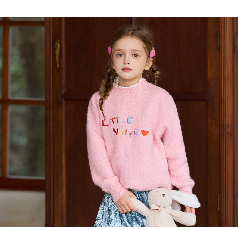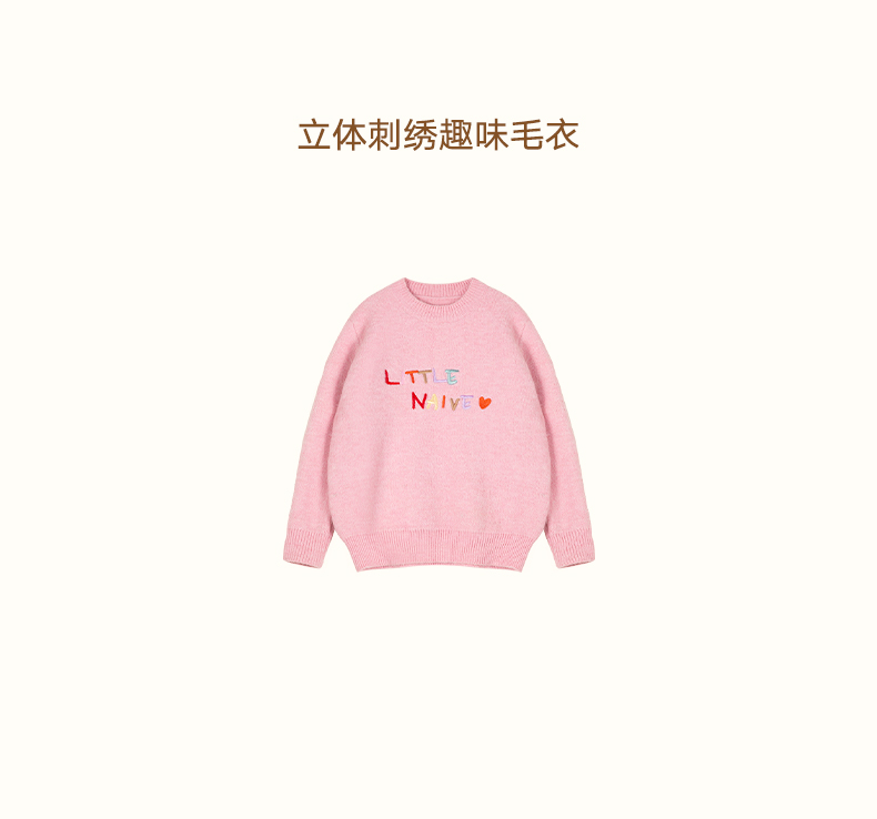LittleNaive女童多巴胺套头毛衣冬季新款儿童圆领刺绣针织衫上衣