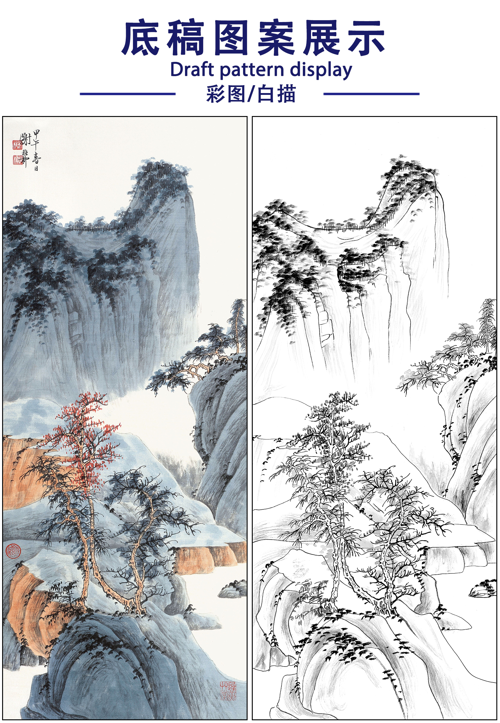 谢稚柳山水工笔画白描底稿《秋山晴翠》临摹勾线高清打印稿XZ37