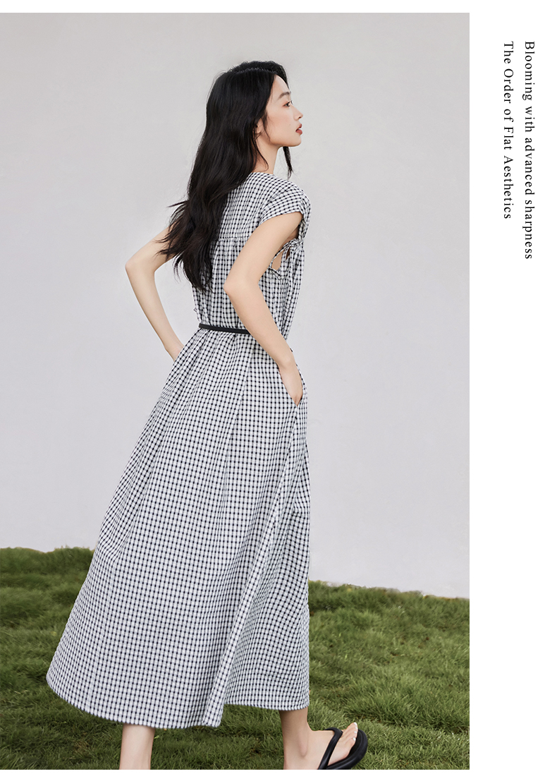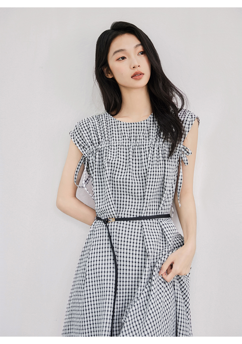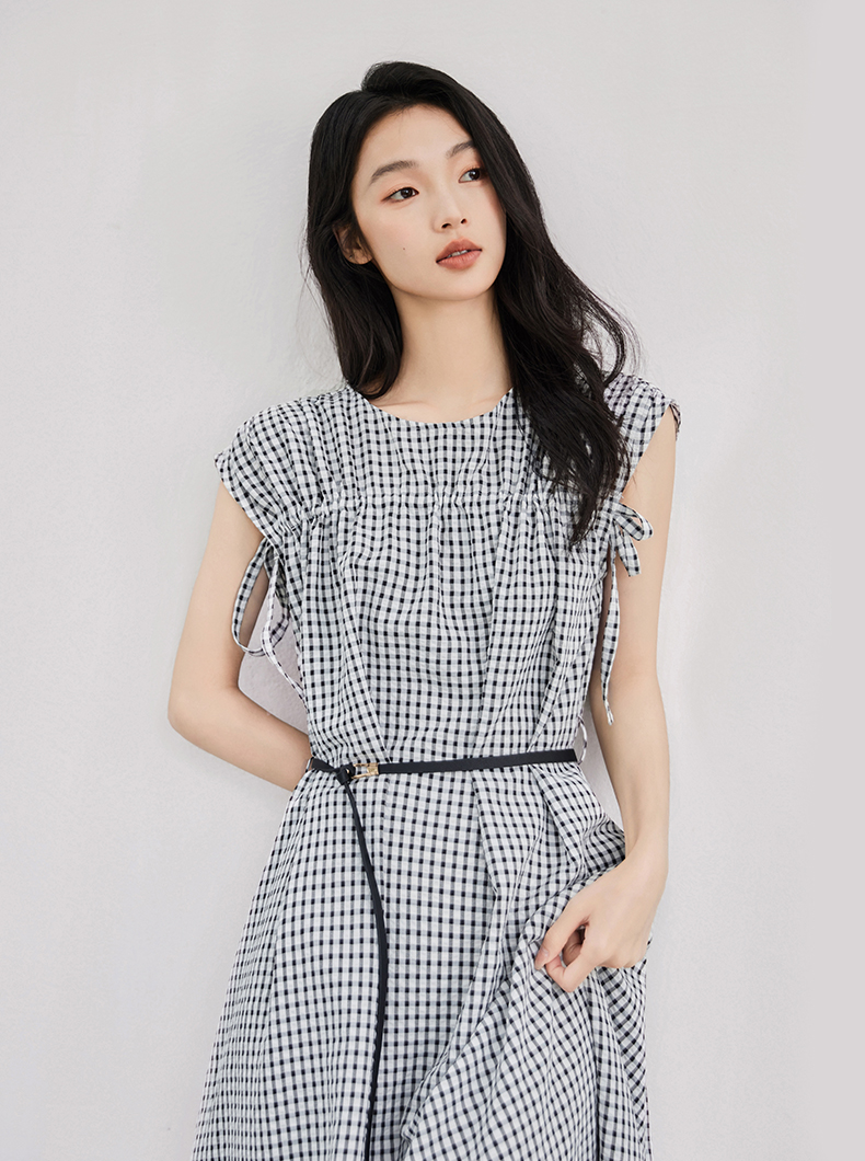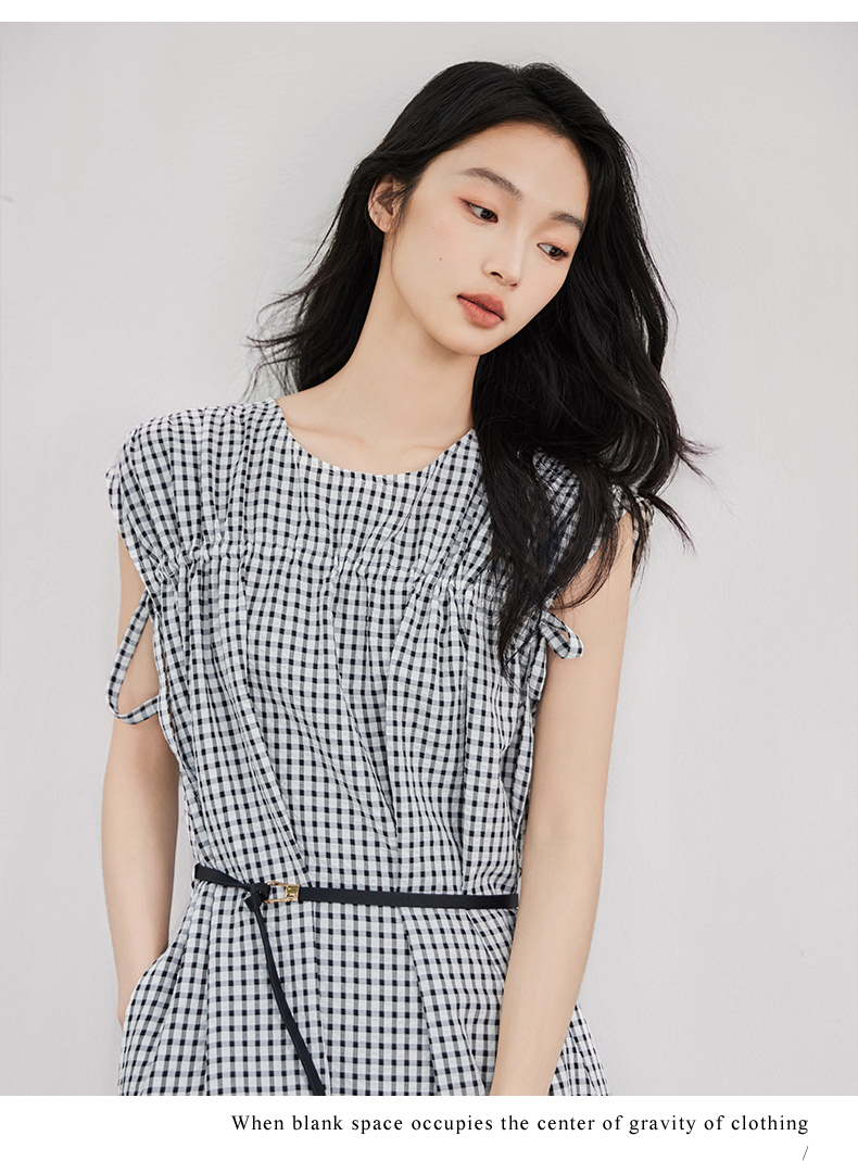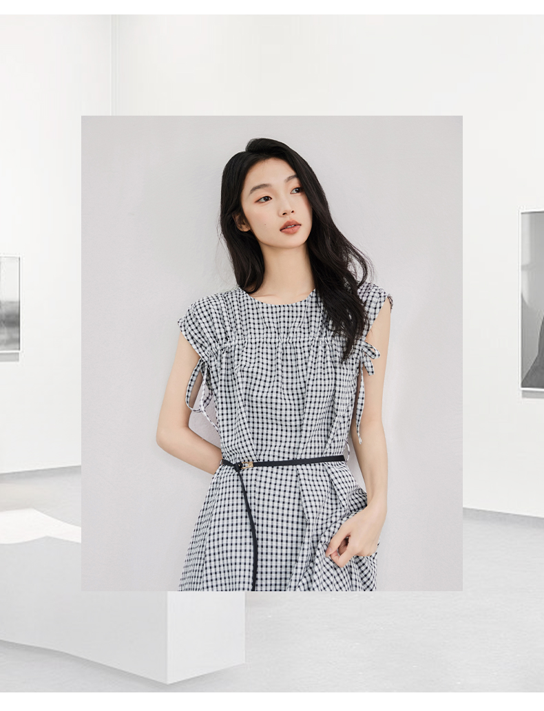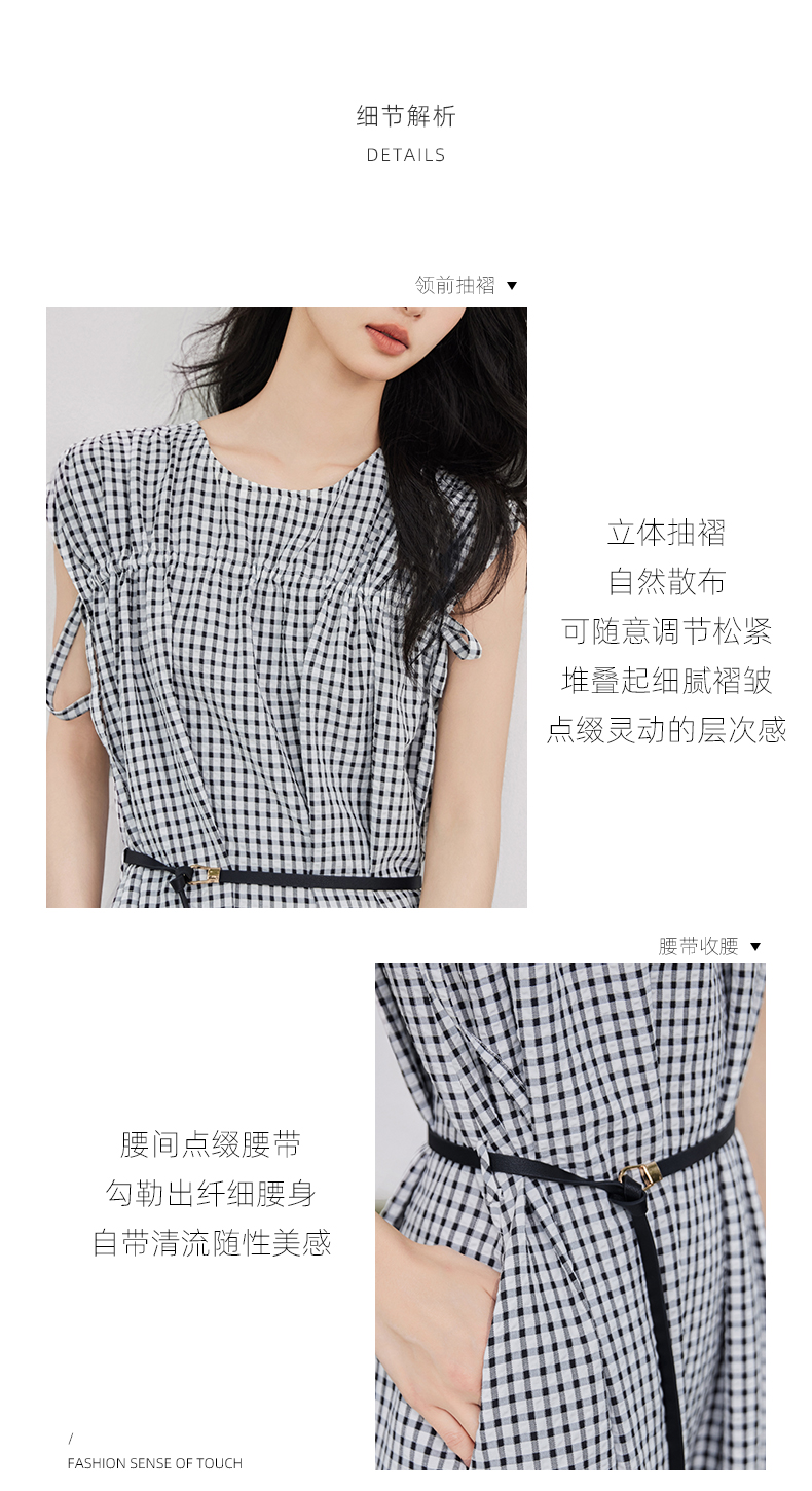 IC黑白格设计感抽褶腰带连衣裙女新款夏季慵懒宽松休闲裙子