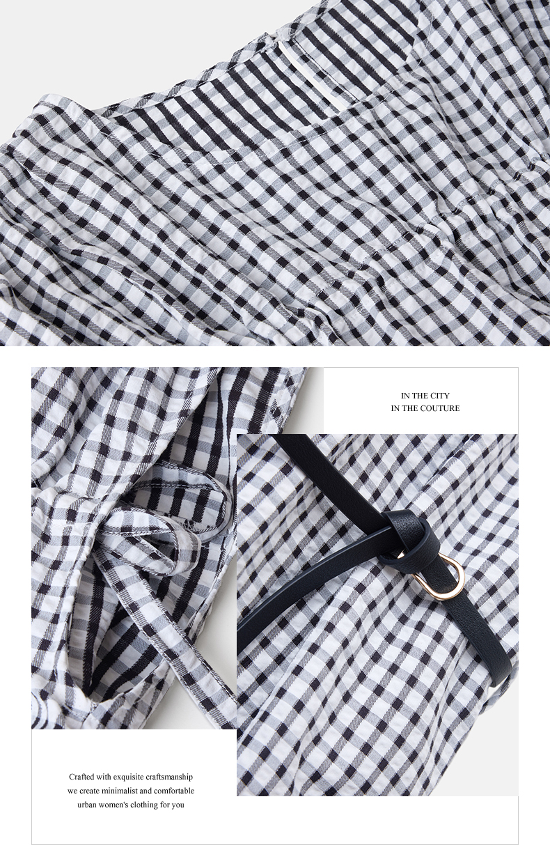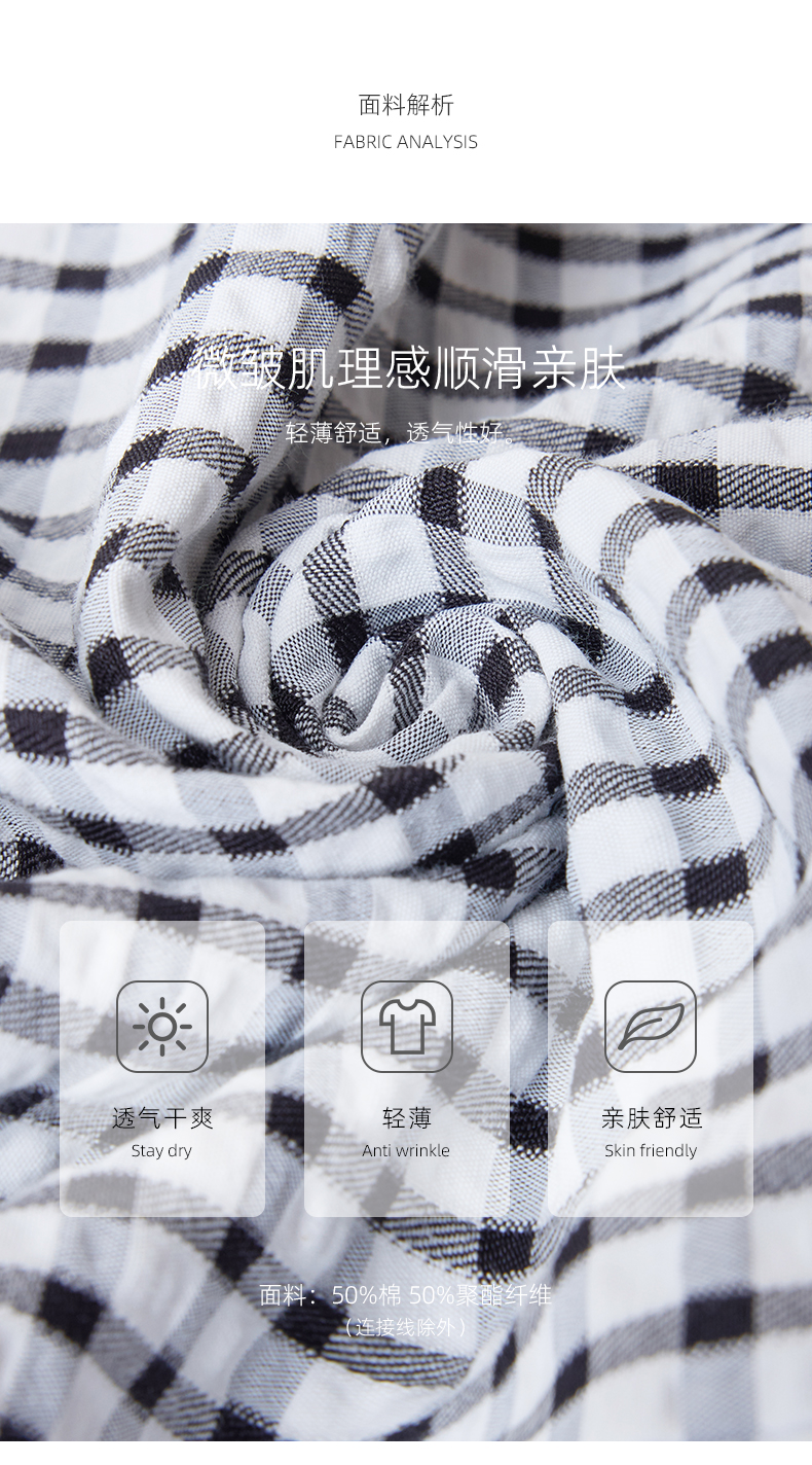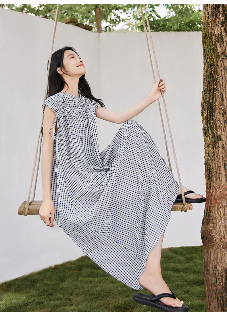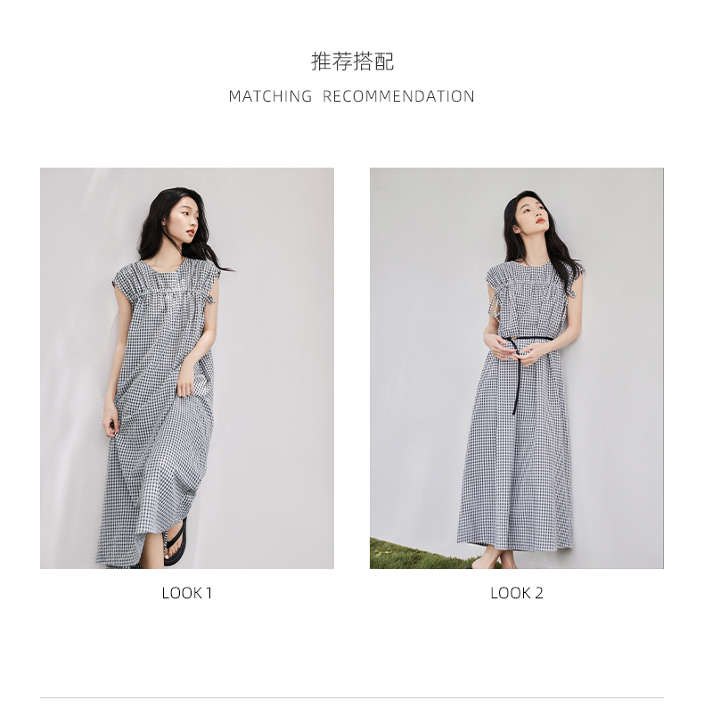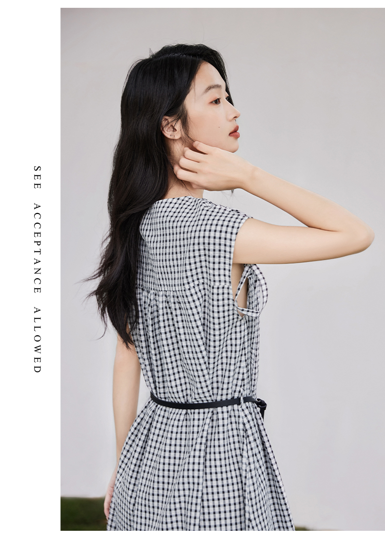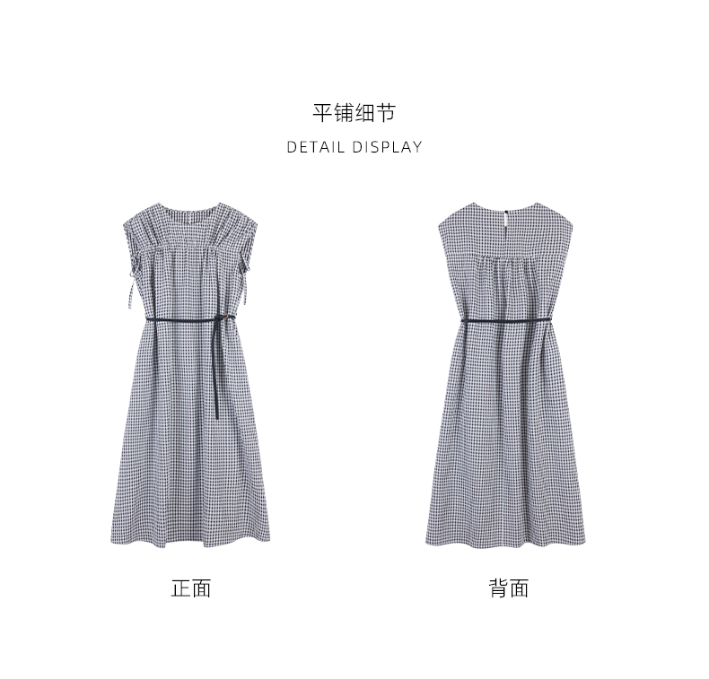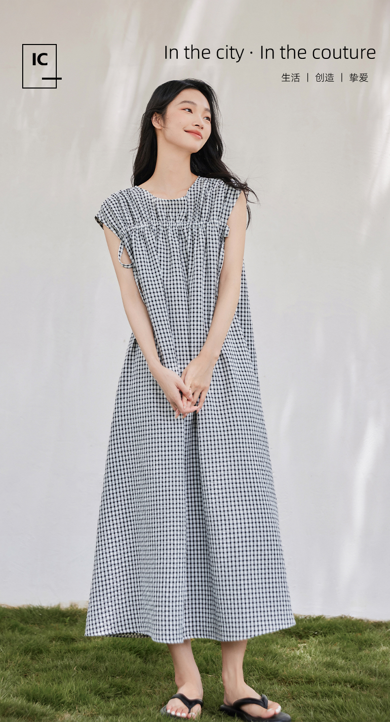 IC黑白格设计感抽褶腰带连衣裙女新款夏季慵懒宽松休闲裙子