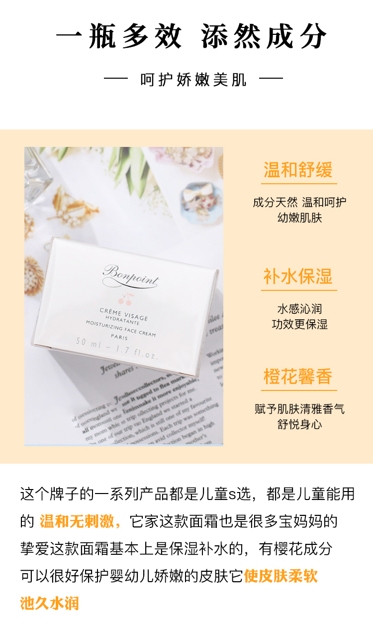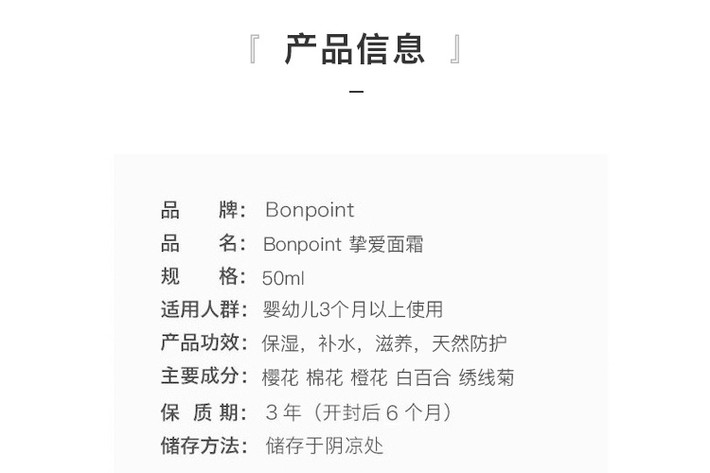 市面上的婴幼儿护肤品基本都用过,欧美的、中国的、日本的、新西兰澳洲的。 很多都是开了根本用不完都浪费了,最后都拿来当护手霜。 只有bonpoint ,全系列产品,洗发沐浴二合一沐浴、抚触油、身体乳、面霜、宝宝护手霜。无限回购!