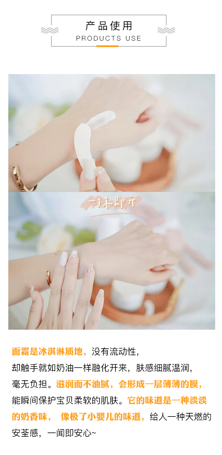 第三,豆腐质地,没有流动性,却触手就如奶油一样融化开来,滋润而不油腻,会形成一层薄薄的膜,能瞬间保护宝贝柔软的肌肤。