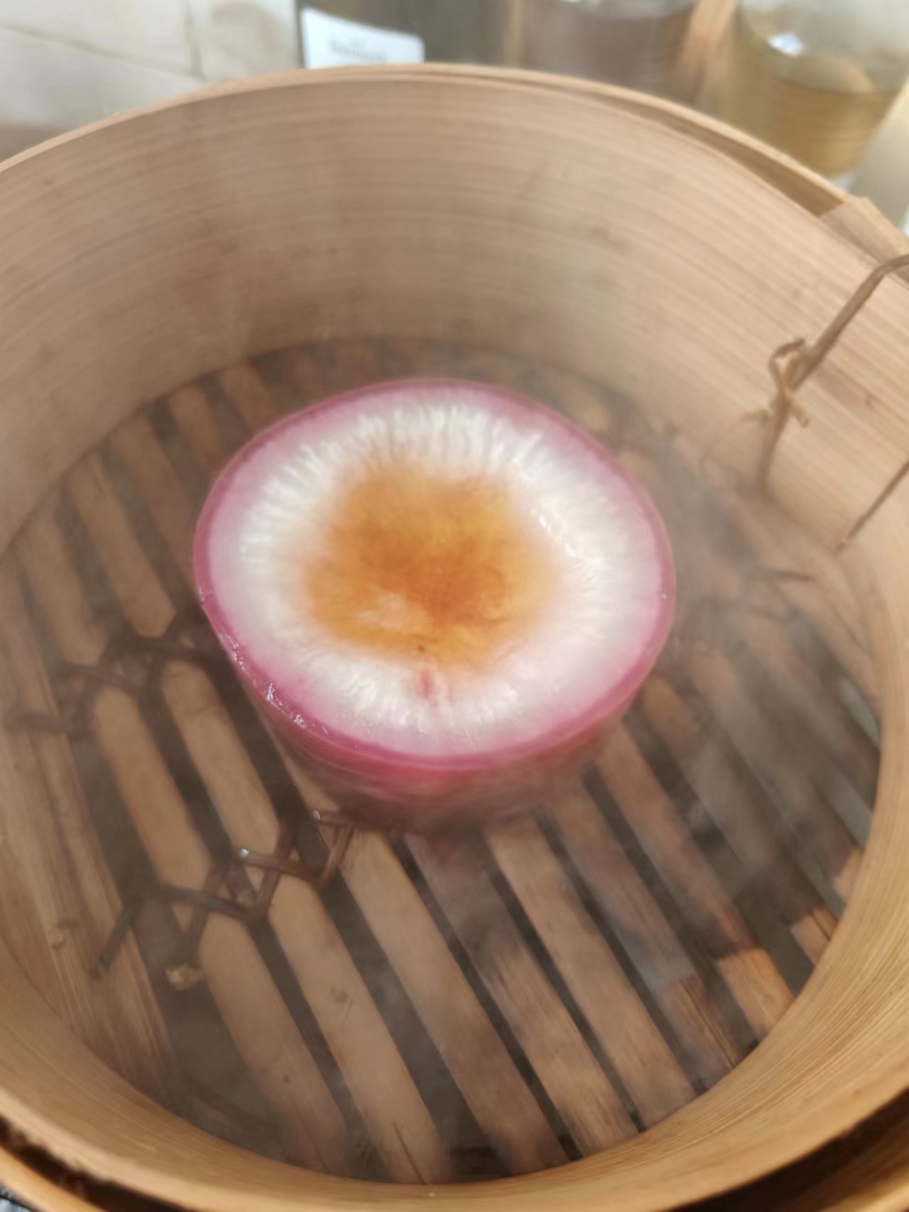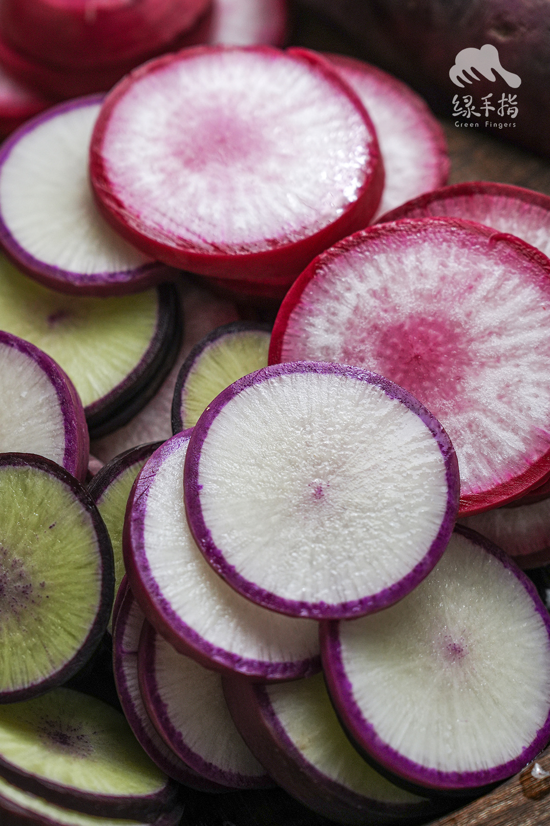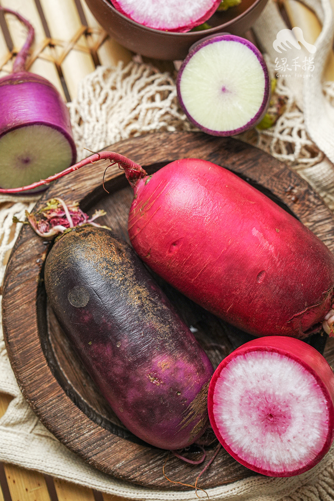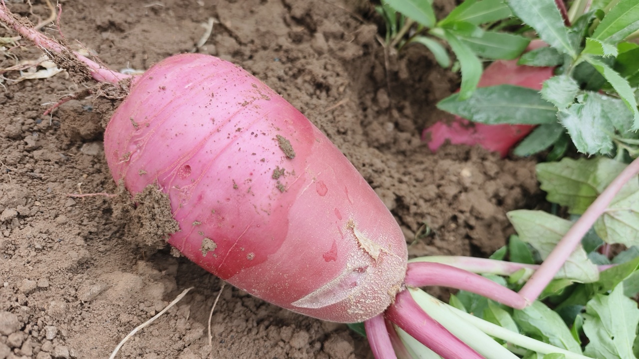 河南贺大哥家的大白菜已经到了很甜的时候,绿家已上架,还有他种植的水果萝卜也开始产出了。红的是凤梨萝卜,紫的是冰淇淋萝卜品种。这两款萝卜除了皮会有辣味,去皮后果肉都是脆甜的,没有白萝卜的辛辣感,汁水充足,可当水果生吃。