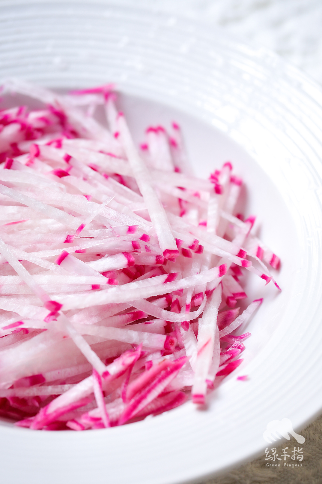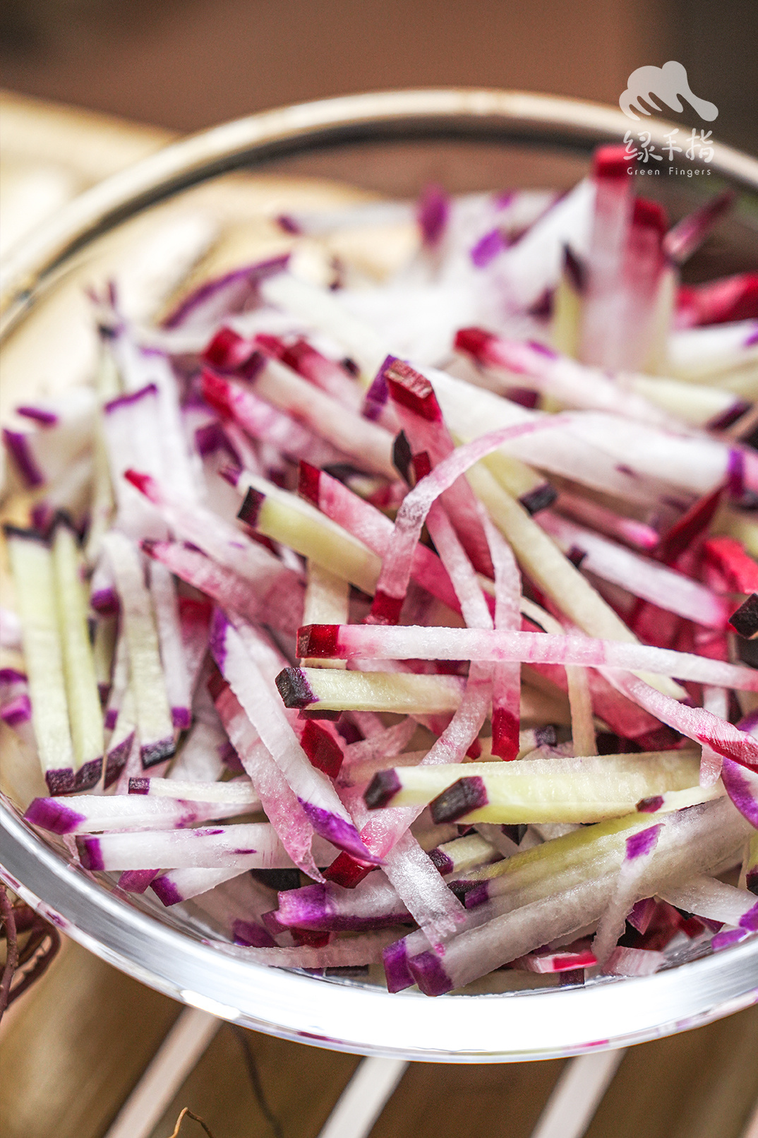水果萝卜,最家常的吃法是切片或擦丝后淋上陈醋、酱油、香油,再加点盐,拌着吃,原滋原味的凉拌萝卜就成了,这是秋冬季一道美味的素菜。