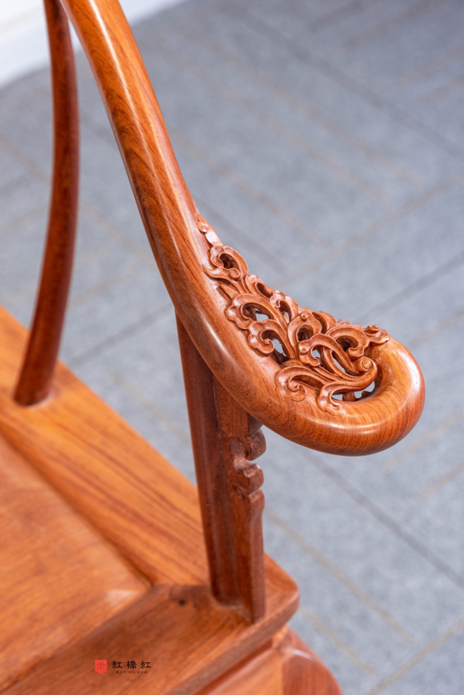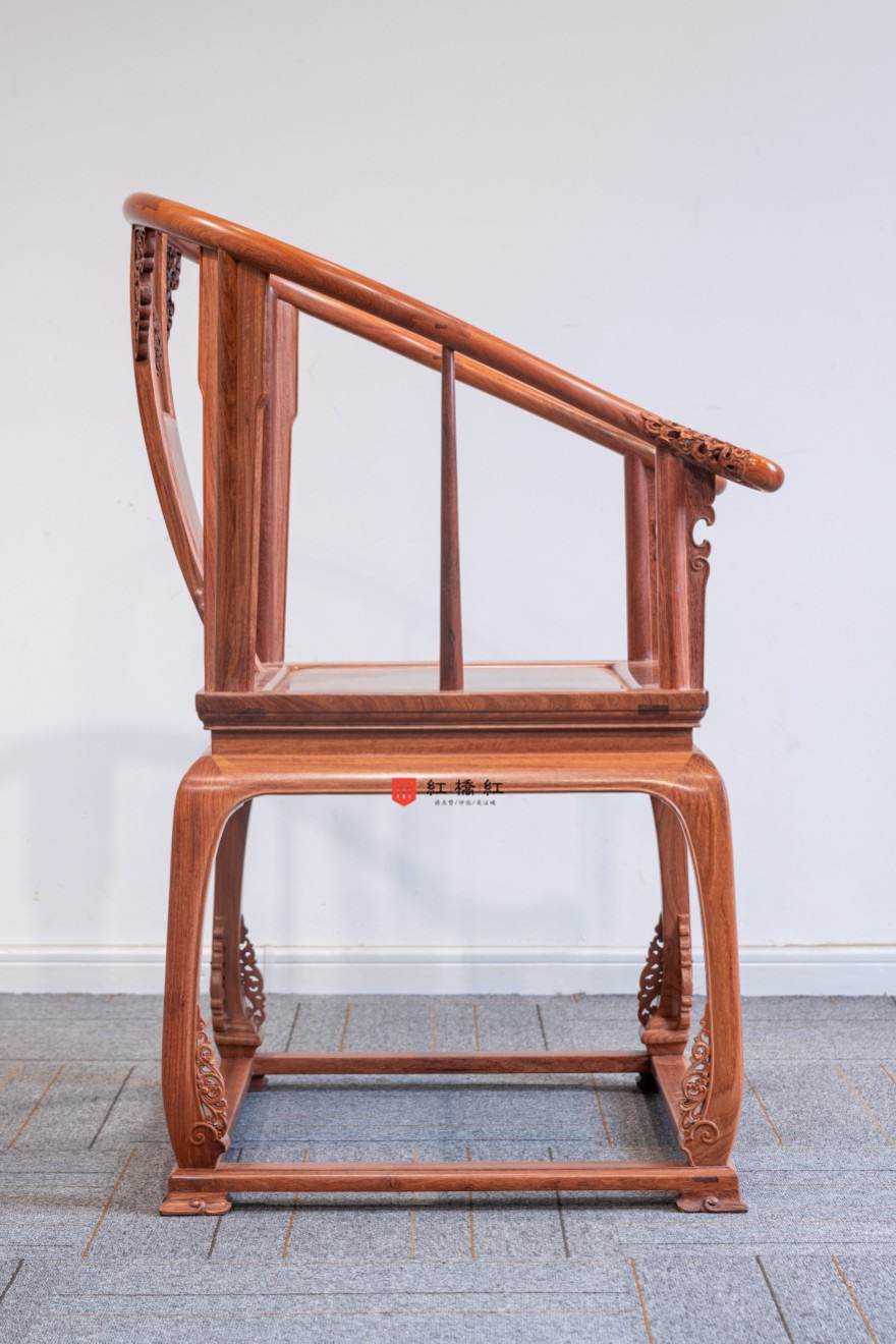 此椅靠背攒框,上截变体卷草纹,中截光素,下截亮脚,轮廓似蝙蝠倒挂,装四块镂空角牙强化正面装饰效果。扶手出头及四足马蹄处镂雕卷草纹,经脉分明,干净利索。椅圈及联帮棍江河一泻,如月如弓,呈环抱有情,拱扶有义之势,整体线条较之其它的明式圈椅更为平直、厚重,堪称宫廷造办处的精细、秀雅代表作。