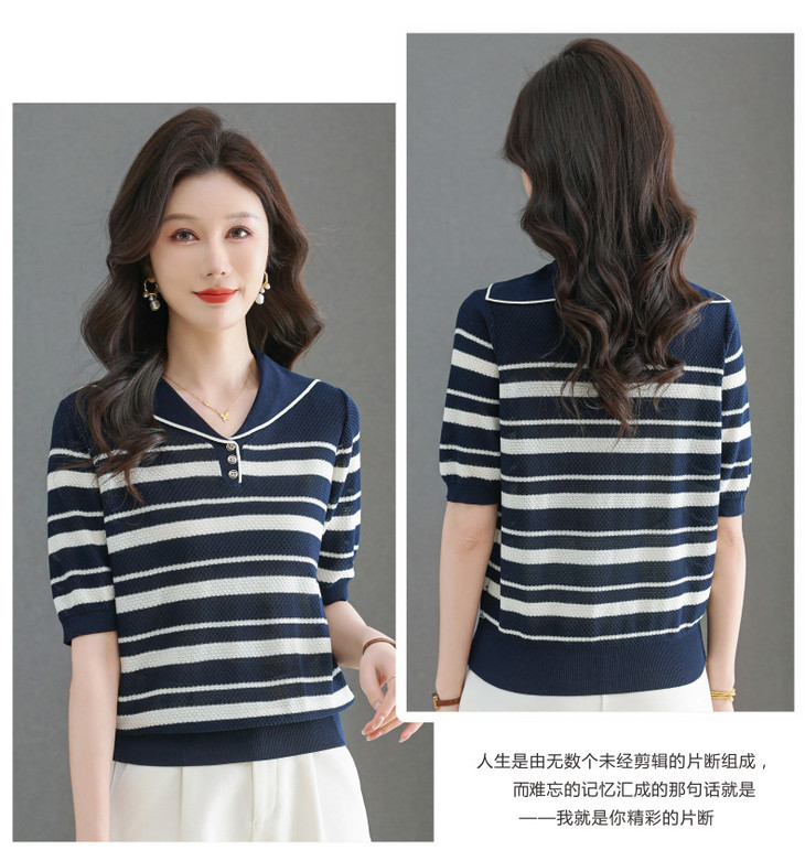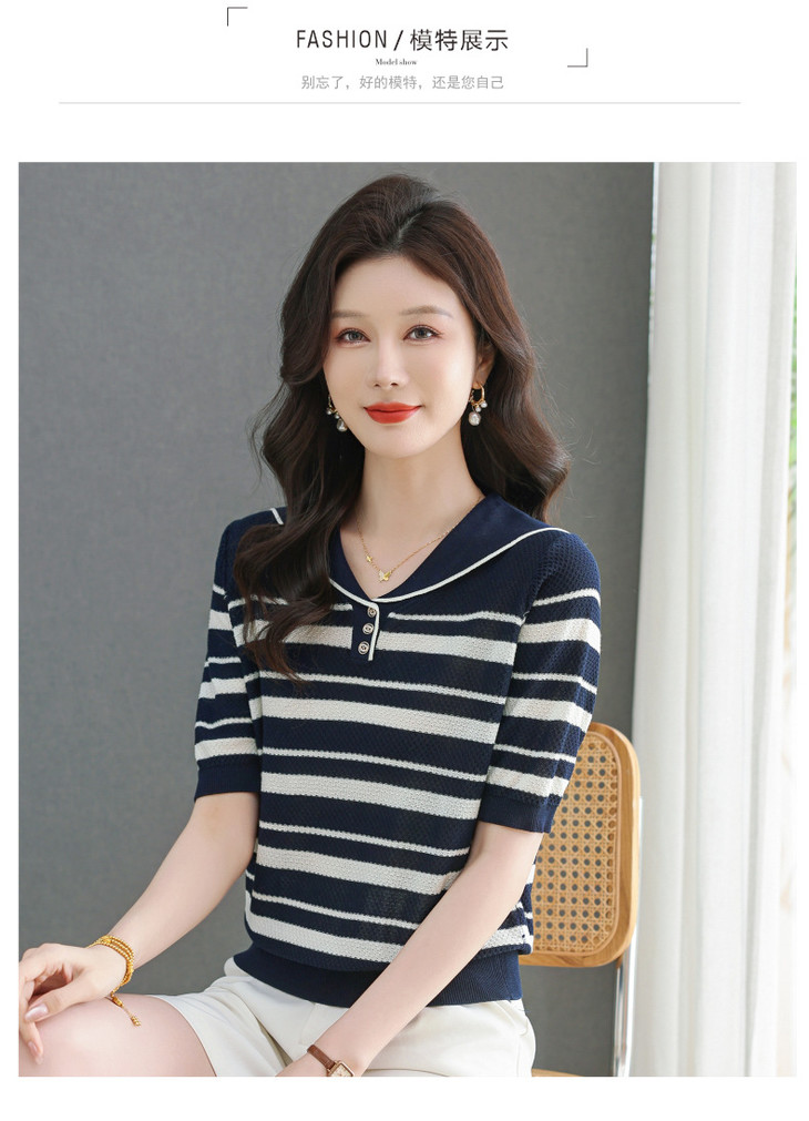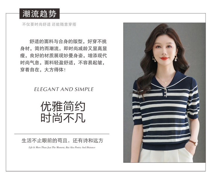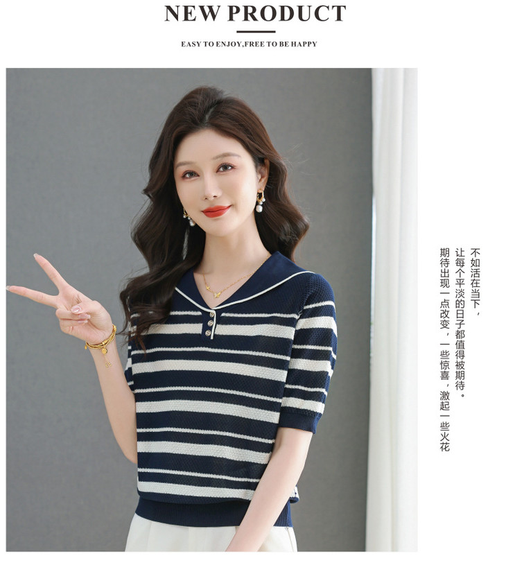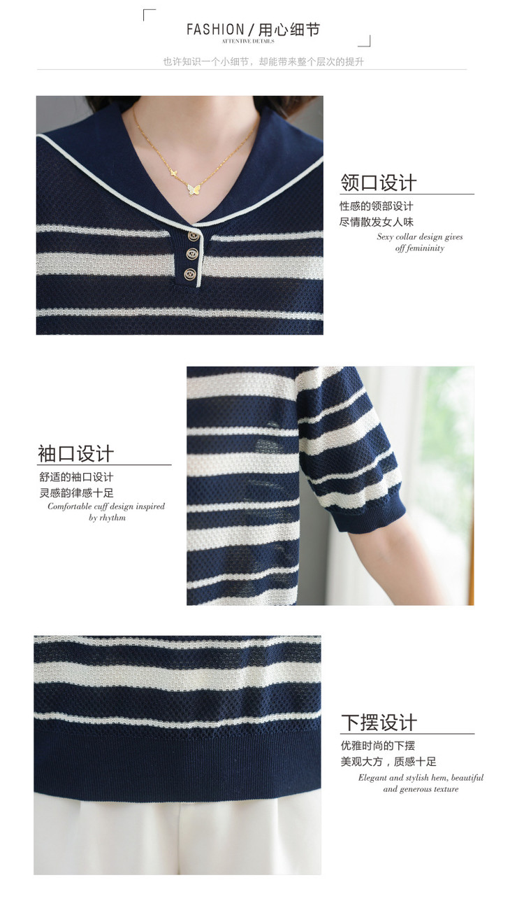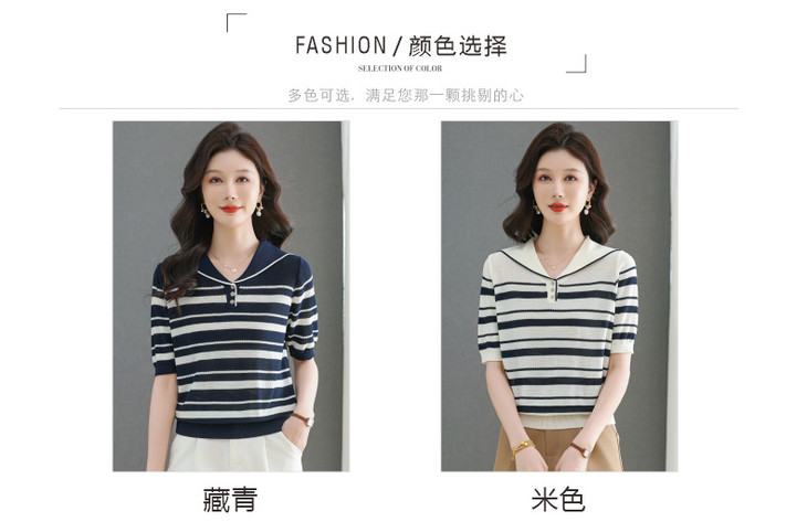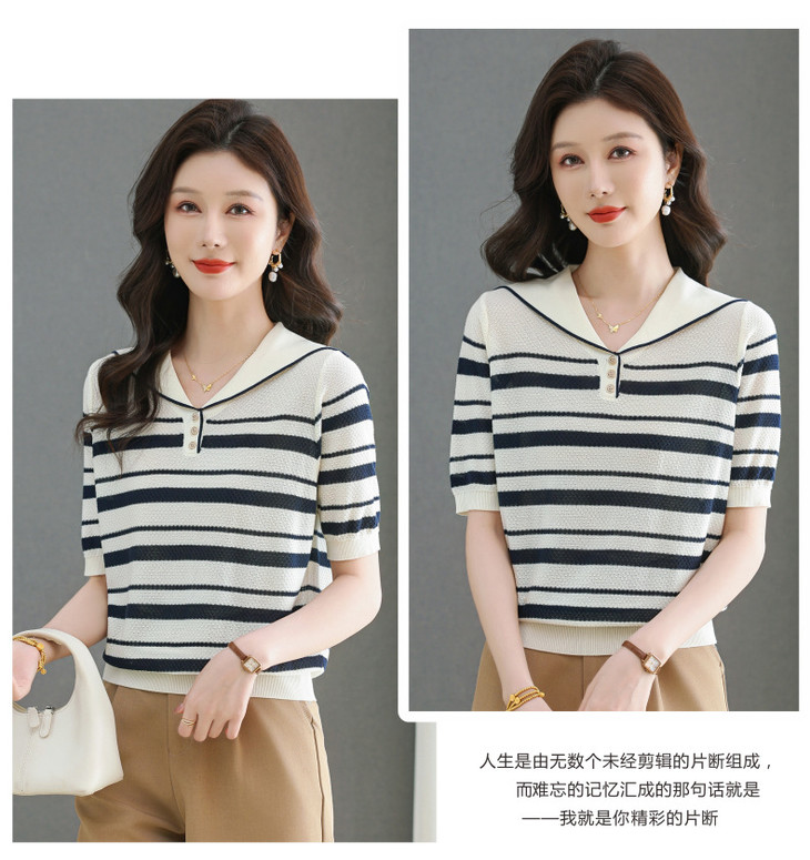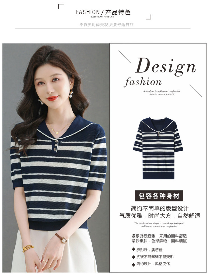 冰丝短袖t恤,洋气海军领减龄针织条纹显瘦上衣CC2563