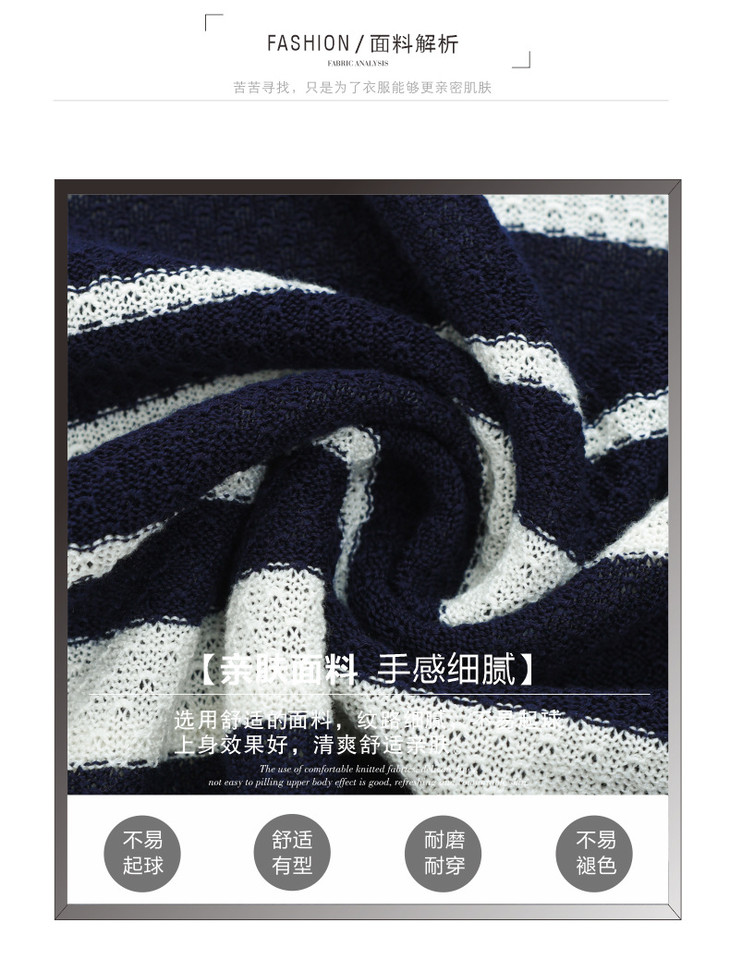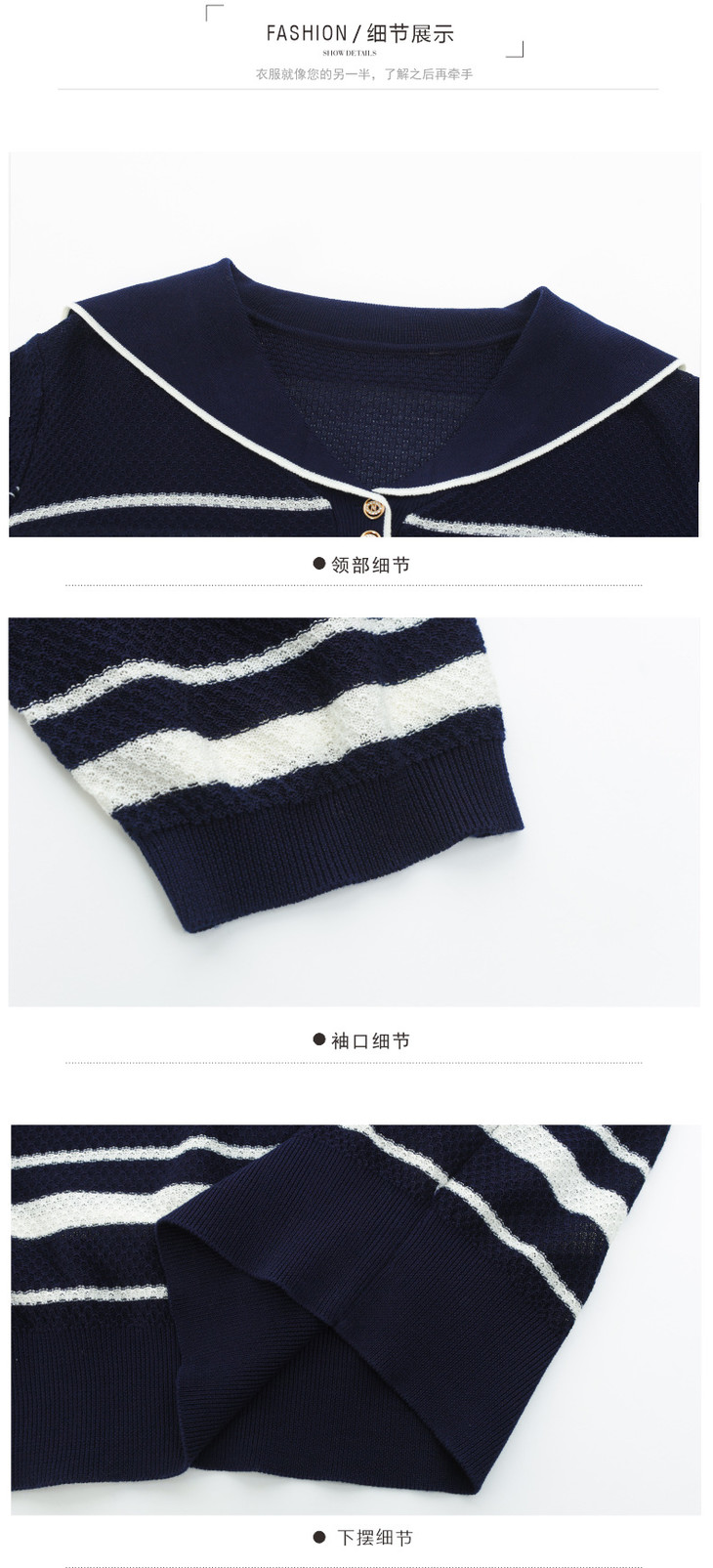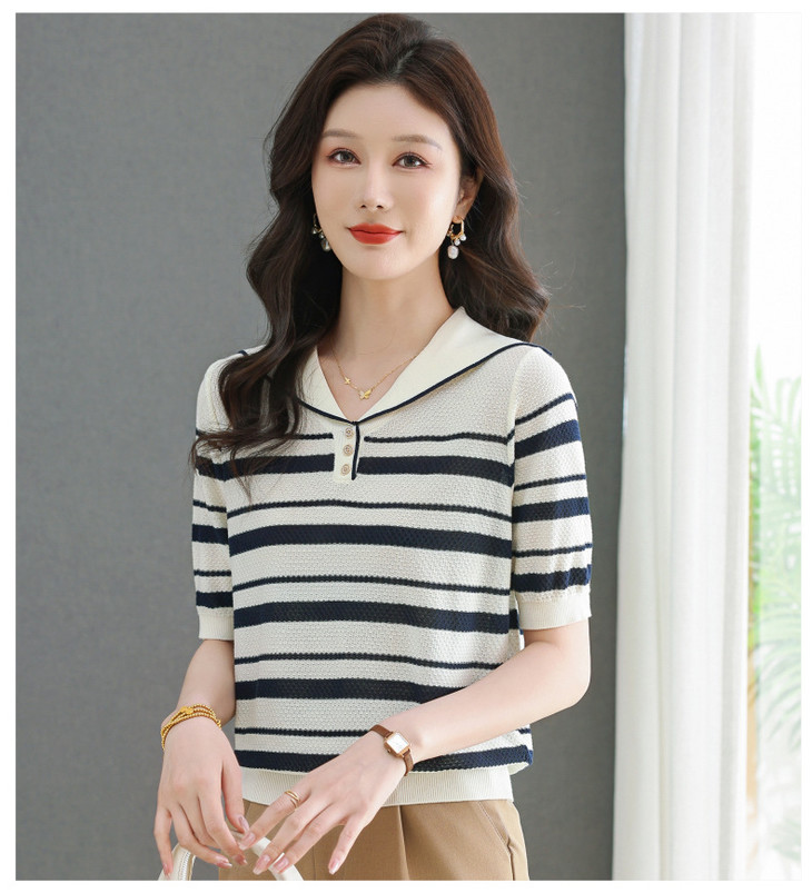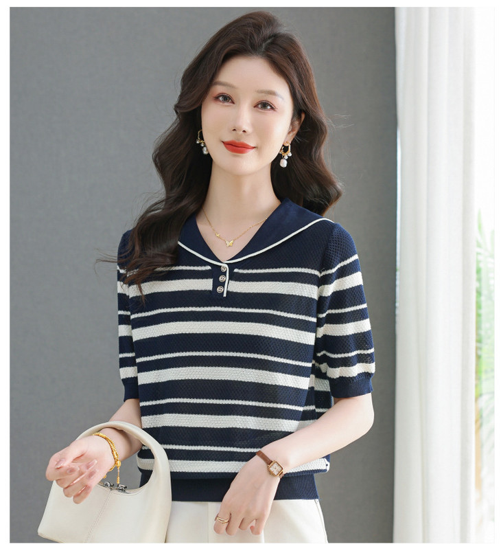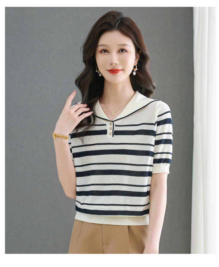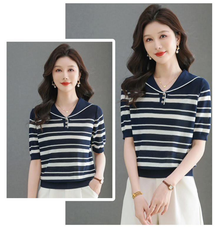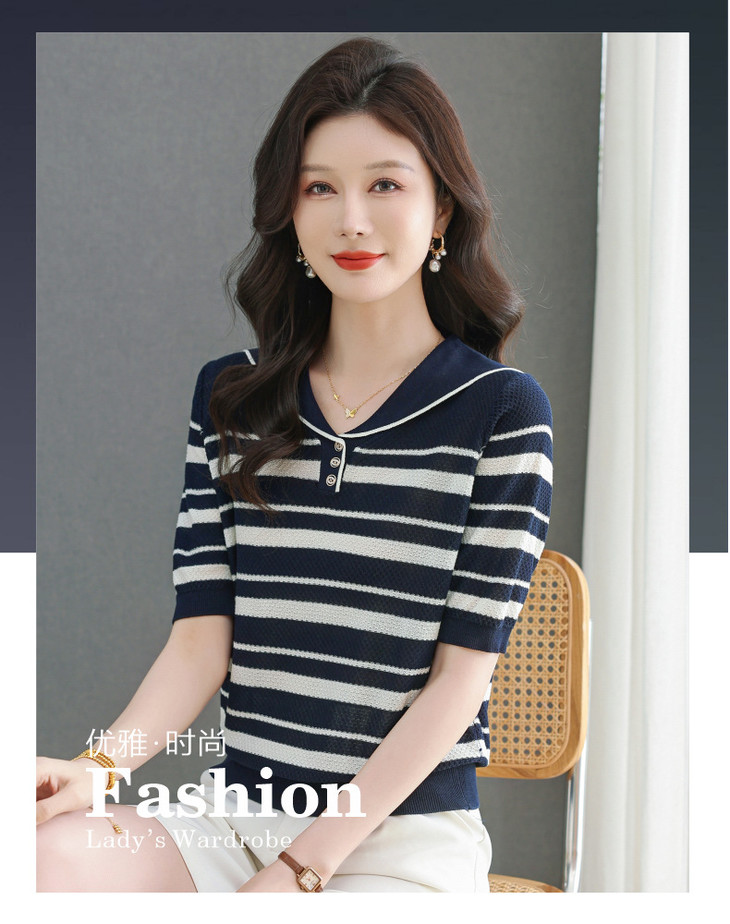 冰丝短袖t恤,洋气海军领减龄针织条纹显瘦上衣CC2563