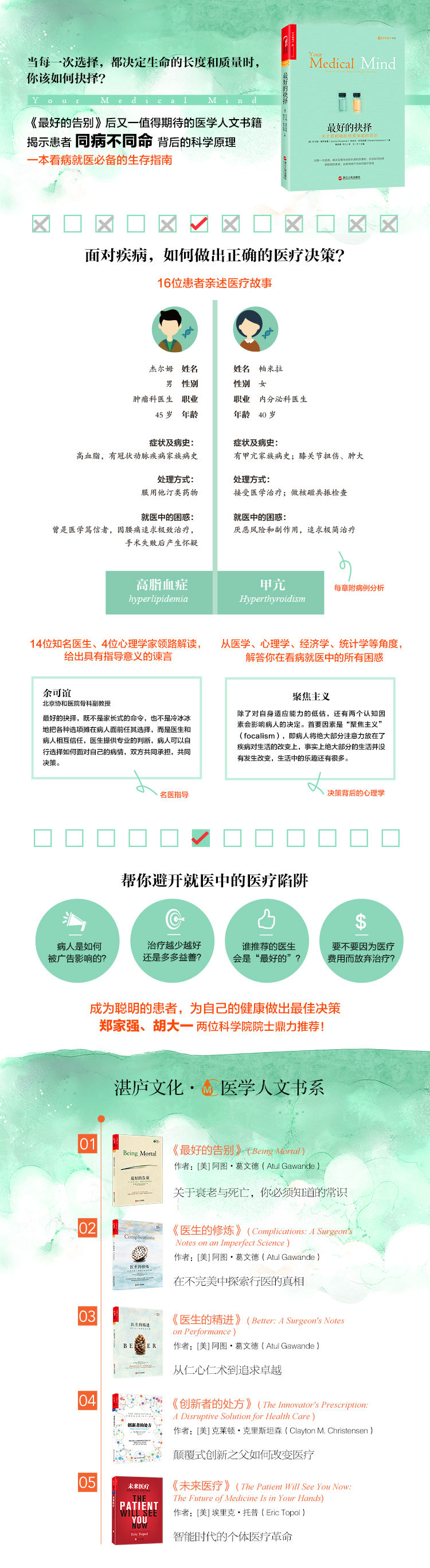 书中两位哈佛医学院教授,通过亲访追踪16位高胆固醇、甲亢、乳腺癌、肝癌等患者,从医学、心理学、经济学、统计学等角度,分析比较了不同职业、背景的患者在面临相同医疗问题时的不同选择,揭示了患者同病不同命背后的种种决定力量,提出了有指导意义的谏言。