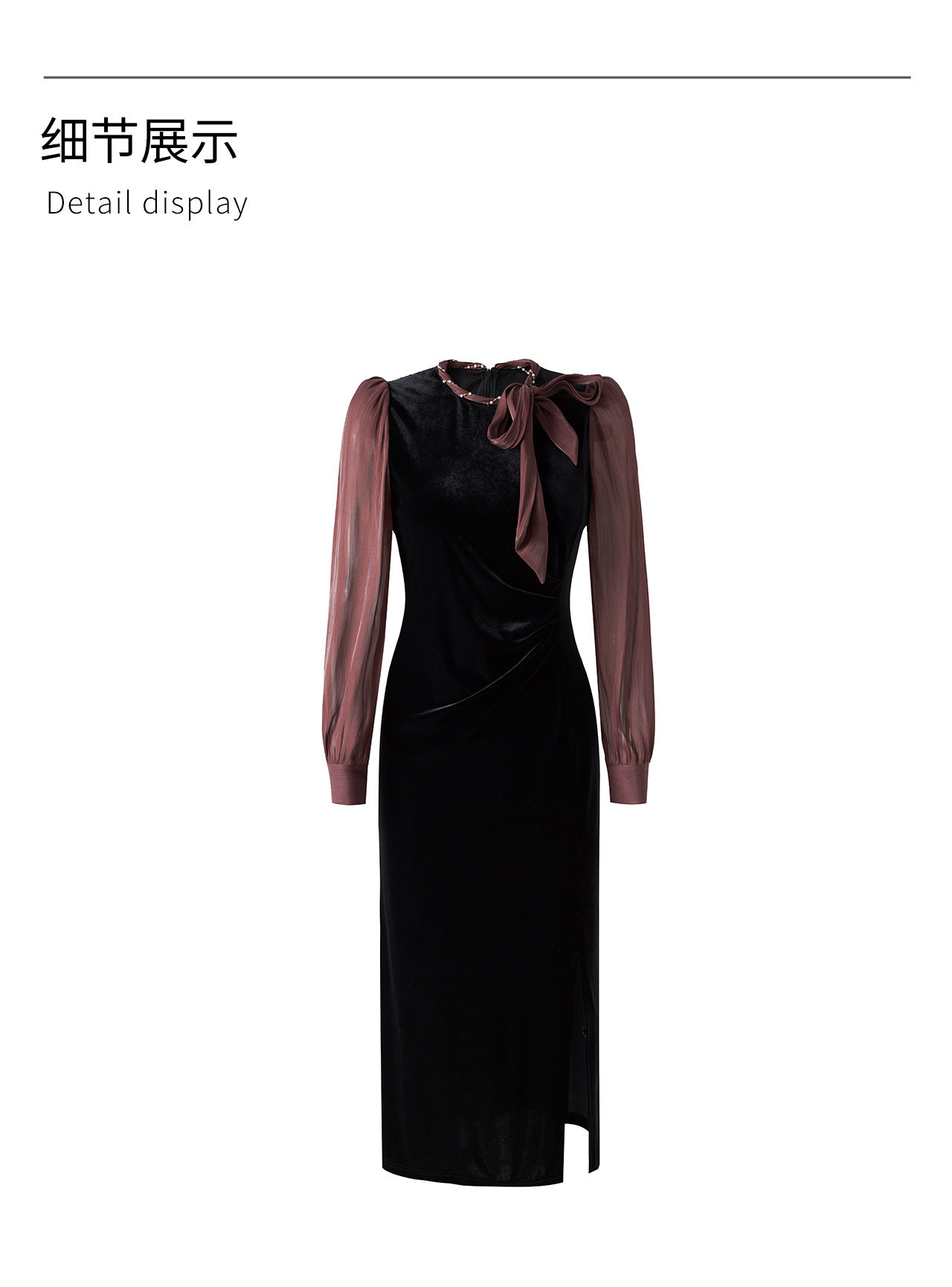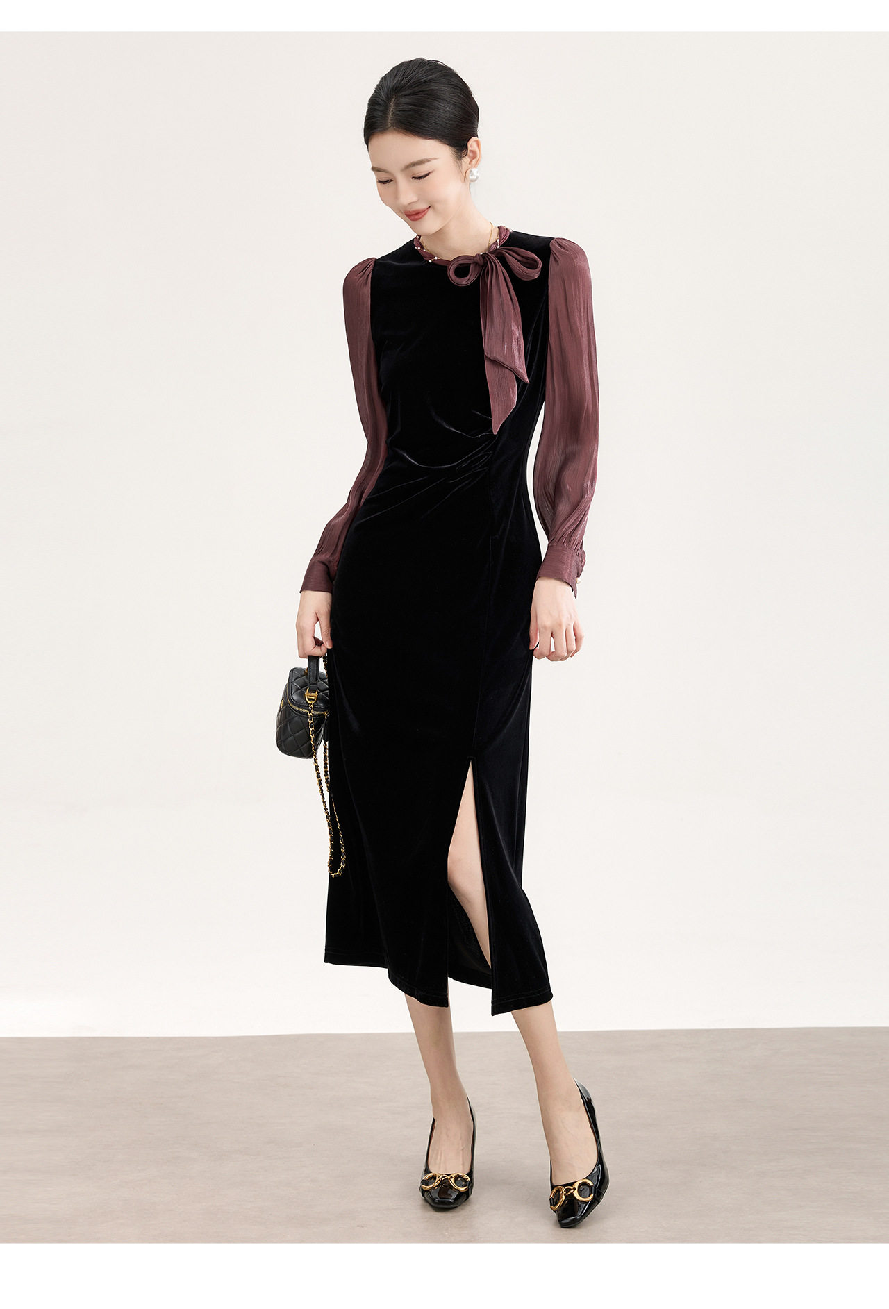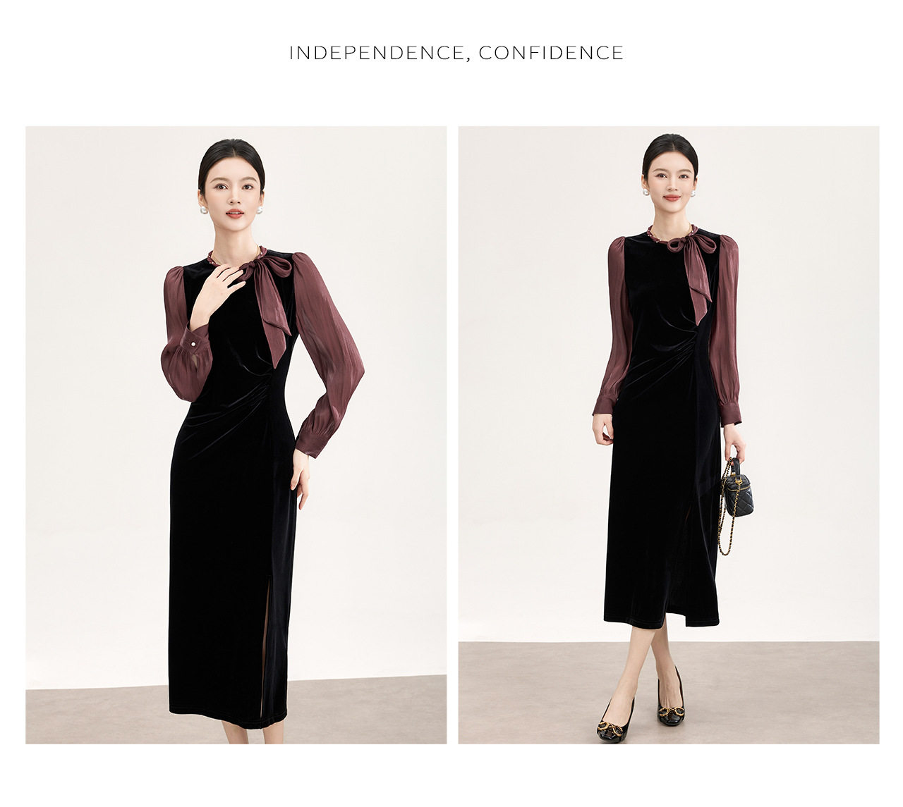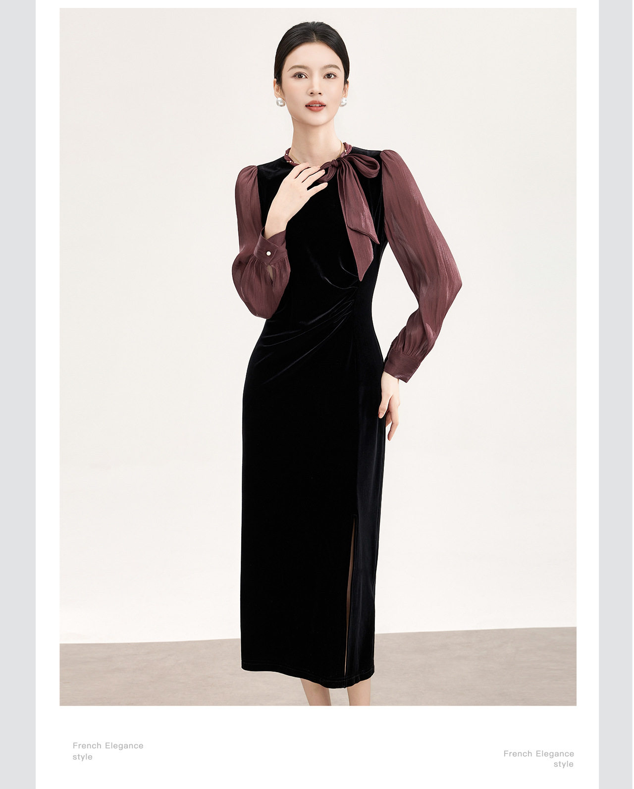 「高货wl」全新升级【铂金会员321/天猫429/差价108】(00425)洛诗琳2026春季法式蝴蝶结系带领丝绒拼琉璃纱开衩连衣裙