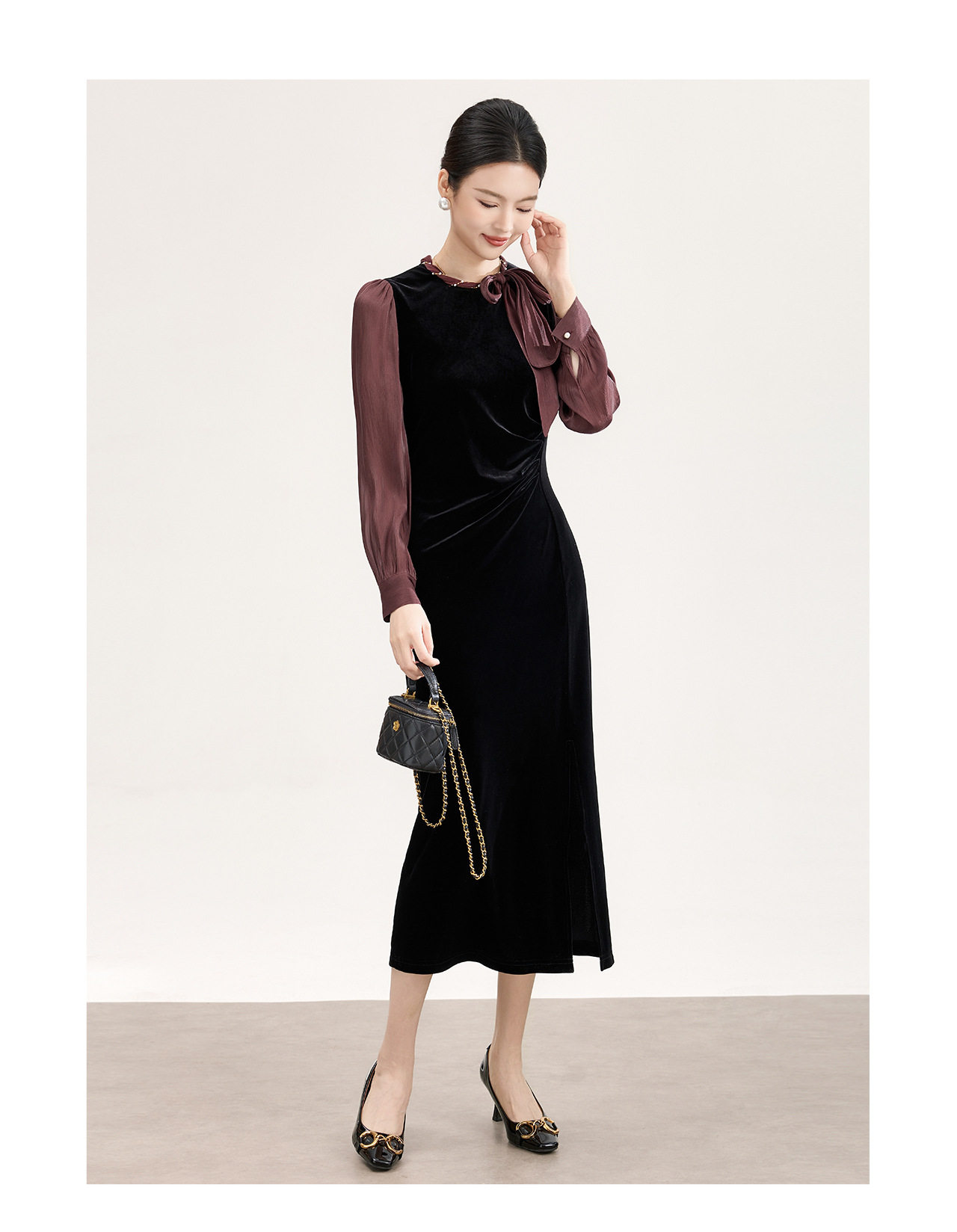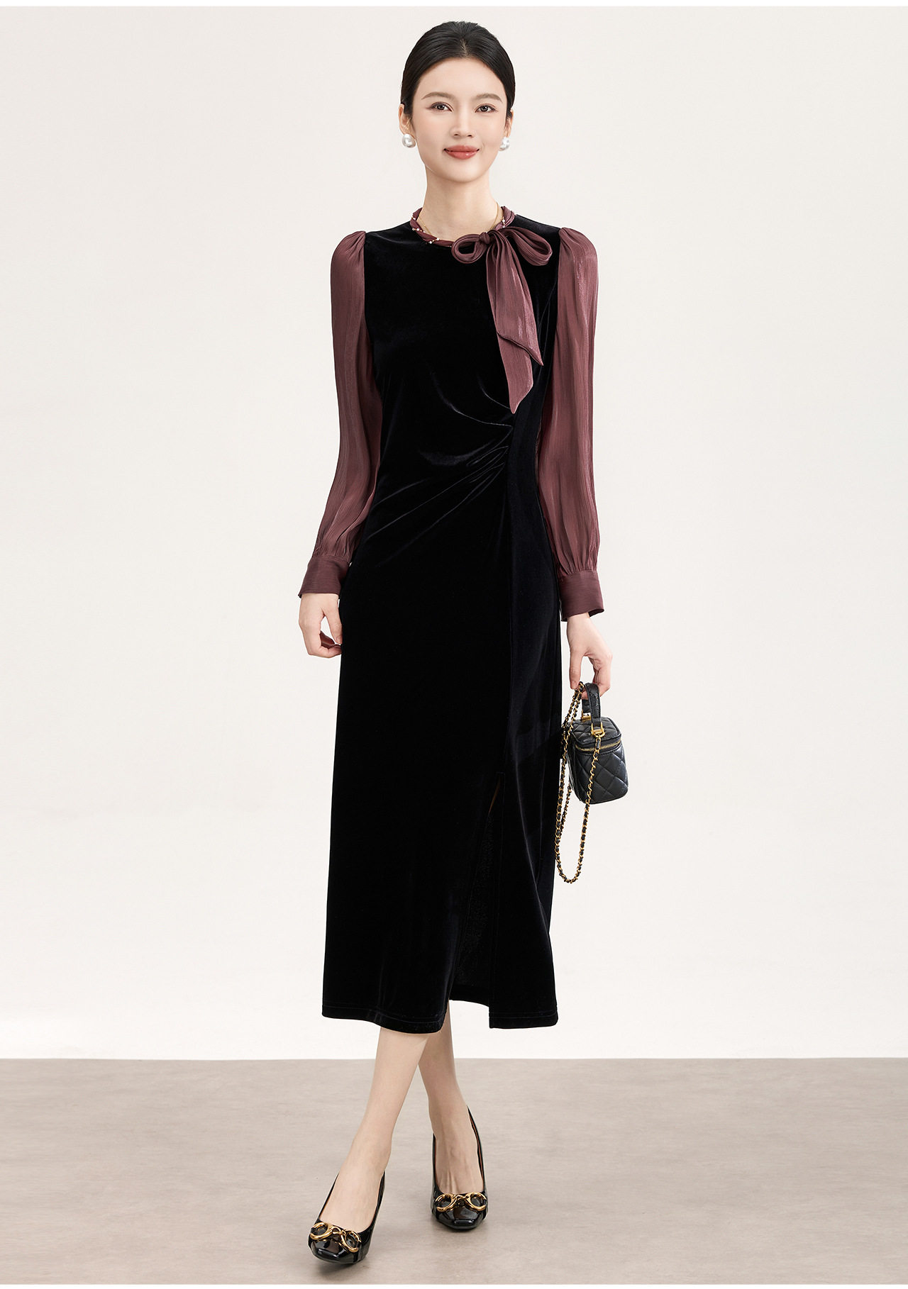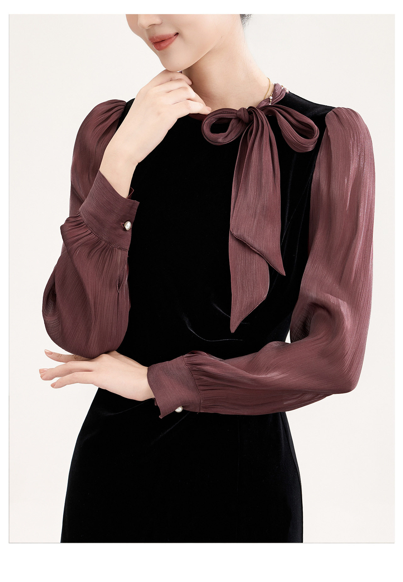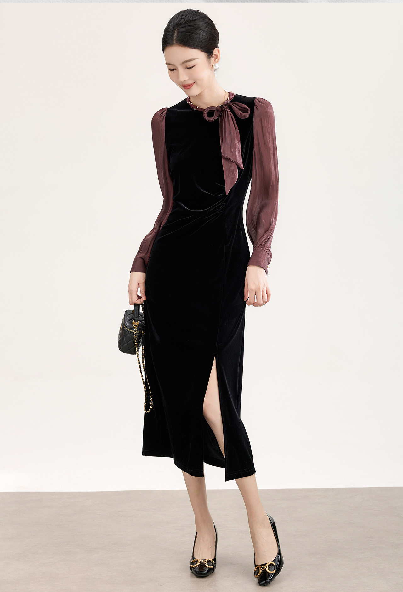 「高货wl」全新升级【铂金会员321/天猫429/差价108】(00425)洛诗琳2026春季法式蝴蝶结系带领丝绒拼琉璃纱开衩连衣裙
