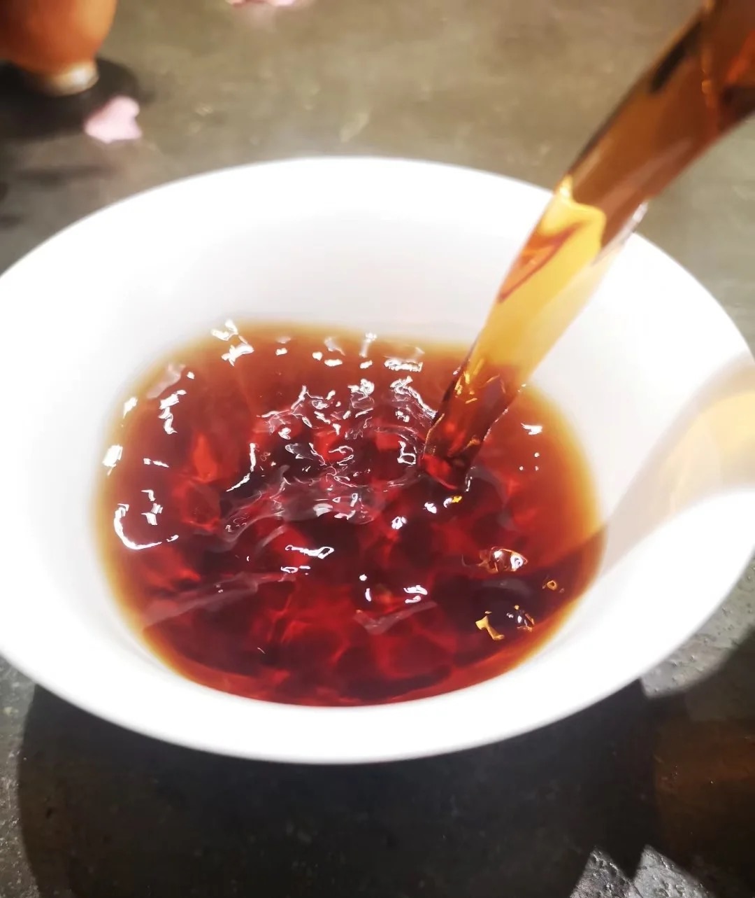 冲泡此茶,2-3次洗茶,浮尘尽去,汤色渐显明亮,栗红通透。耐泡平稳,20泡以后茶汤依旧浓艳绵软。如果再继续煮上三五开,那真是物尽其用,滋味更是醇厚绵密,焦糖香显,喉间清润,中甘甜