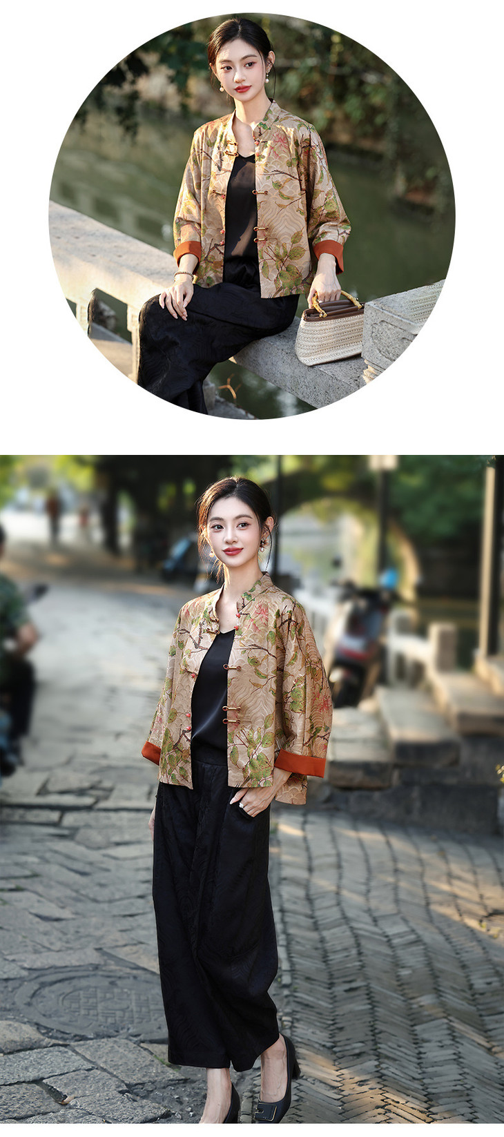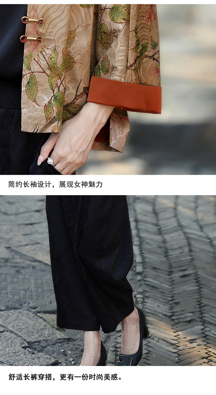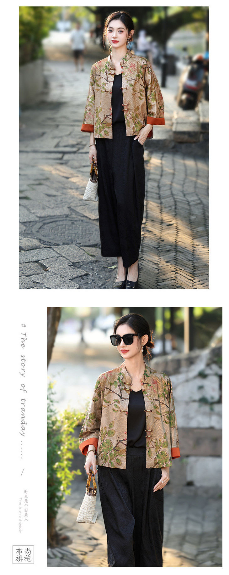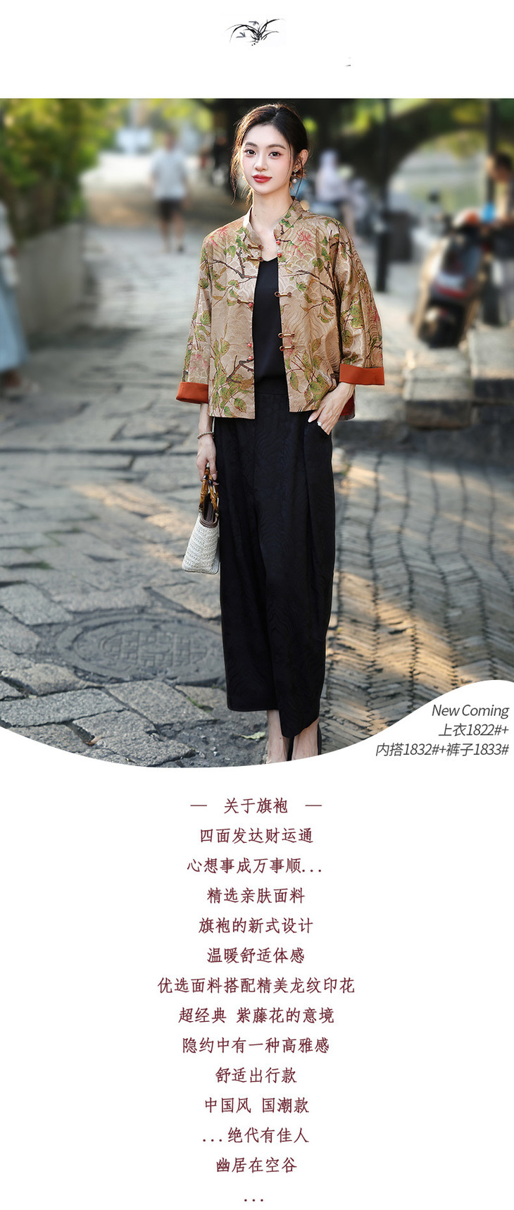 新中式国风立领印花旗袍,盘扣外套内搭裤子三件套MYJ-260