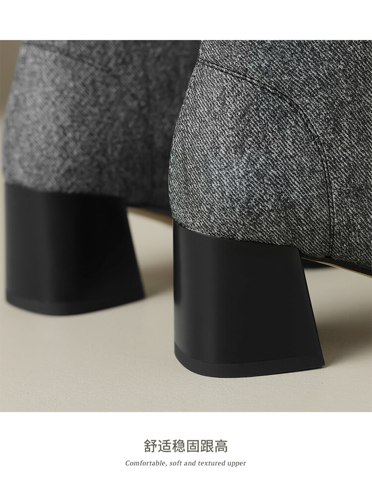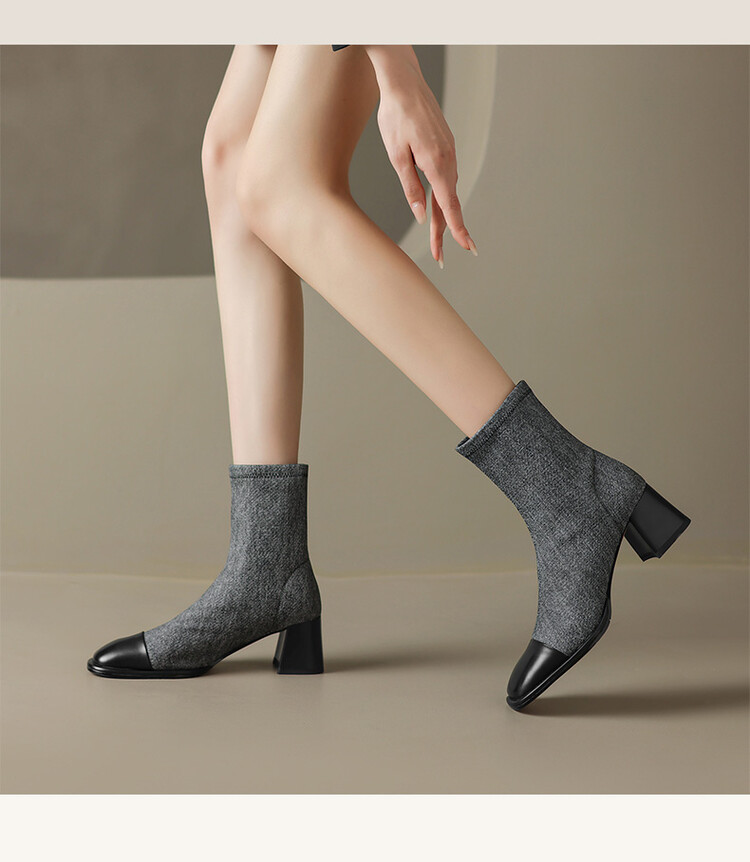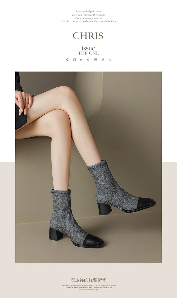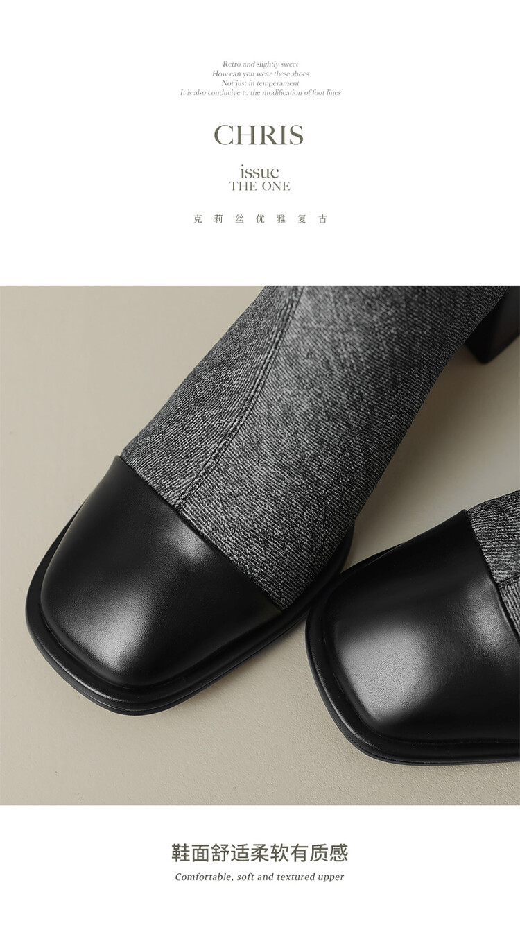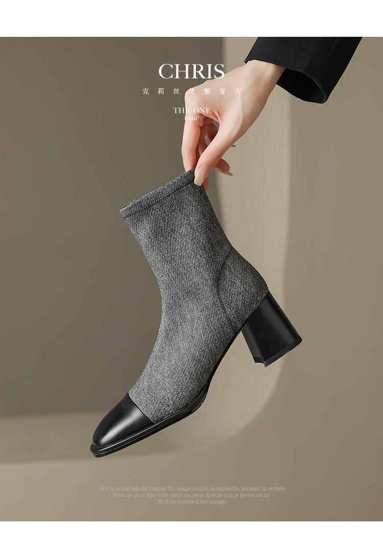 【预售5天】秋冬新款拼接方头粗跟短靴女高跟弹力瘦瘦靴YS&5955