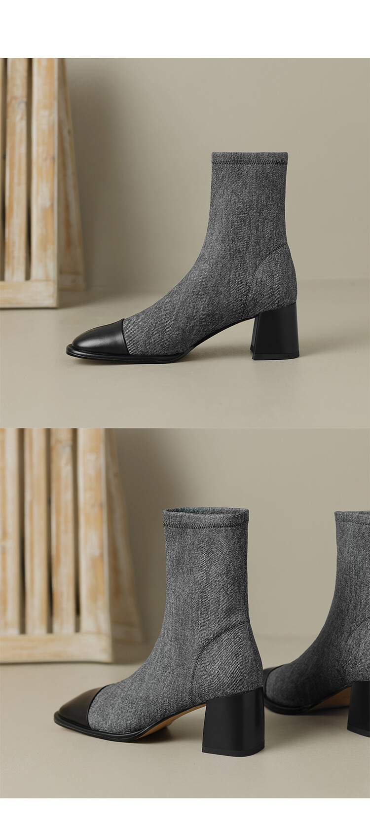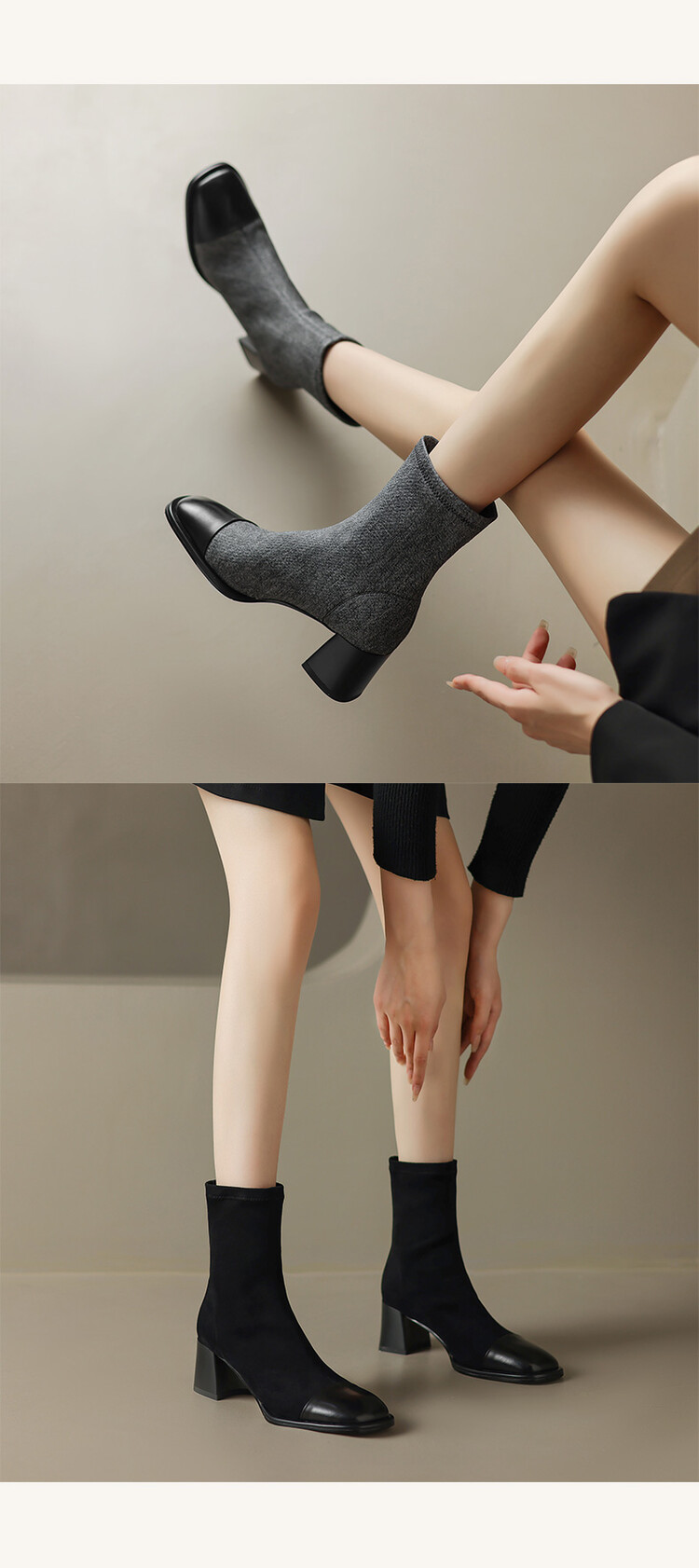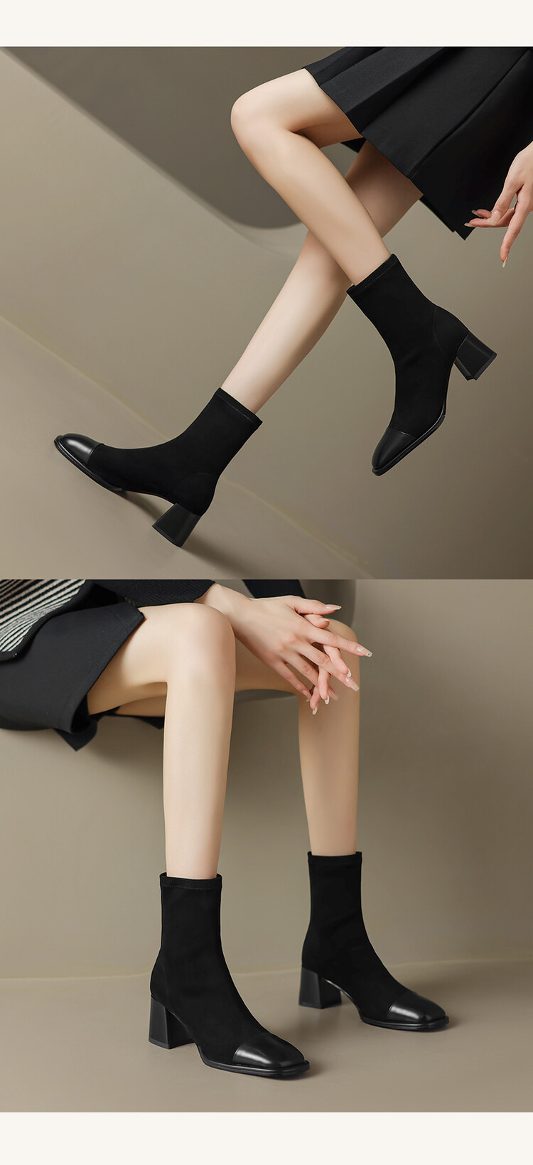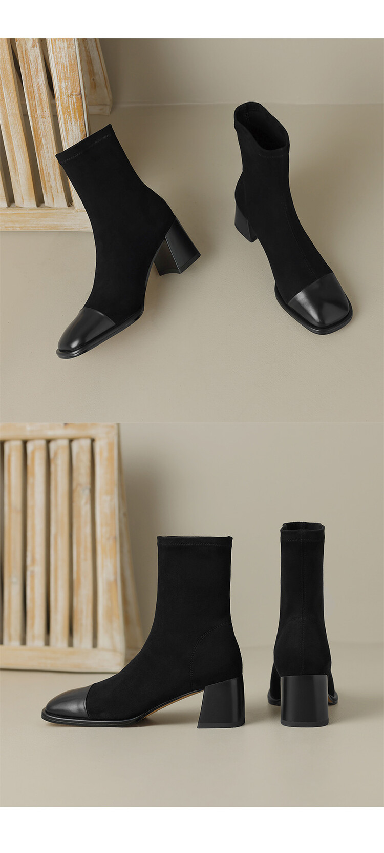 【预售5天】秋冬新款拼接方头粗跟短靴女高跟弹力瘦瘦靴YS&5955
