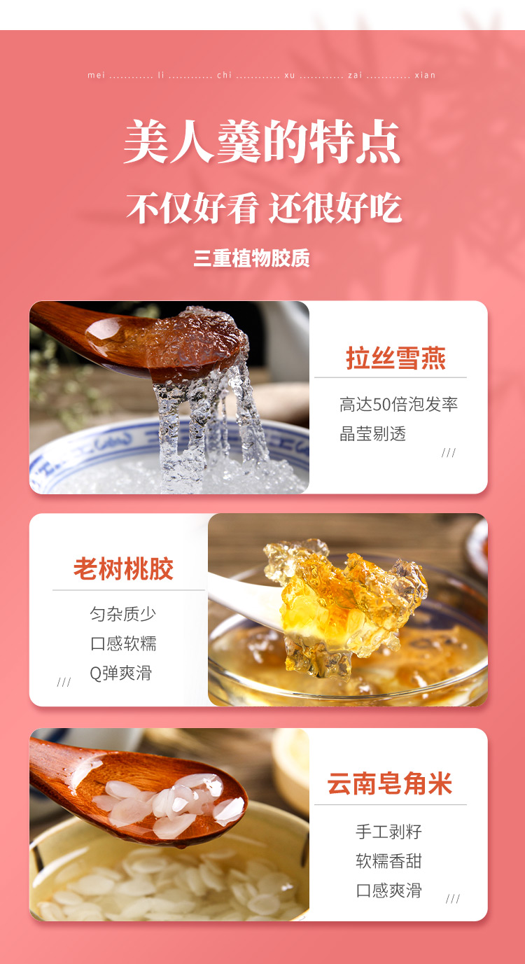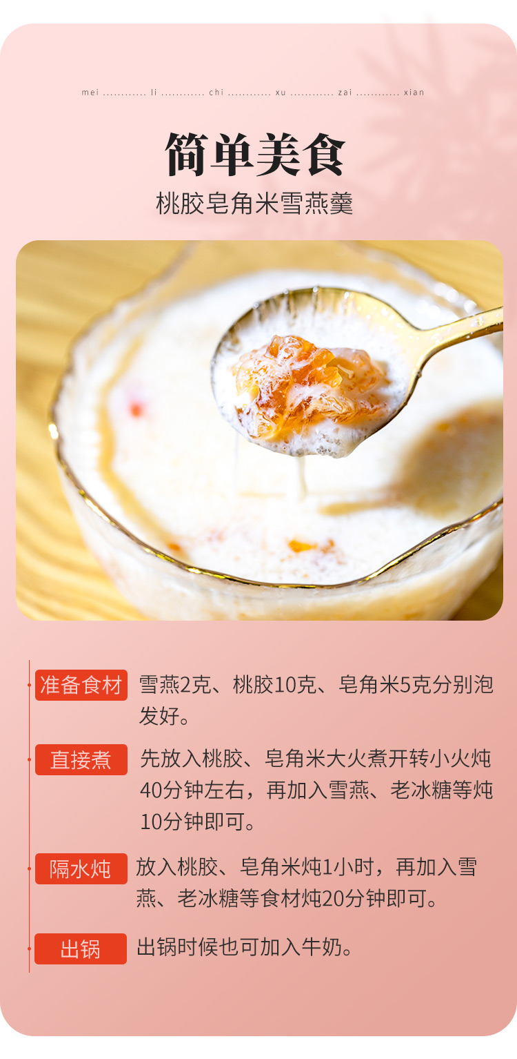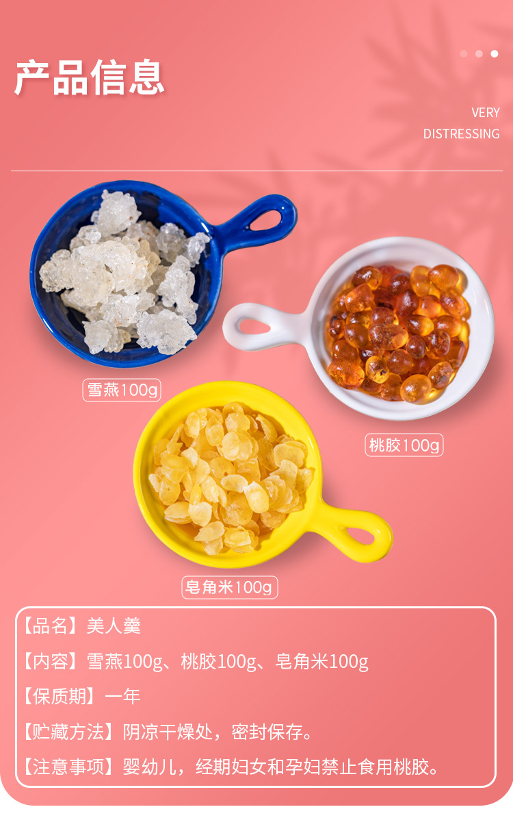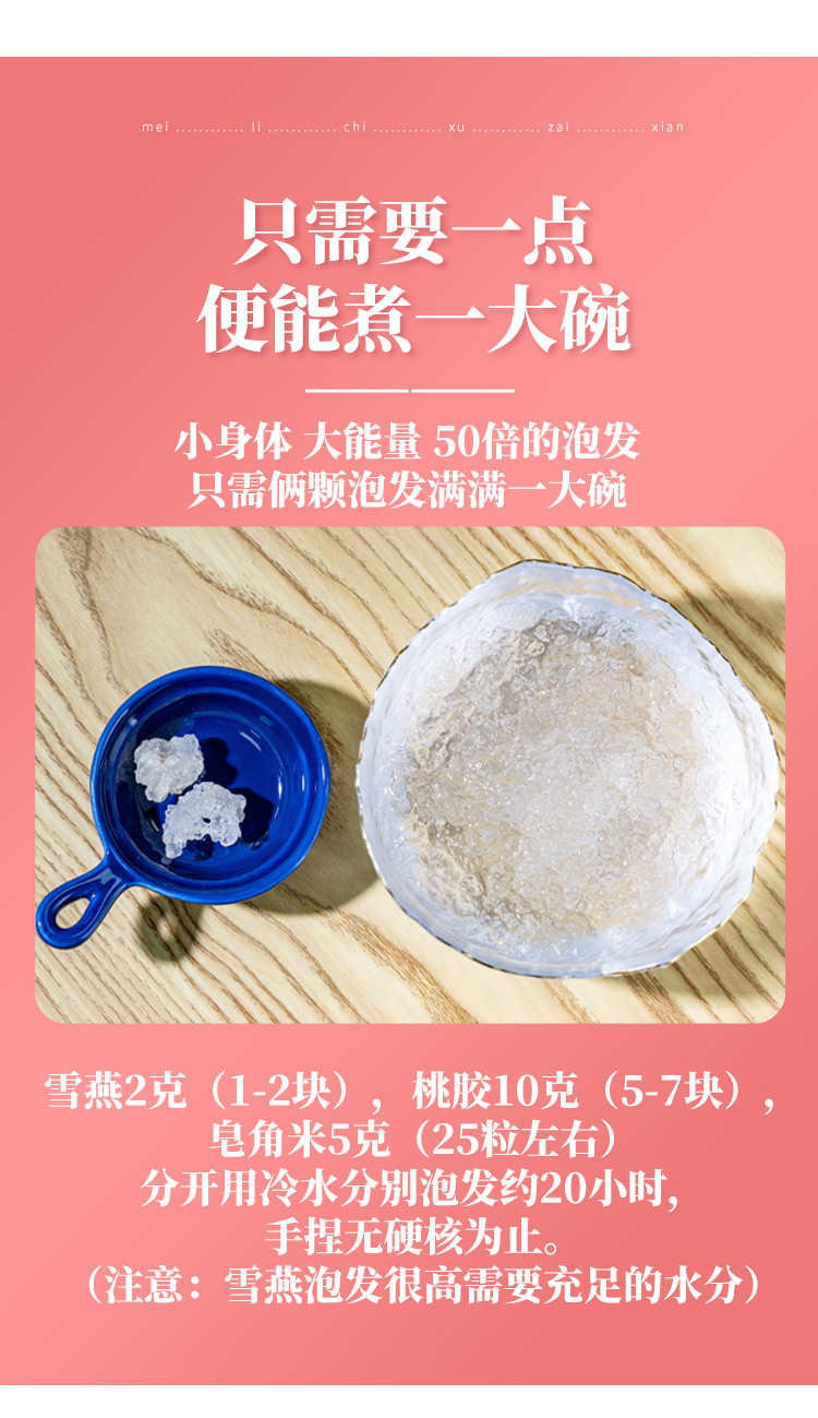 | 【品名】鲜珥家雪燕桃胶皂角米组合 【规格】100g*3罐 【保质期】12个月 【储存方法】阴凉干燥处,密封保存 【产地】福建 【发货地】福建 【发货快递】申通、圆通、韵达、邮政 【不发货区域】新疆、西藏、港澳台不发货 【补邮费地区】青海+10元/件,内蒙、甘肃、宁夏+5元/件,北京+2元/件 【发货时效】48小时,节假日顺延 【注意】婴幼儿、经期妇女和孕妇禁止食用桃胶。 【售后】产品不支持七天无理由退货 |