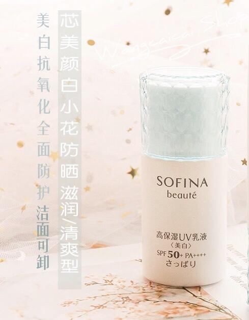 日本SOFINA苏菲娜芯美颜日间防护乳SPF50白小花防晒霜面部清爽型30ml💋 味道是淡雅花系香芬, 淡淡的香味很舒服,不会太浓太香。 🍭 质地是属于水润型,擦的时侯很水润的感觉, 等吸收后可是不会泛油光哦! 不会太浓稠、也不会太稀、很好推匀。 🌠 重要的是在推匀的时候、不会泛白, 保湿度很好,很透很自然,可提亮肤色。❄